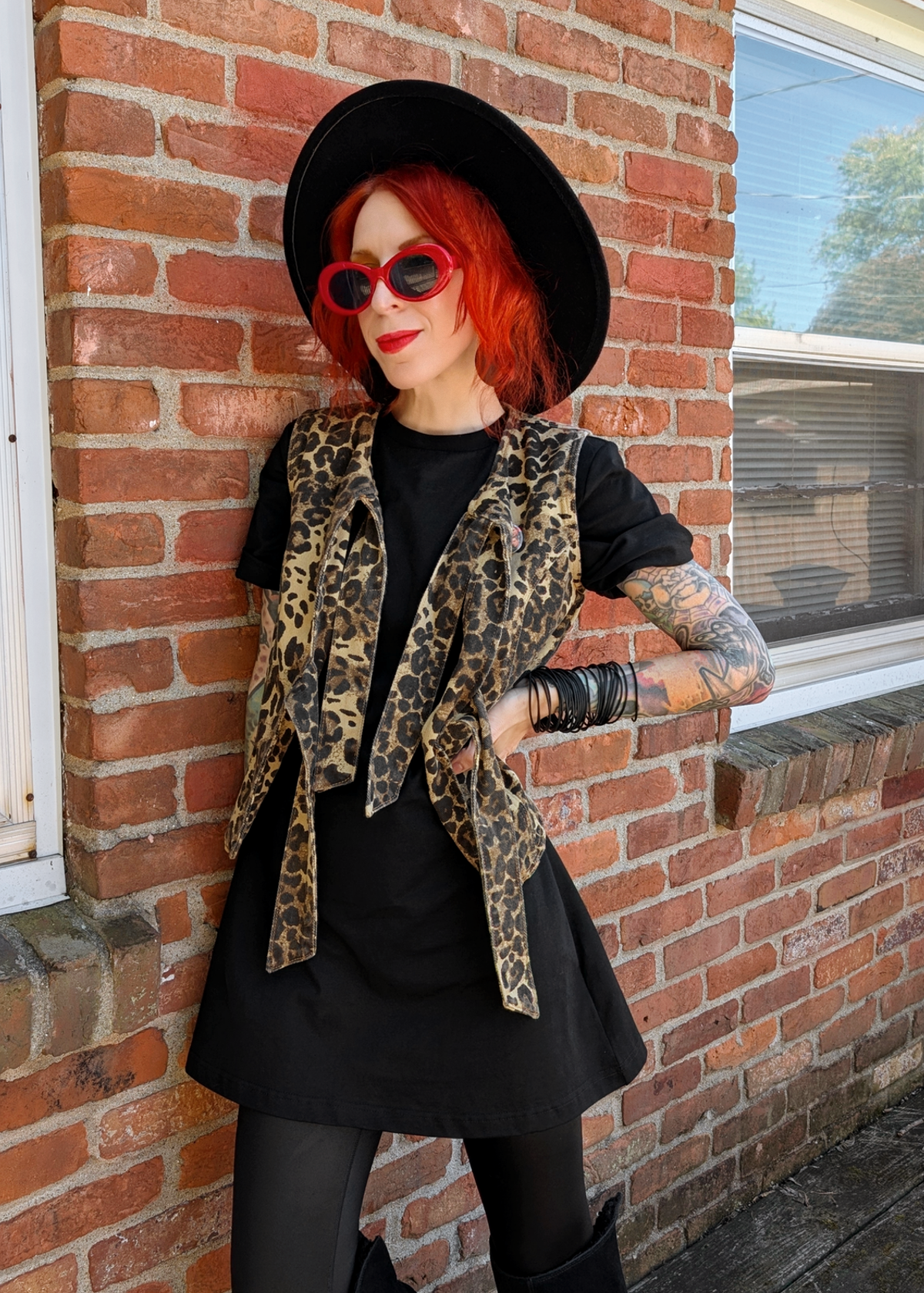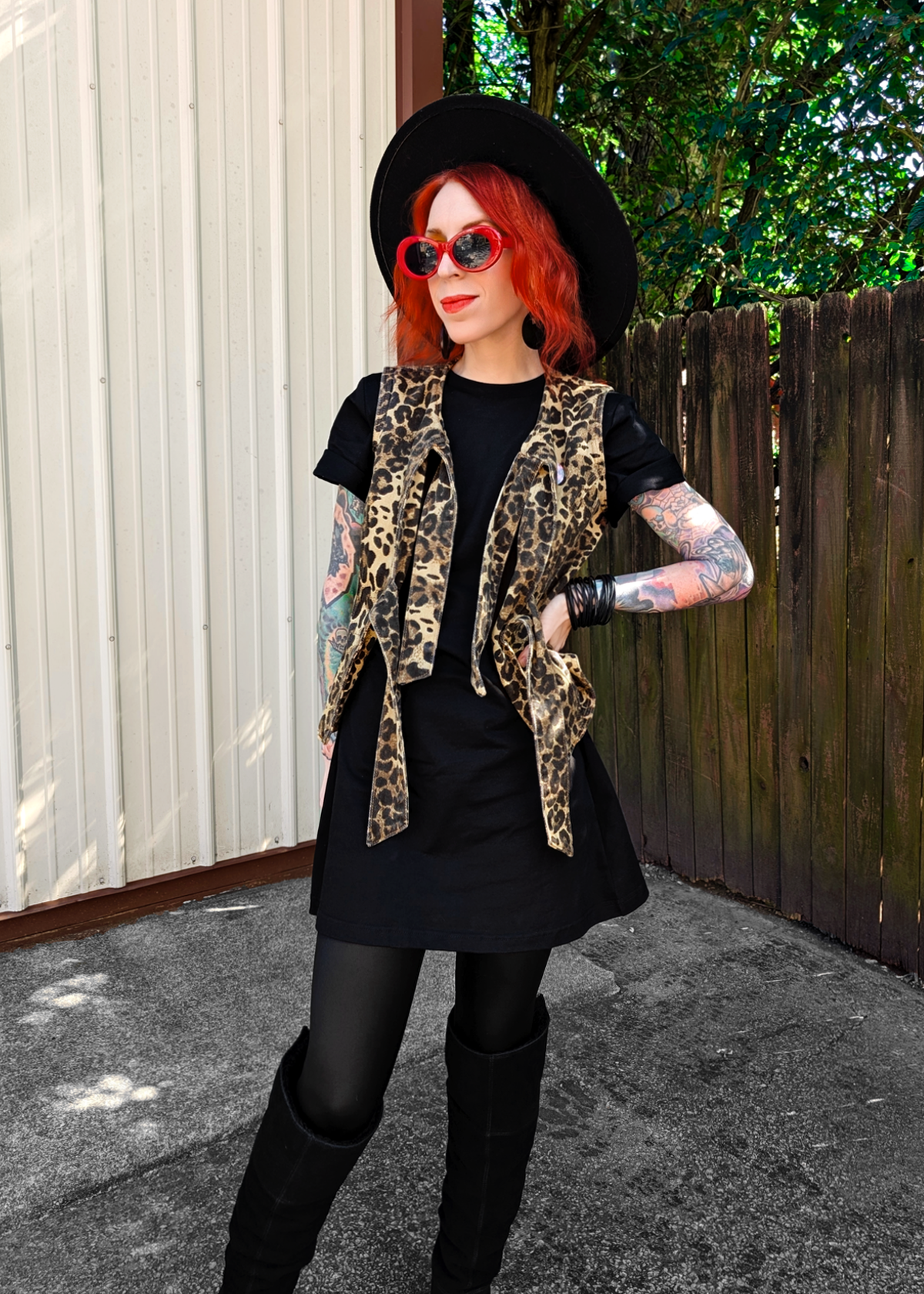 We'd pair this with some knee-high boots and jewelry for an easy weekend 'fit. My personal favorite way to wear it is with the sleeves rolled and the Leopard Denim Vest over top. Add some slinky black leggings and tall boots!