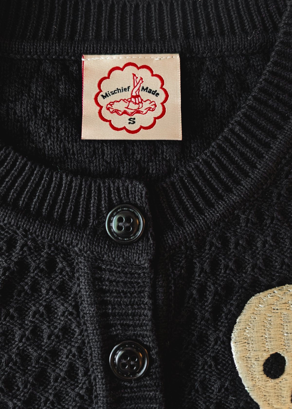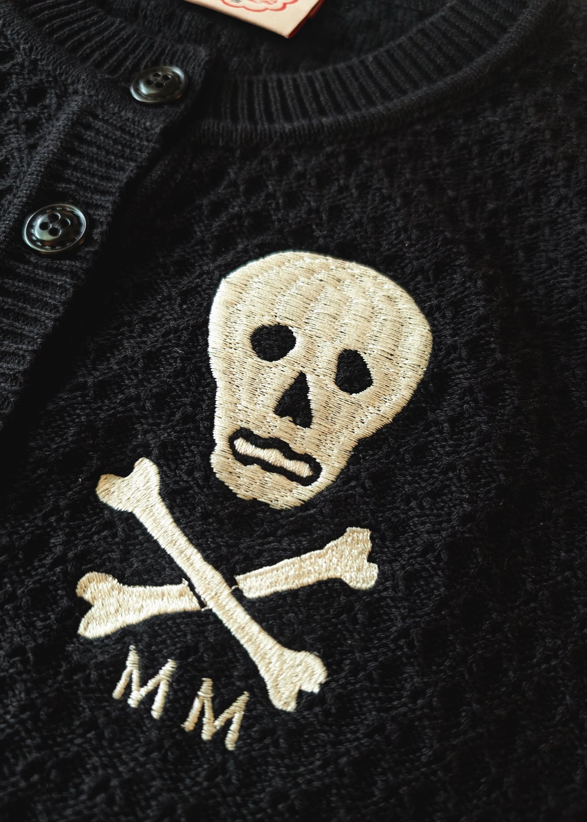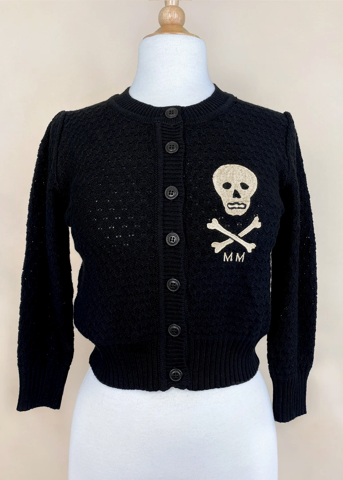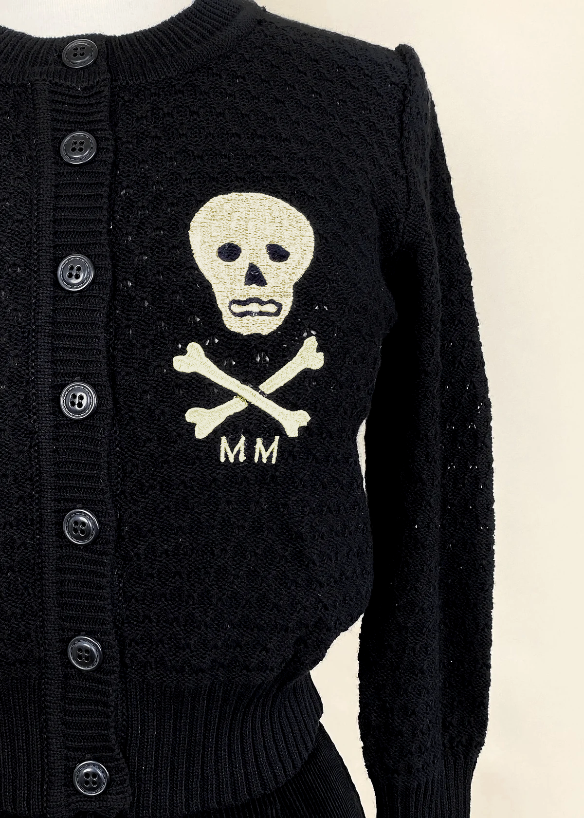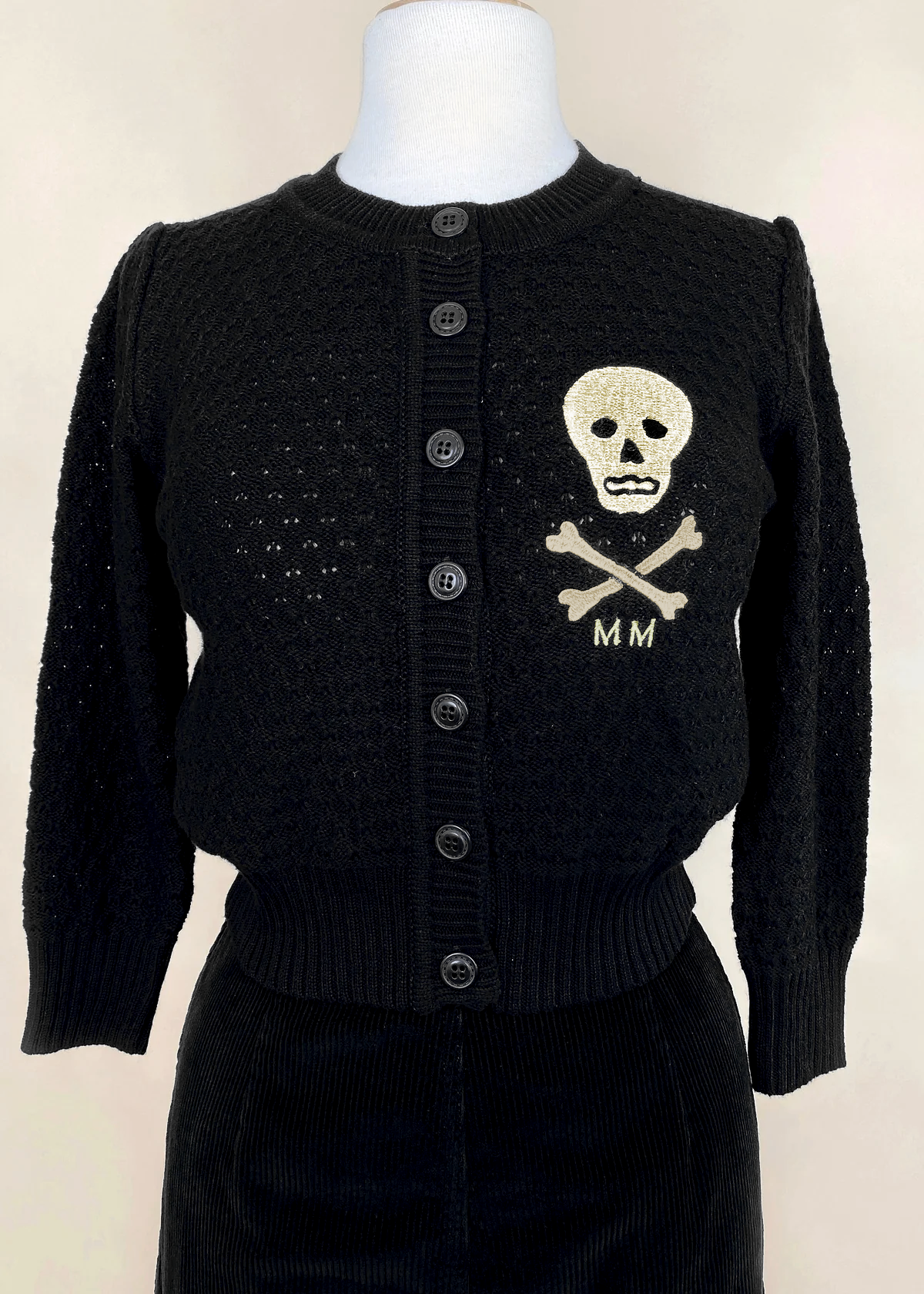Vintage-inspired fitted knit cardigan with a cropped fit and 3/4 length sleeves. Features a ribbed crew neckline and button down front. Ribbed cuffs and hem. Black colorway with yellow-ivory Skull and Crossbones and MM (Mischief Made) embroidery at front chest.