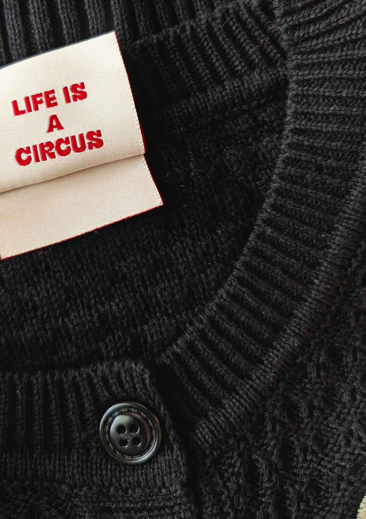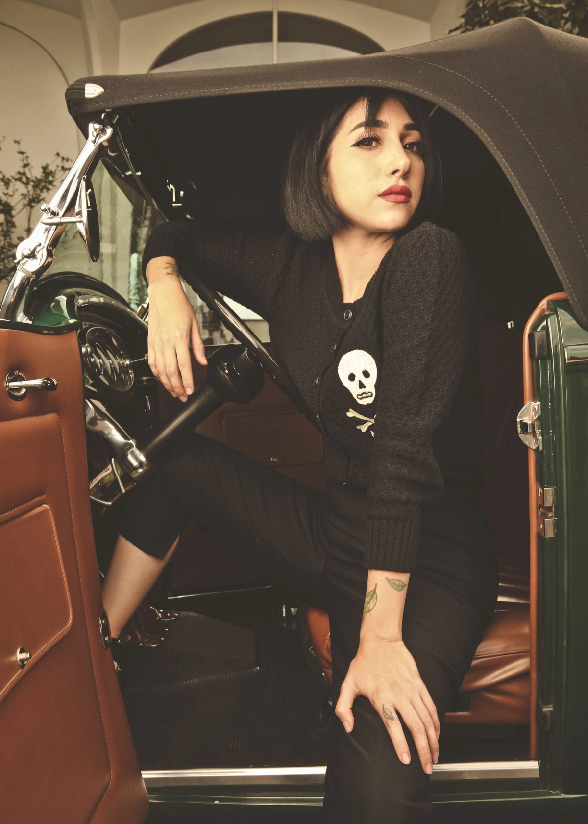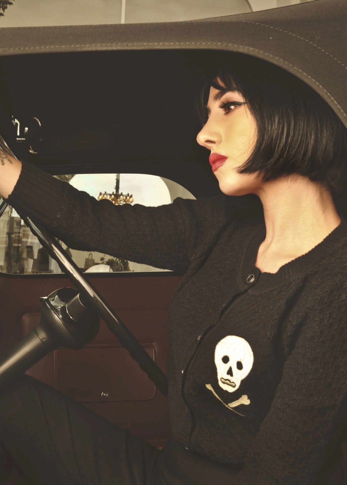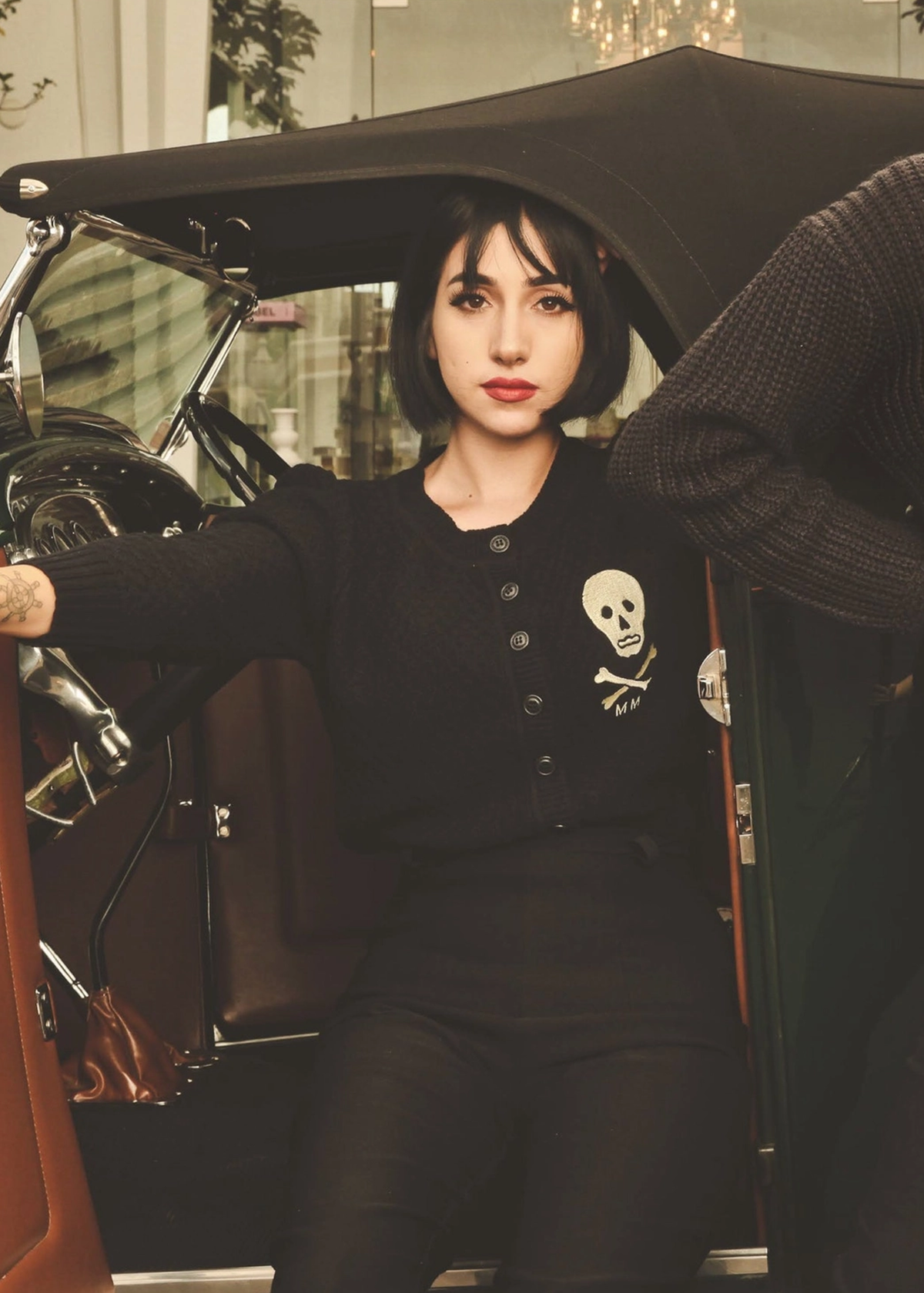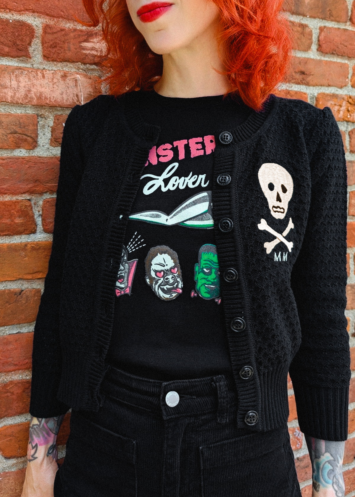 Vintage-inspired fitted knit cardigan with a cropped fit and 3/4 length sleeves. Features a ribbed crew neckline and button down front. Ribbed cuffs and hem. Black colorway with yellow-ivory Skull and Crossbones and MM (Mischief Made) embroidery at front chest.