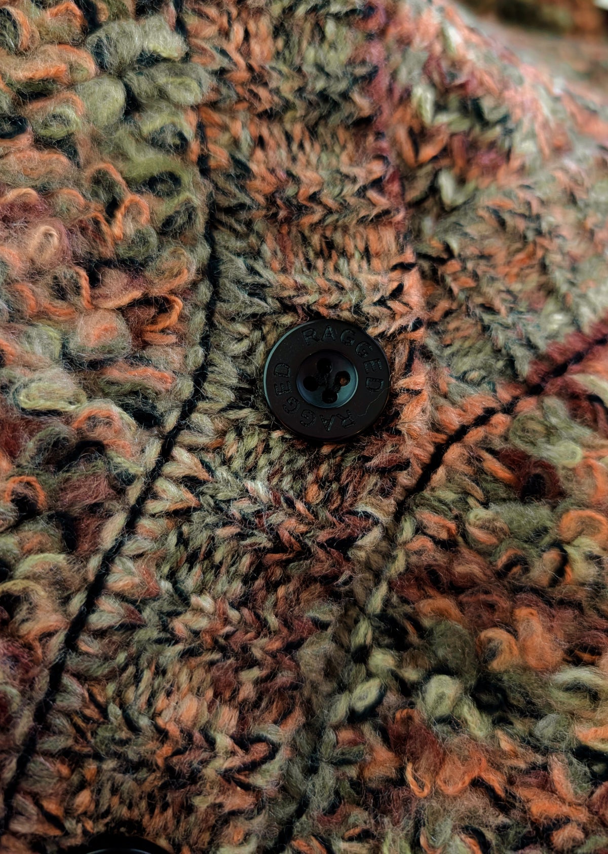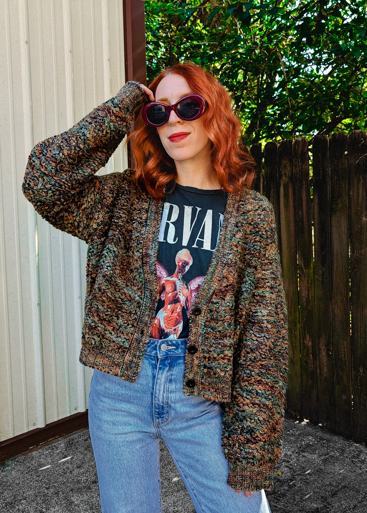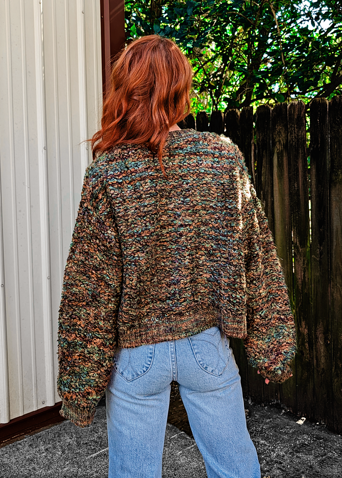 Super cool '90s inspired cardigan featuring a curly spacedye textured knit and an oversized, boxy cropped fit. V-neckline, long sleeves with ribbed cuffs, and a three-button closure at front. Grungy green, brown, orange and black colorway. Perfect for throwing on over a tee and jeans!