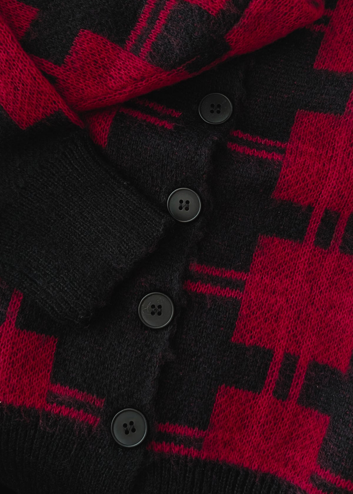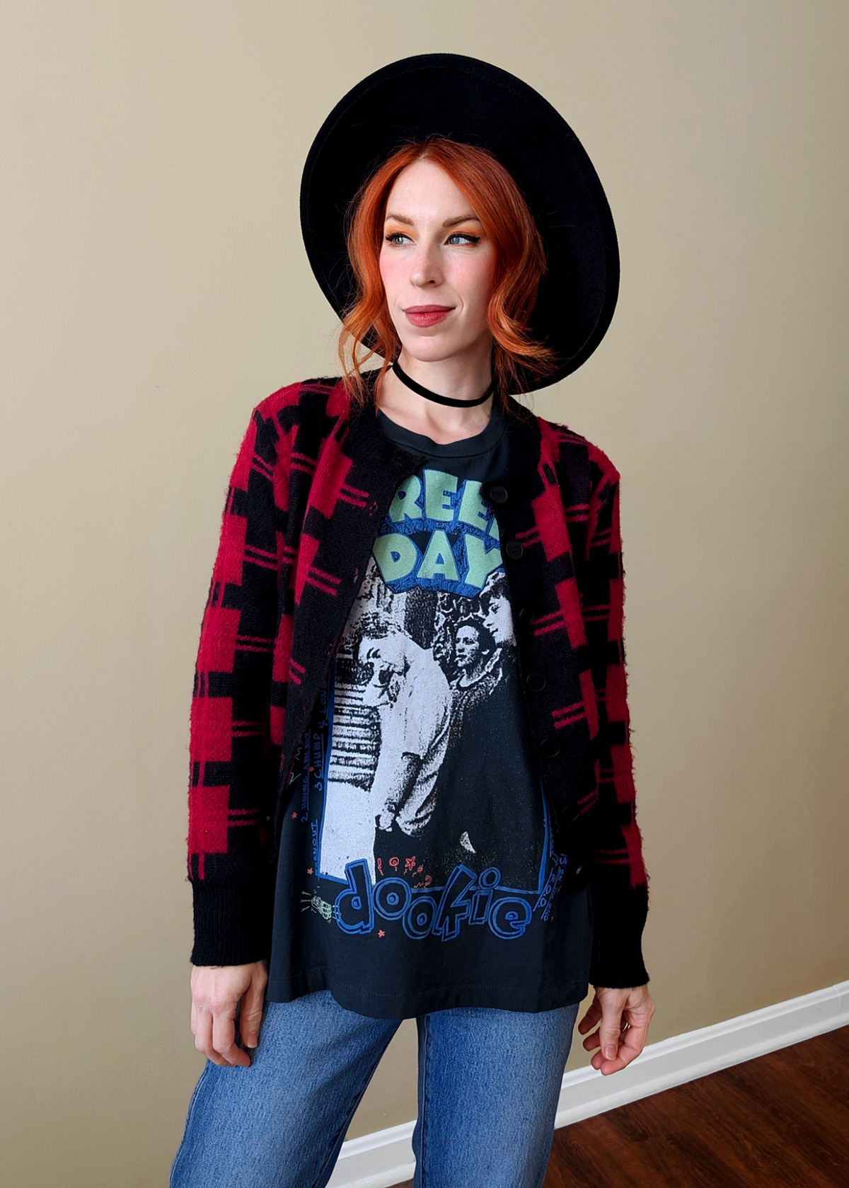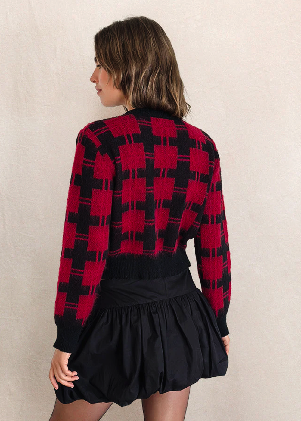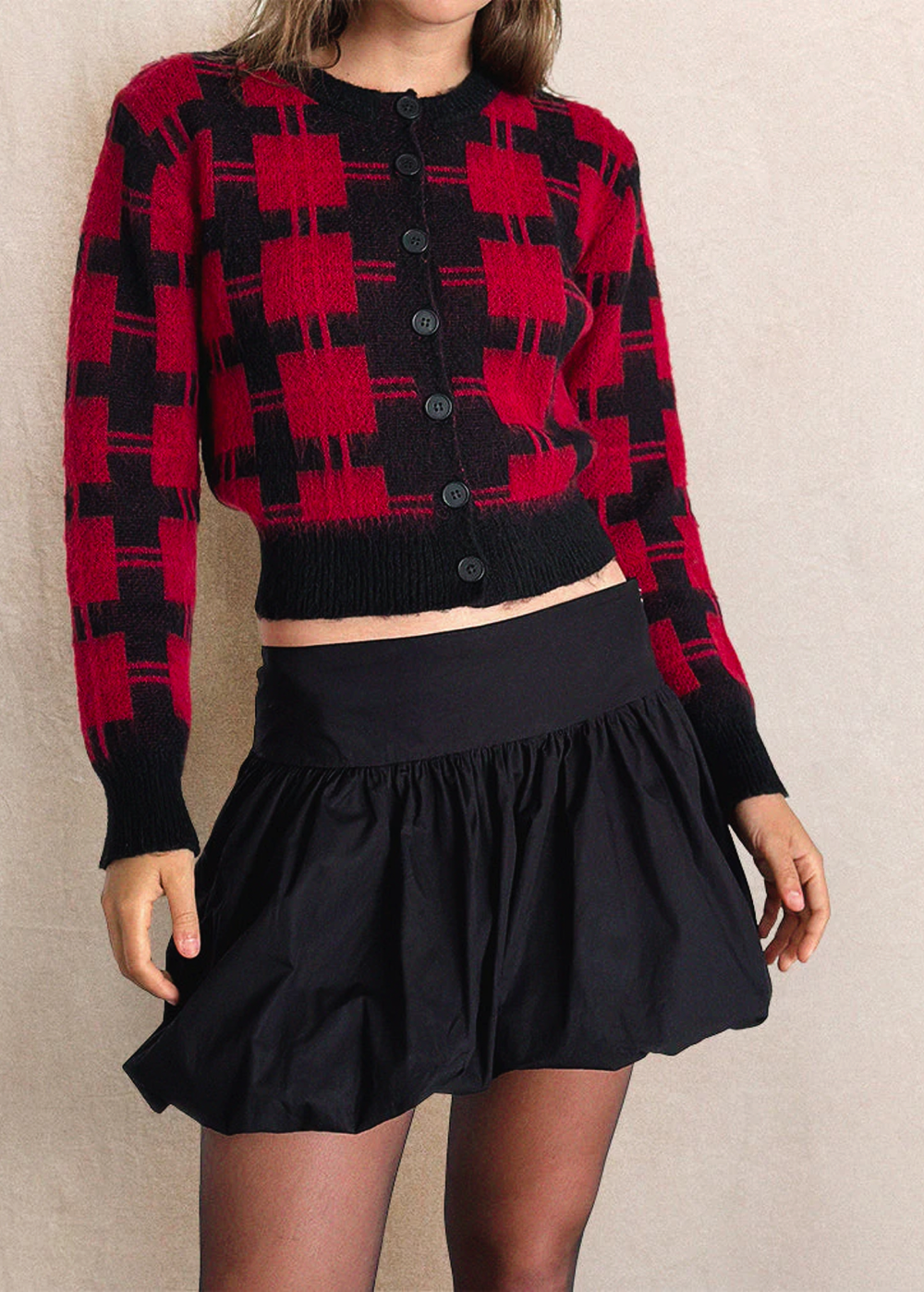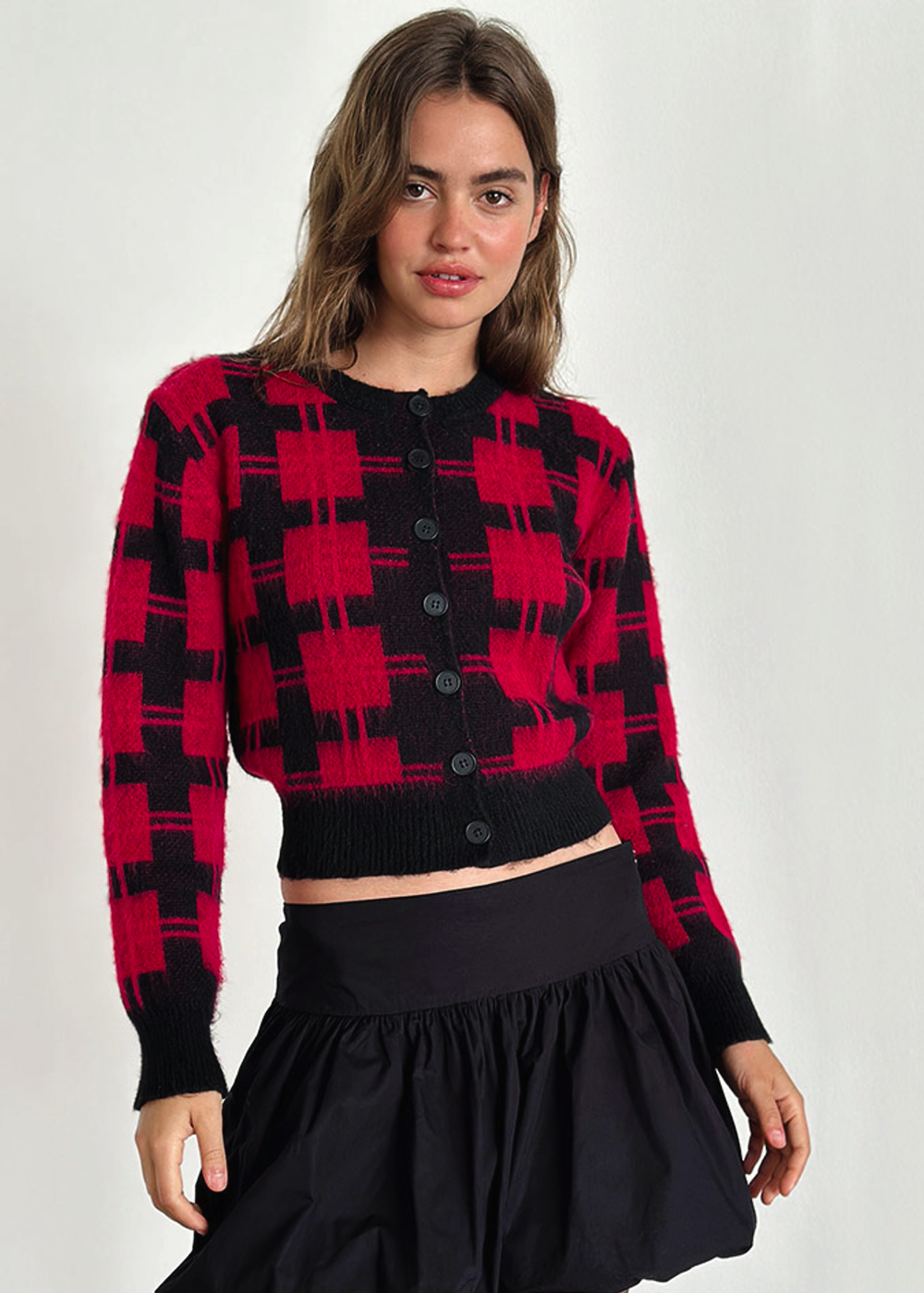 Kinda punky, kinda preppy! Soft and cozy vintage-inspired brushed fuzzy knit cardigan featuring a red and black check pattern. Features a crew neckline, button down front, and ribbed detailing along collar, cuffs, and hem. Fitted style with a hint of slouch to it.