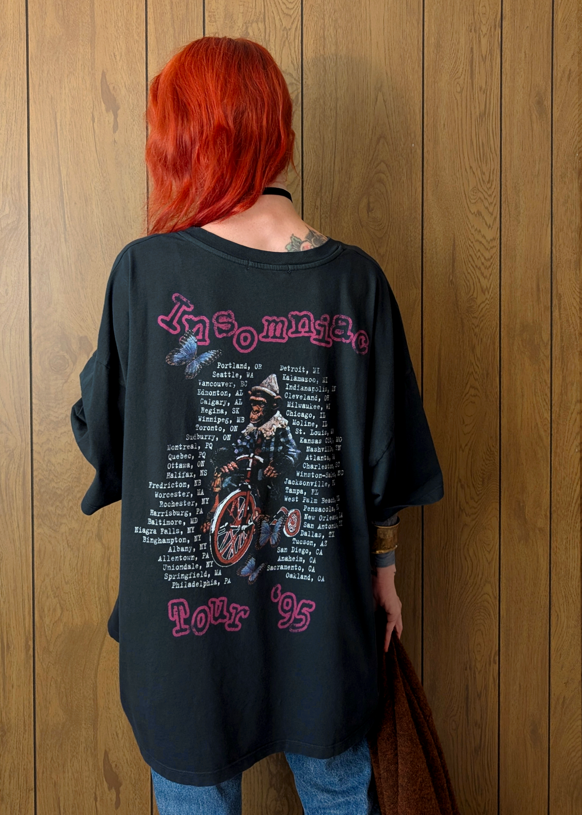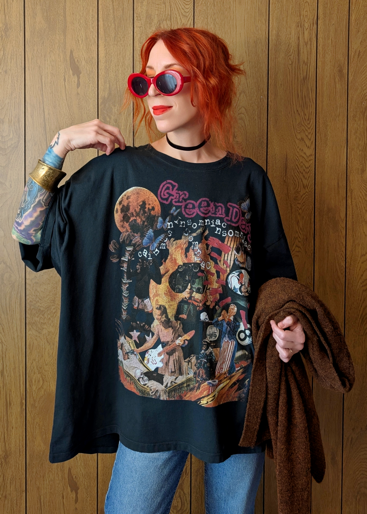 Super cool Green Day One Size tee featuring album artwork from their heavier, hardcore punk fourth studio album, "Insomniac." Designed with Daydreamer's rendition of the album's original cover art with its corresponding tour stops listed on the back.