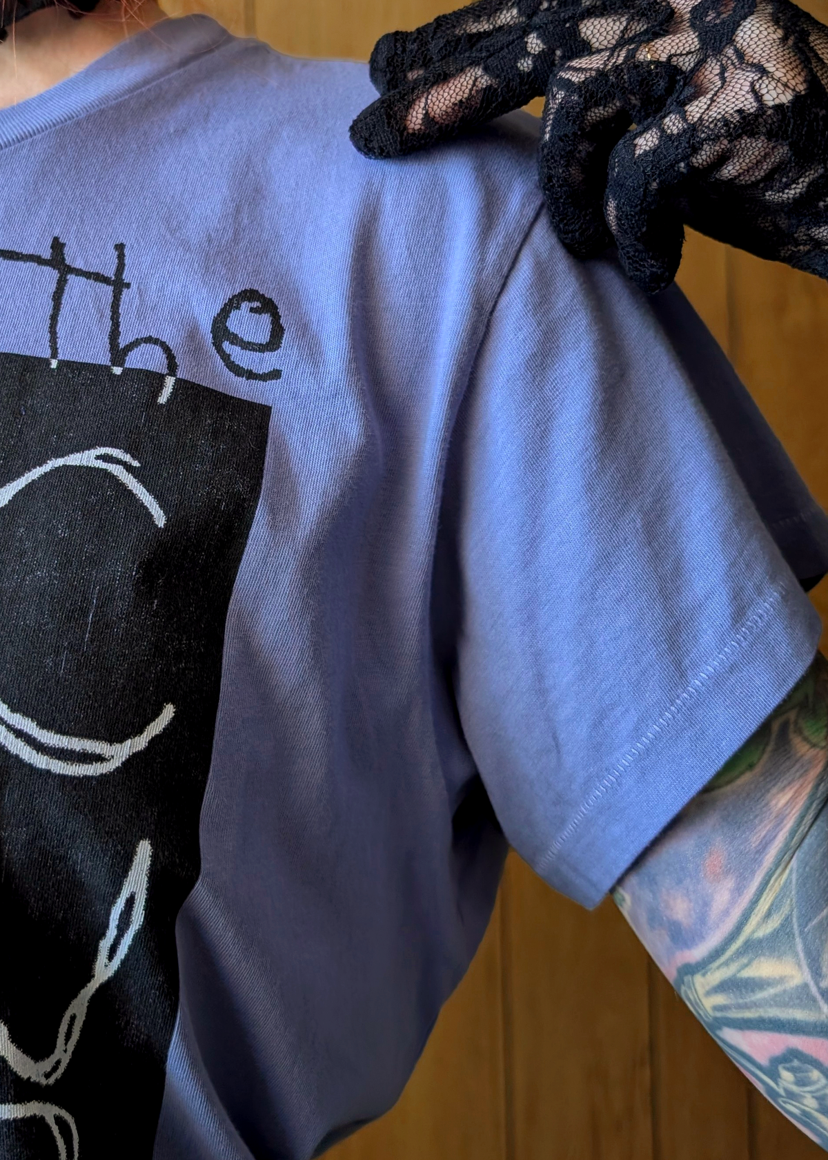 This killer Cure tee features front and back graphics from their 2000 album Bloodflowers. This baby is Daydreamer's Girlfriend fit tee, meant to fit "just right," with short sleeves and a not-so-cropped length that's perfect for high rise pants. Arctic Haze (periwinkle) colorway.