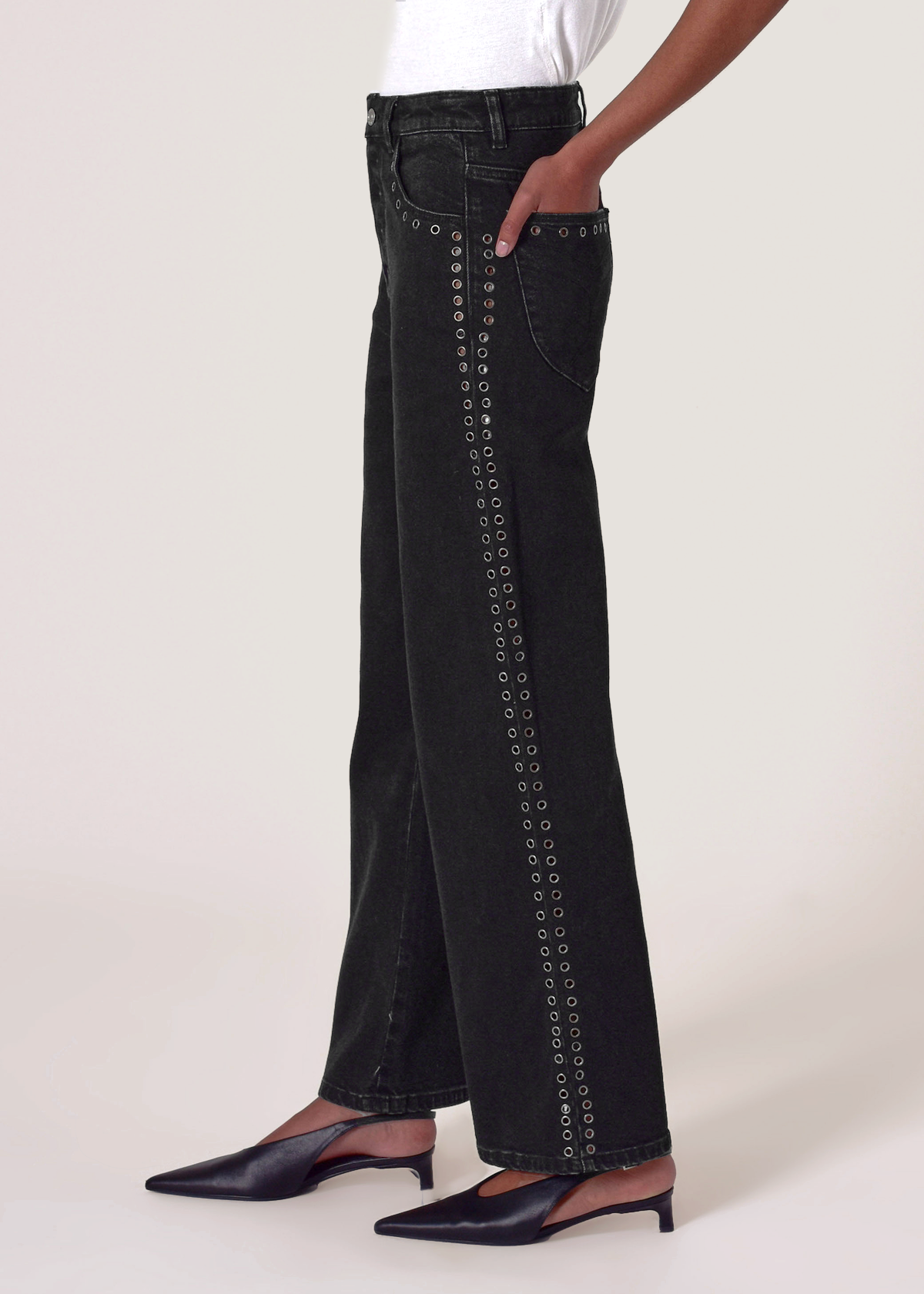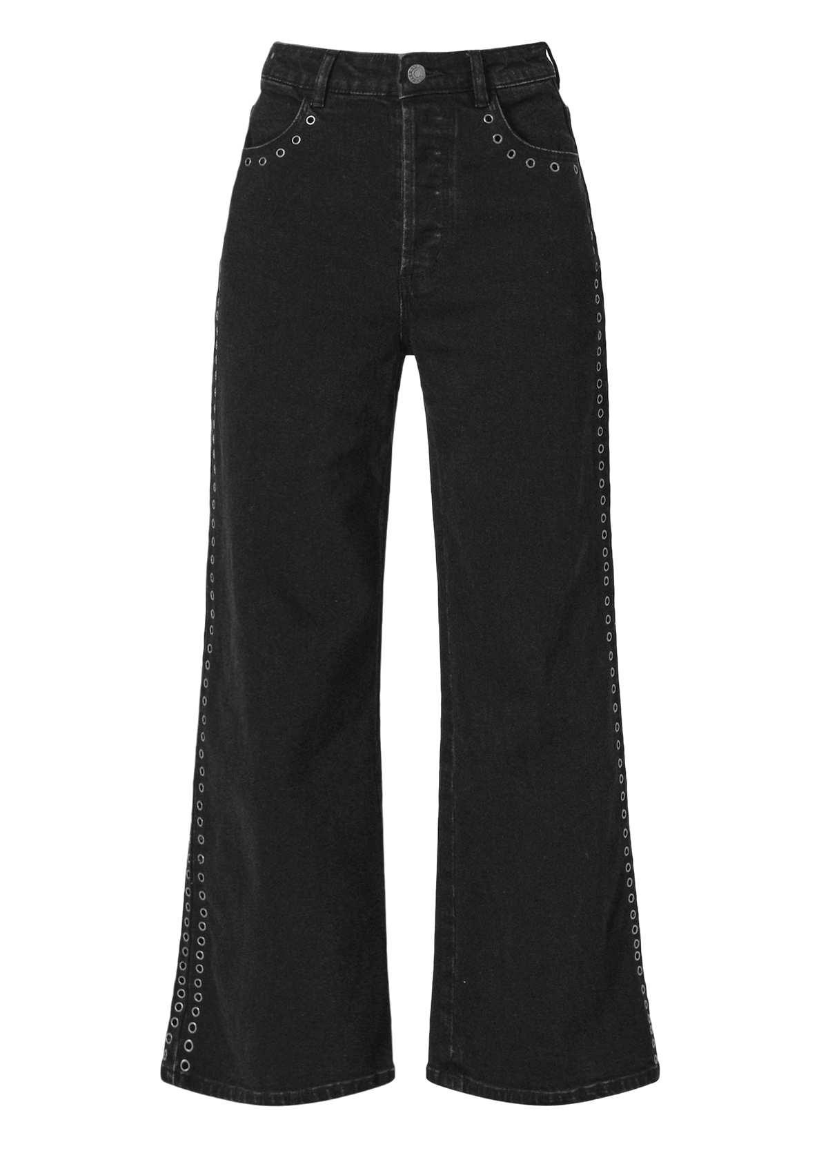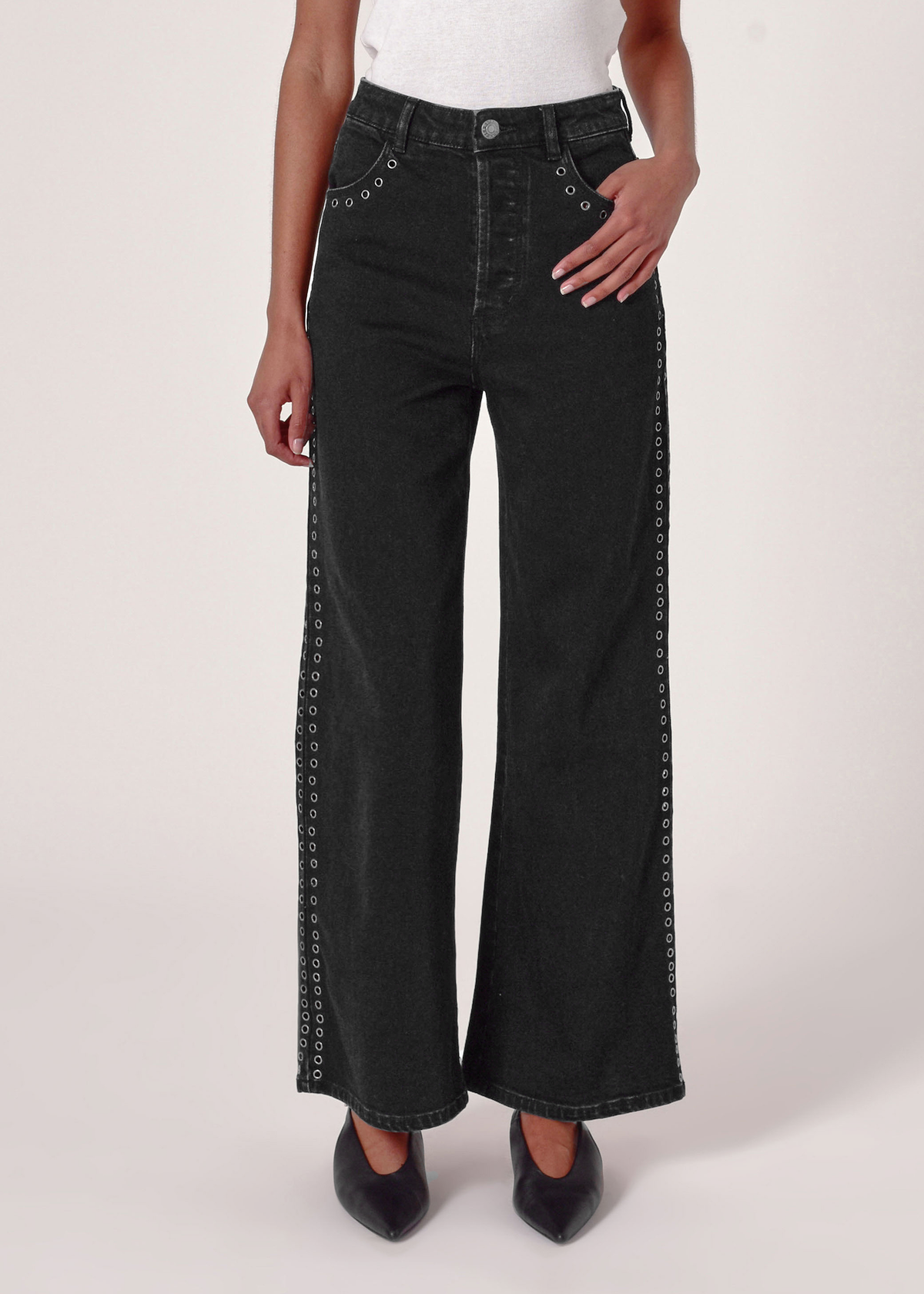 Crafted with silver eyelet details along the front and back pockets, as well as down the outer leg of the pants, these jeans feature an ultra high waist and wide sailor flare leg in an ankle length. Classic 5-button fly. Rigid denim with a hint of stretch for comfort. Washed faded black vintage wash.