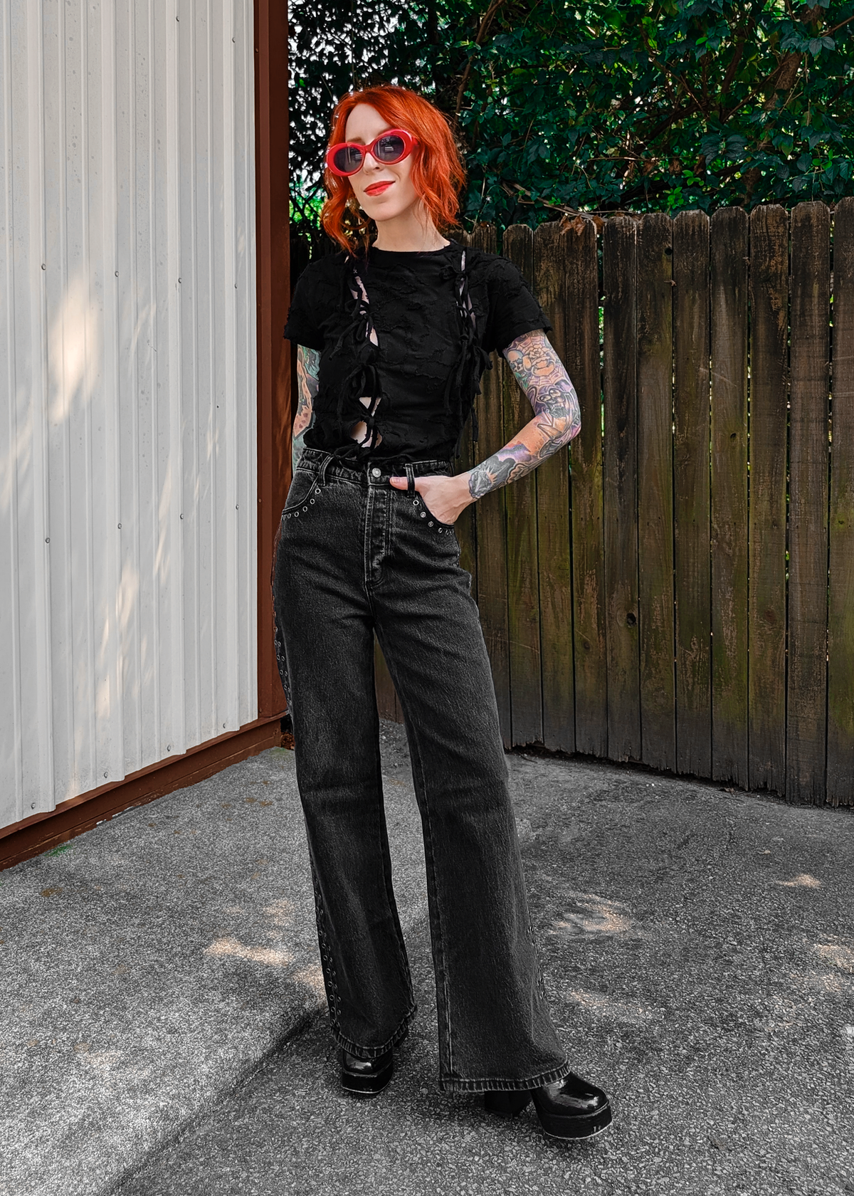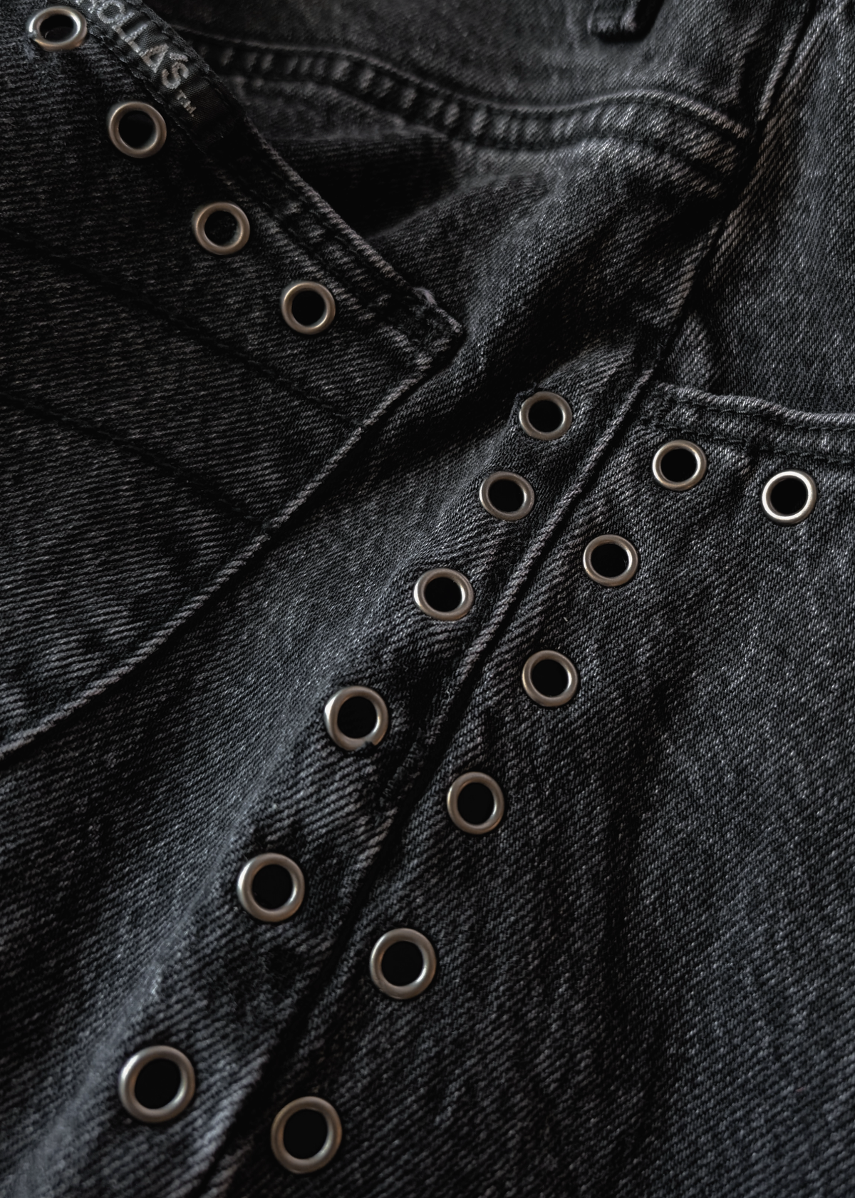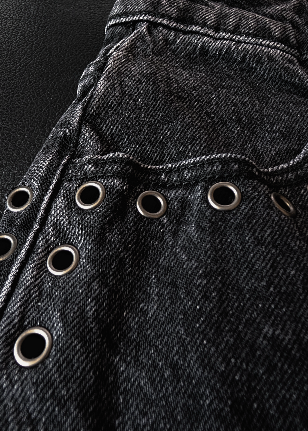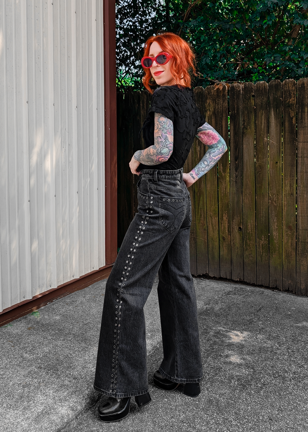Crafted with silver eyelet details along the front and back pockets, as well as down the outer leg of the pants, these jeans feature an ultra high waist and wide sailor flare leg in an ankle length. Classic 5-button fly. Rigid denim with a hint of stretch for comfort. Washed faded black vintage wash.