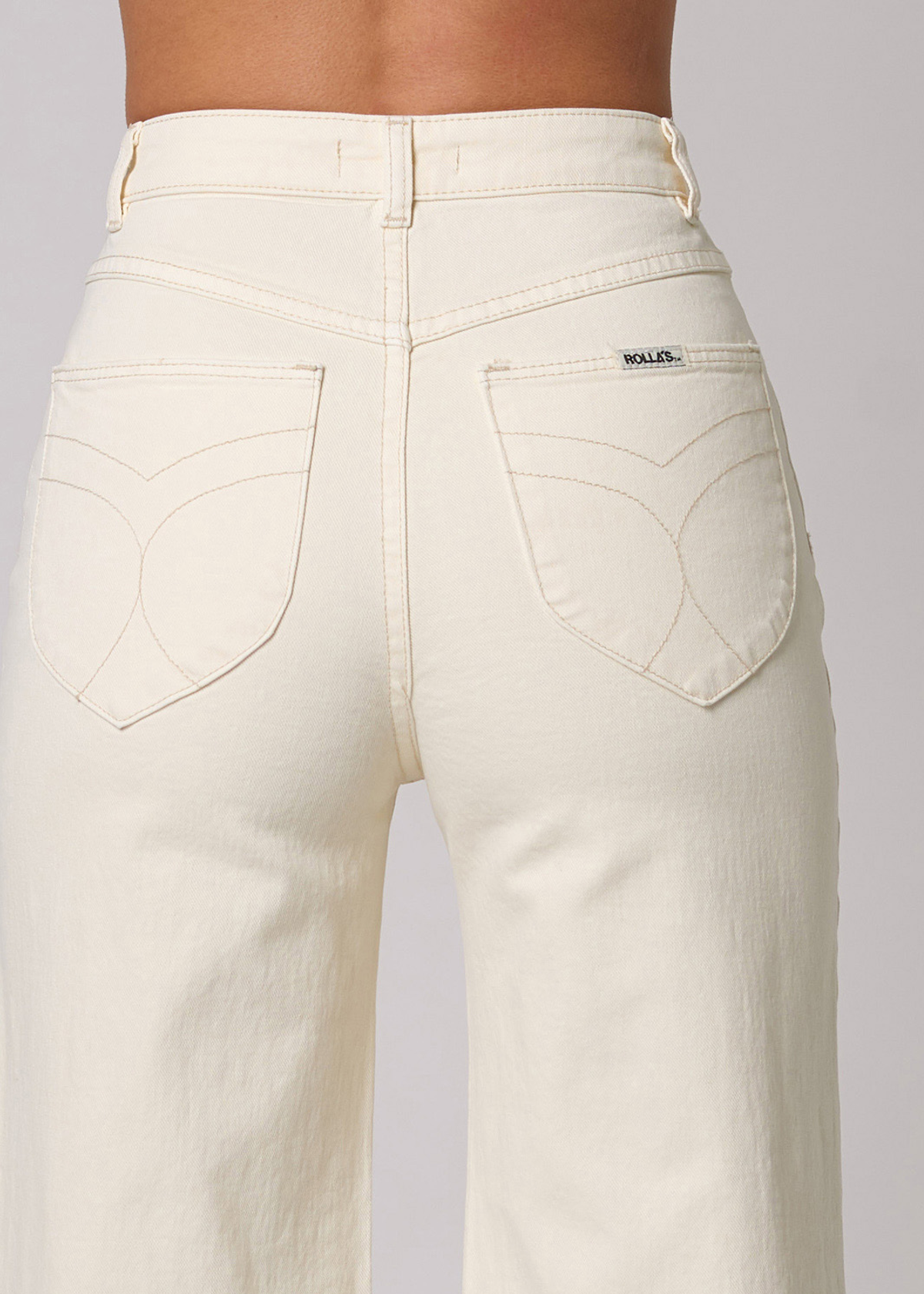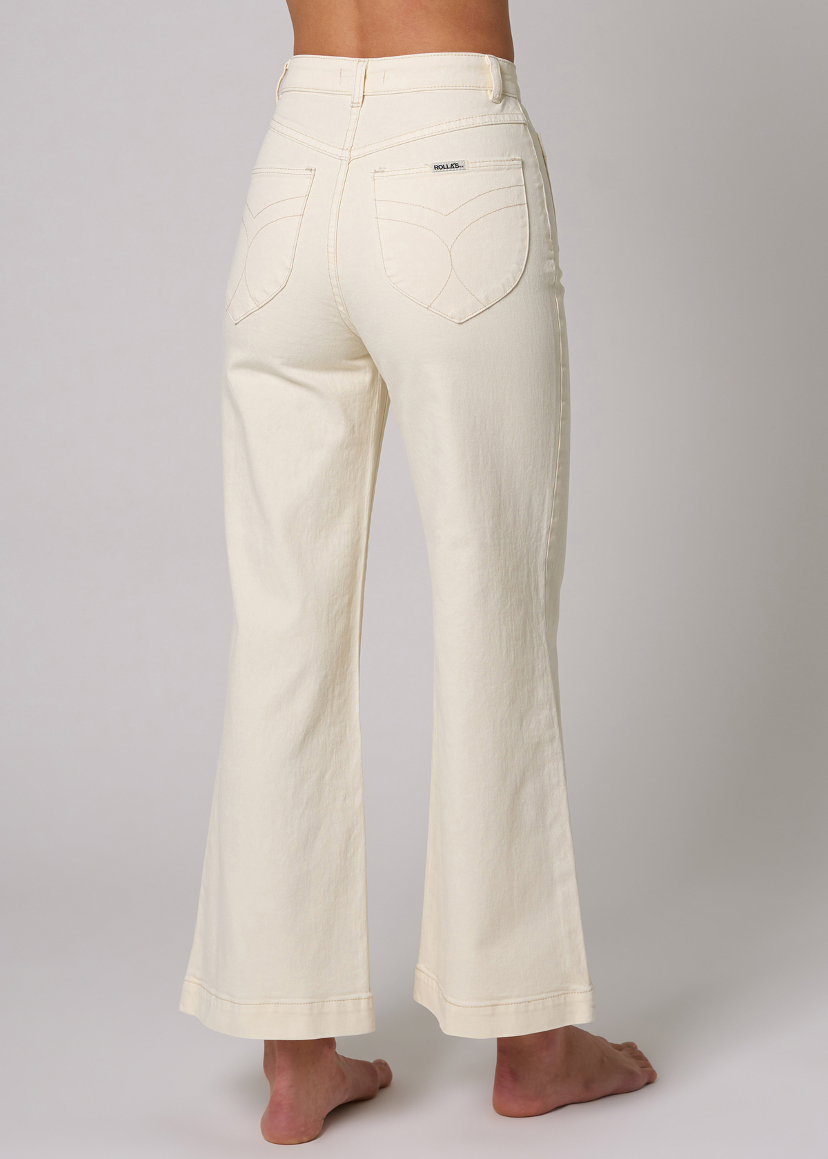 A buttercream dream! The Sailor Jean is a super high-rise, wide sailor leg jean with an ankle length (28" inseam). Made with a stretch drill denim. Two patch pockets at front and signature tulip-shaped back pockets with stitching. A hint of elastane for stretch and comfort! Designed to be worn tight and will soften with wear. Buttercream is a cream colorway with a hint of pale yellow.