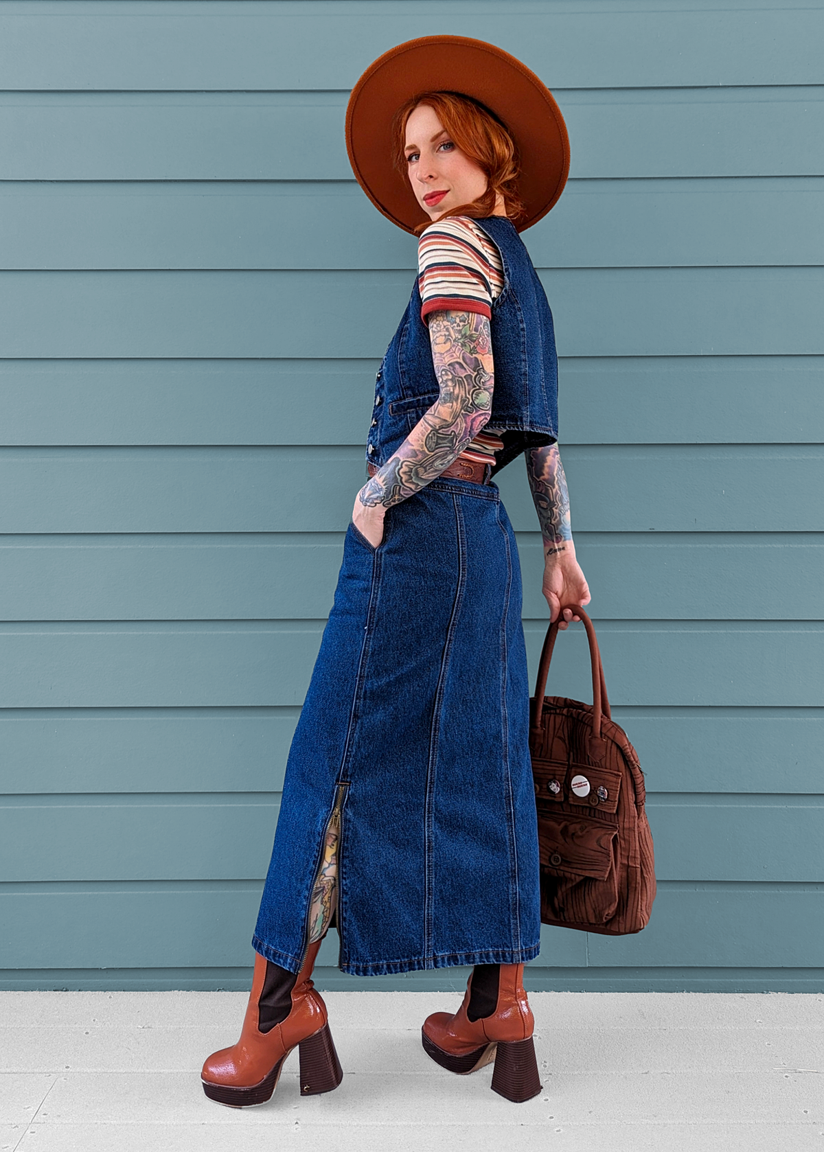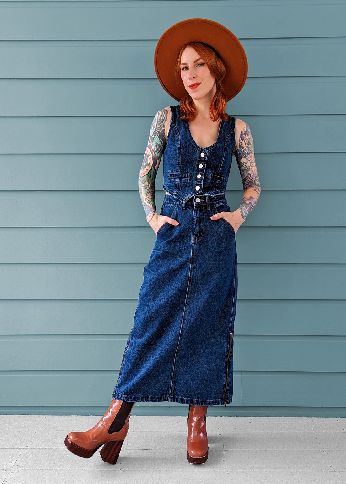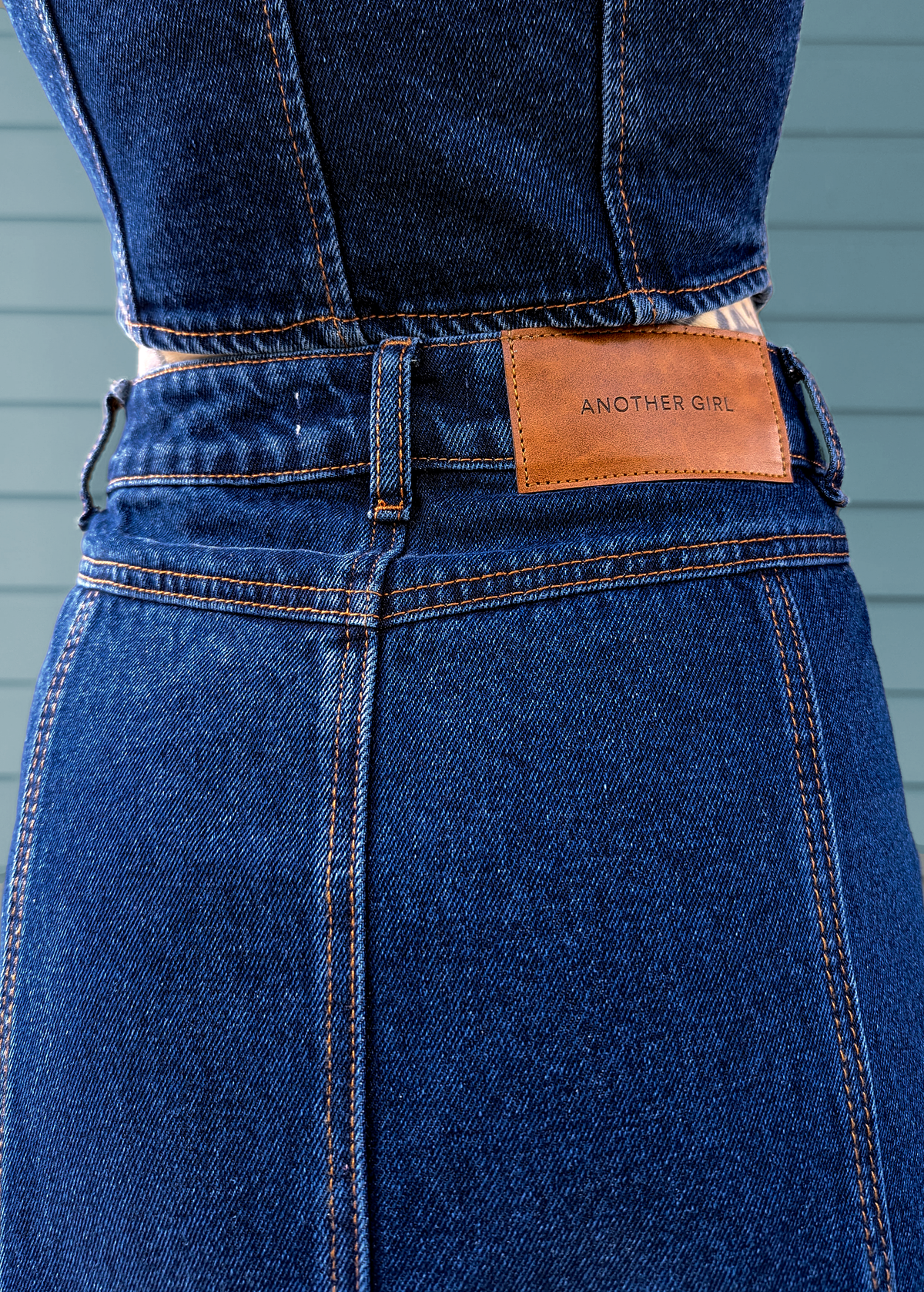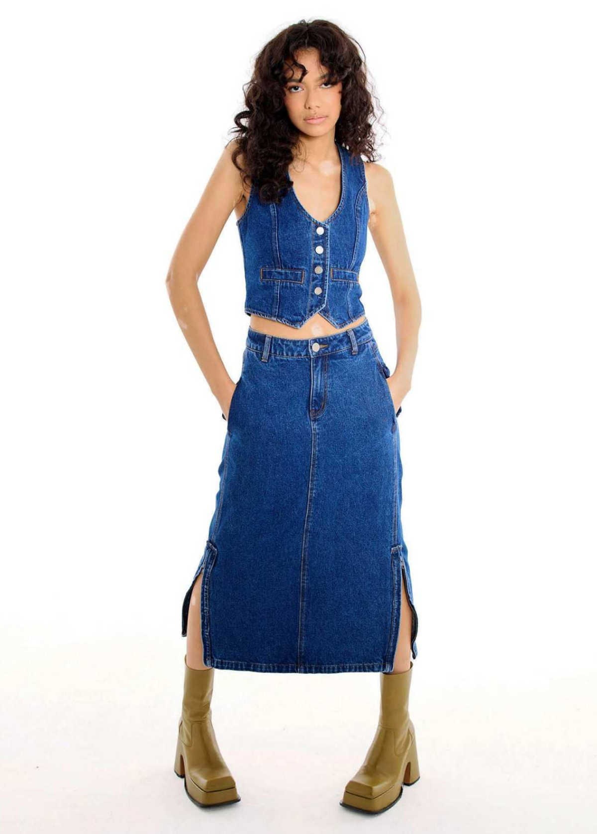 Classic dark blue indigo denim midi skirt featuring a high waist with button front closure and belt loops. Deep pockets at sides. Side slits at the bottom with zipper closures, so you can adjust the slit however ya like! Fitted style. Made of soft organic cotton denim.