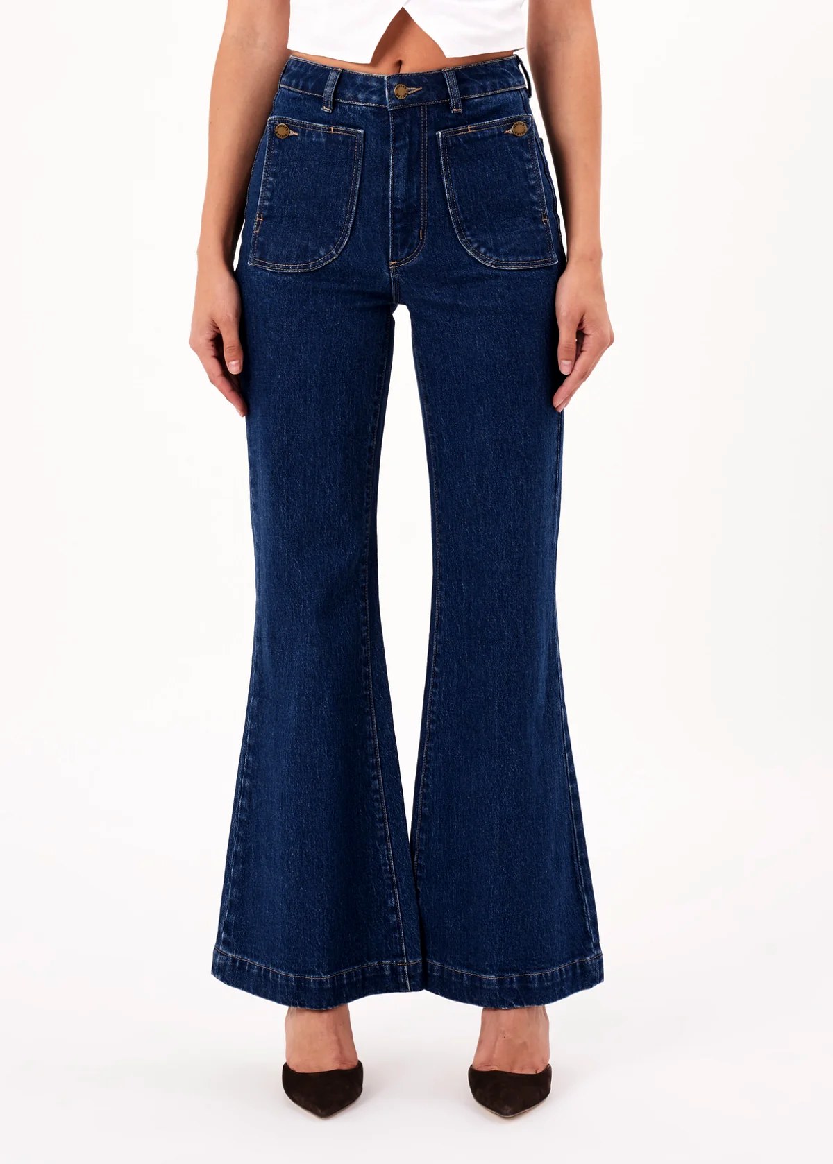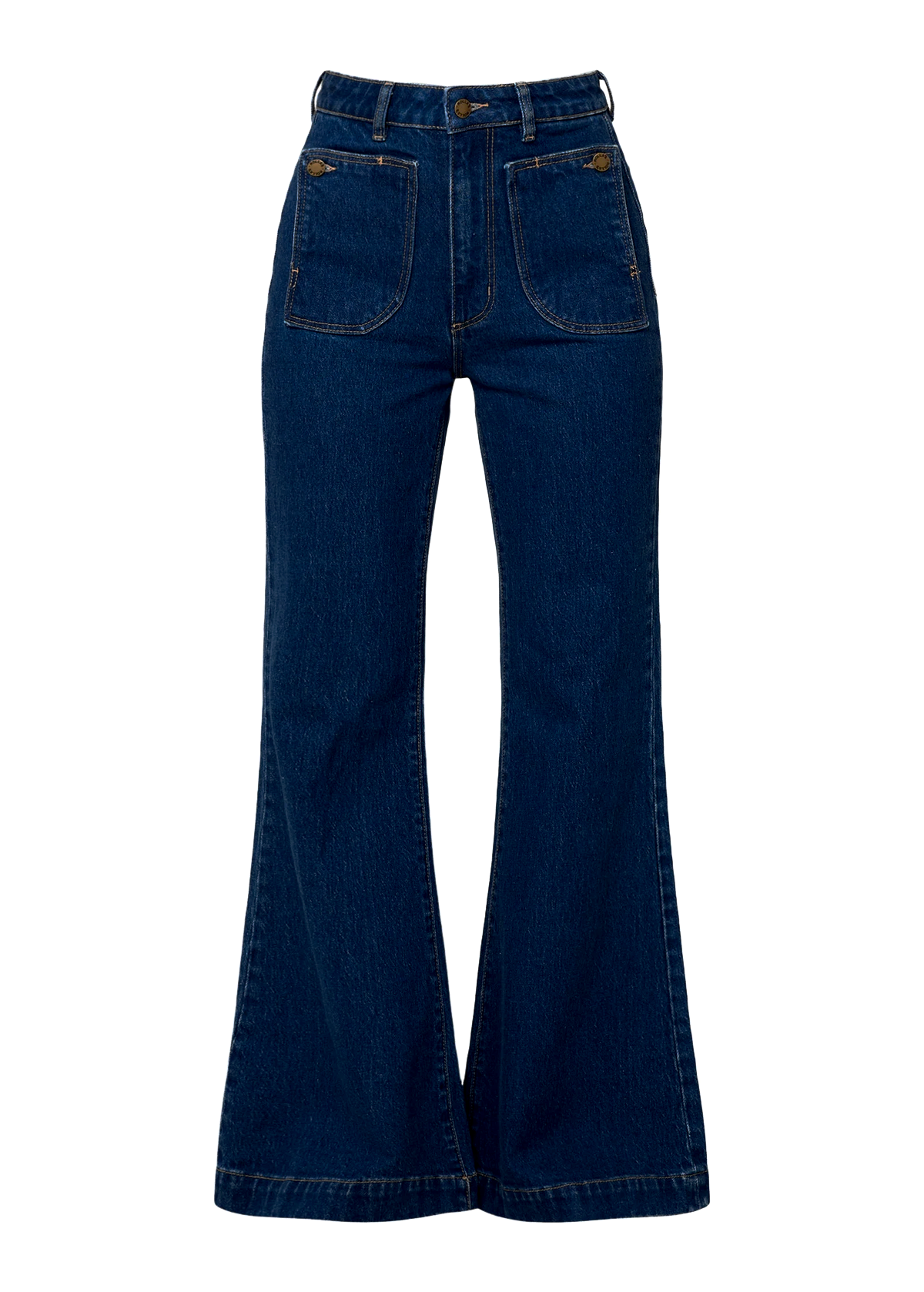 Rigid dark blue denim flares featuring an ultra flattering fit, high waist, slim fit through the thigh and major flare leg opening. Check out those killer front flap pockets with button detailing! Specially angled and shaped pockets in the back for a truly peachy looking butt. Made of rigid cotton denim with a hint of stretch for comfort. Classic dark blue denim wash! Approx. a 32" inseam.