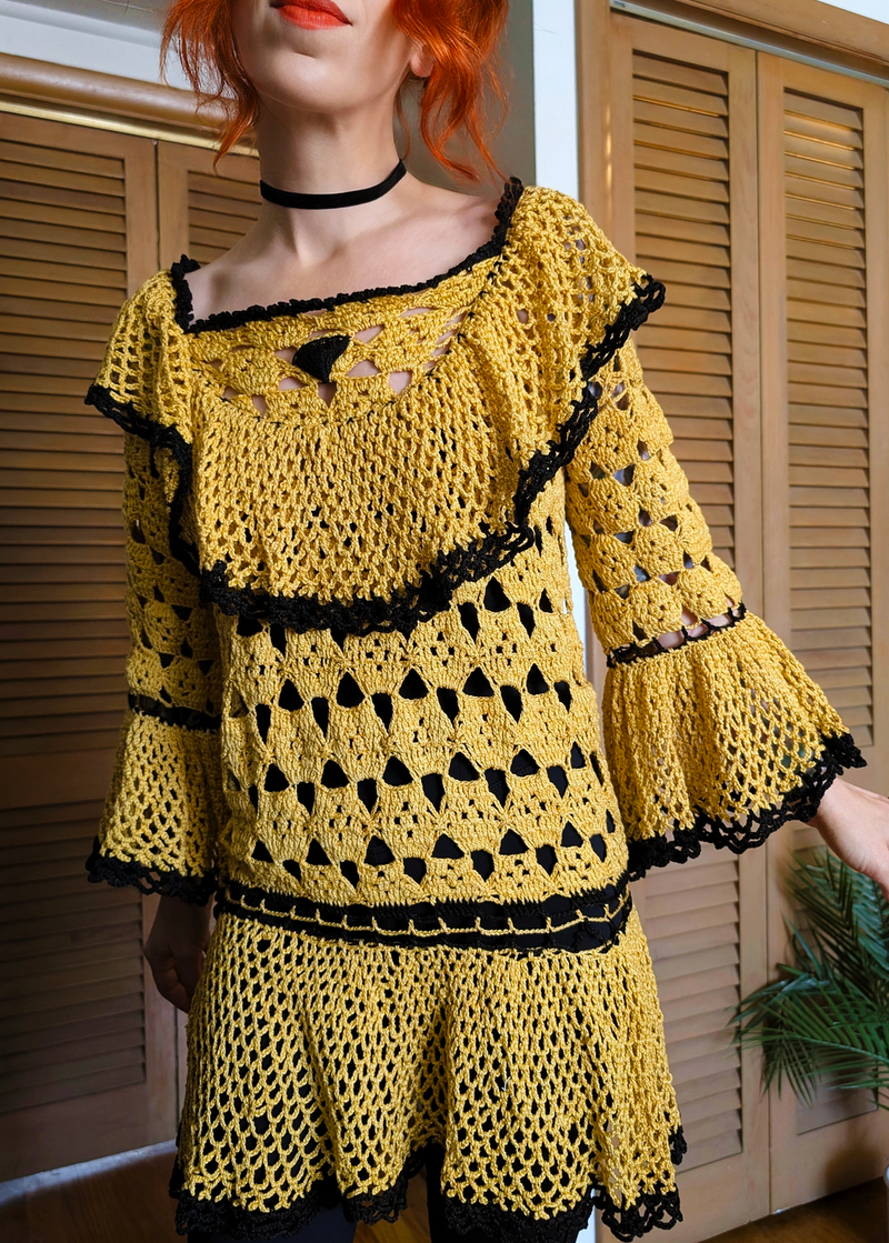 Vintage '70s Goldenrod Crochet Bell Sleeve Tunic Dress