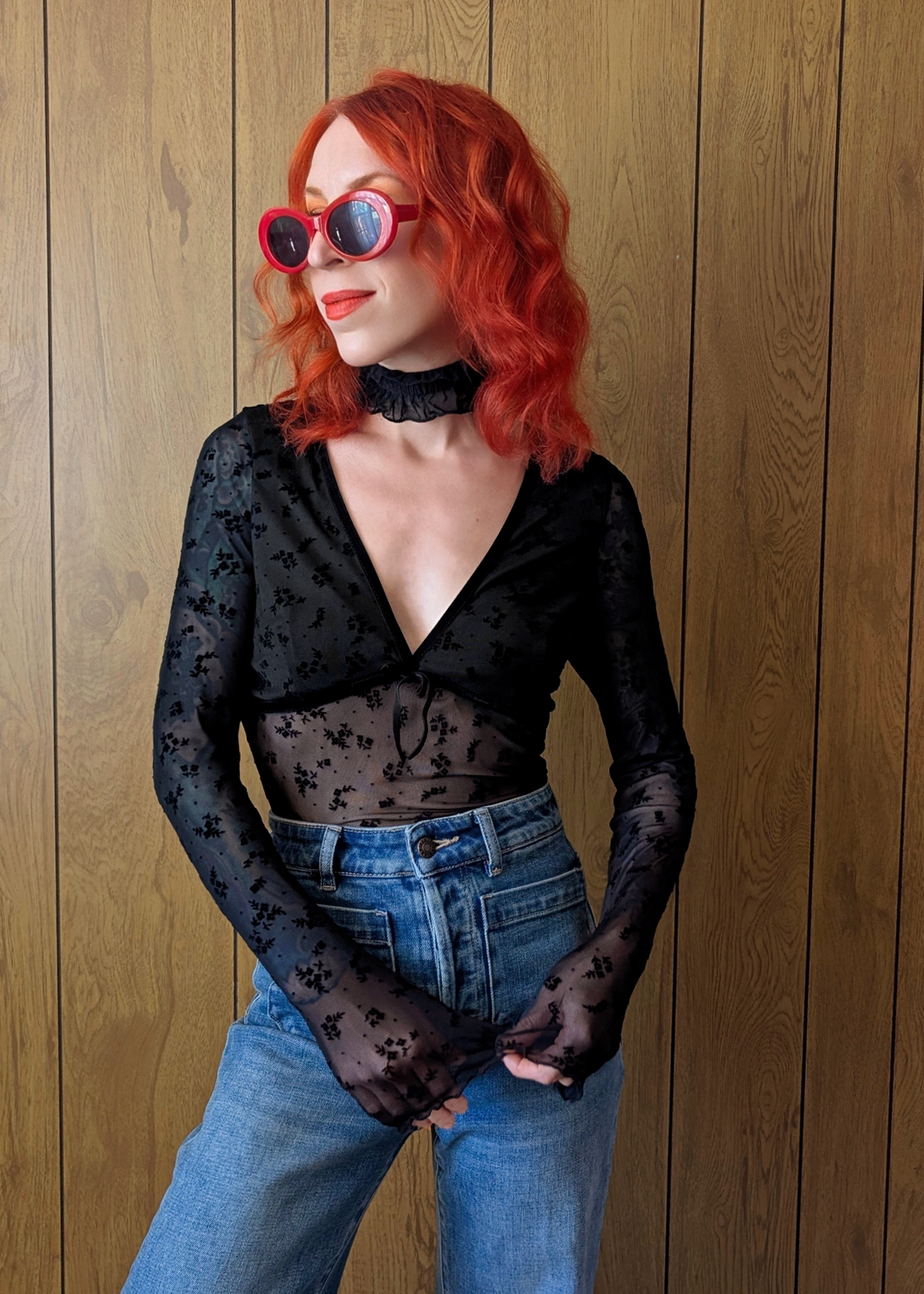 Romantic '90s-inspired slinky mesh top featuring a plunging v-neckline and empire seam with black velvet trim and bow. Lined around the front bust, sheer through the rest of the body. Long sleeves with lettuce trim along cuffs and hem of top. Black colorway with velvet flocked ditsy floral pattern.