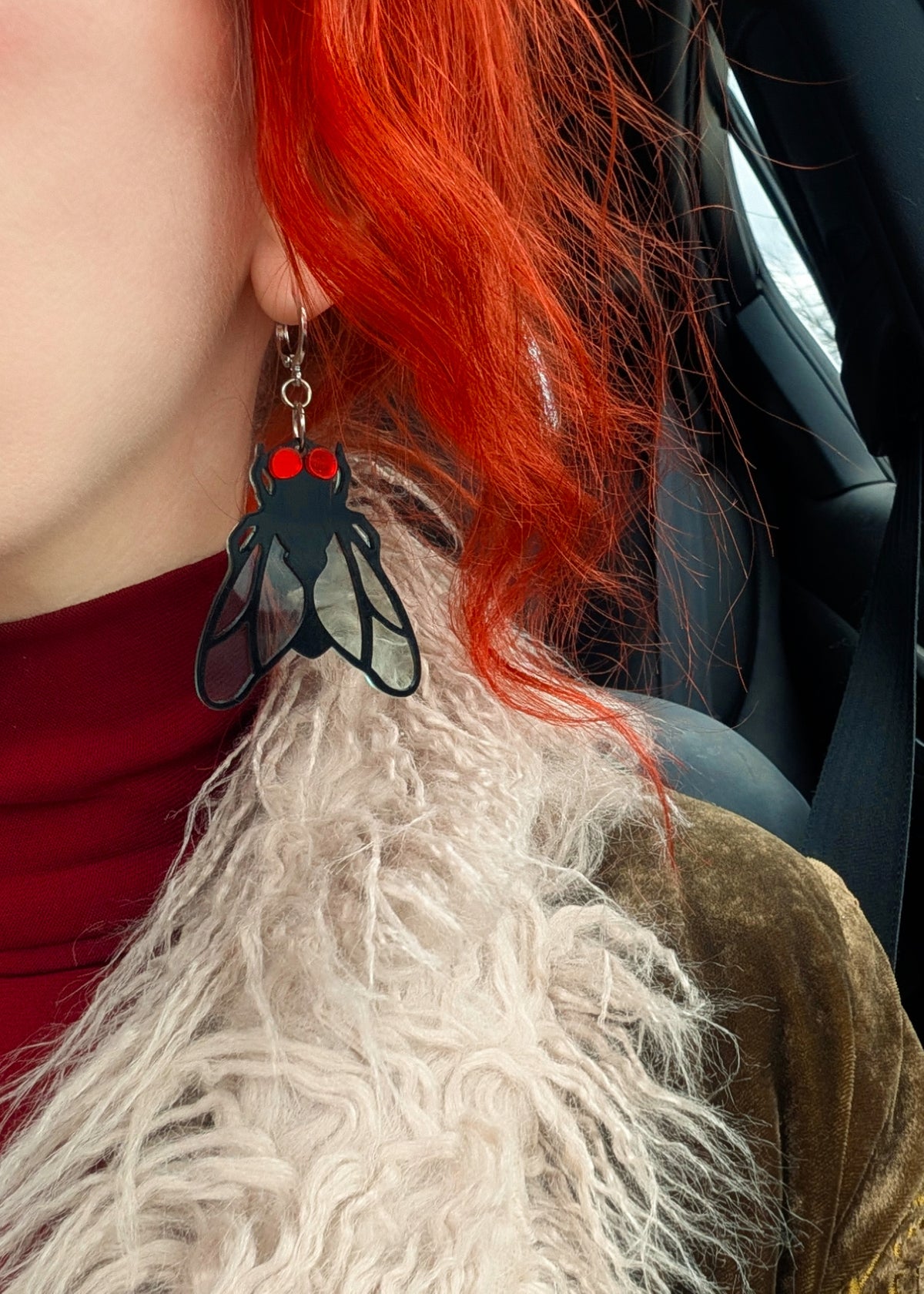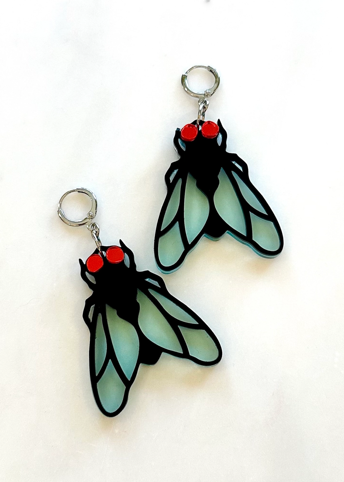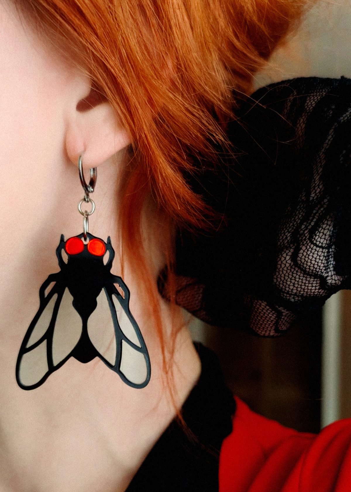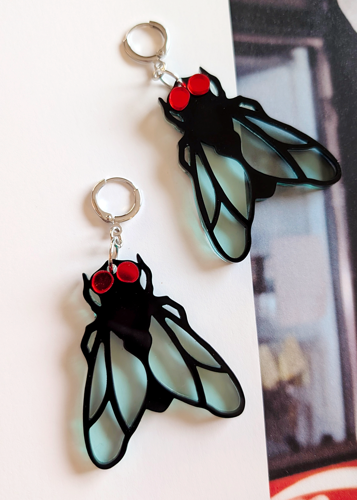 Super cool laser cut acrylic fly earrings with transparent green wings and red mirror eyes. Measure 2" in length and 1.7" wide. Super lightweight! We'd wear these with an all-black outfit and hair up in a messy bun.