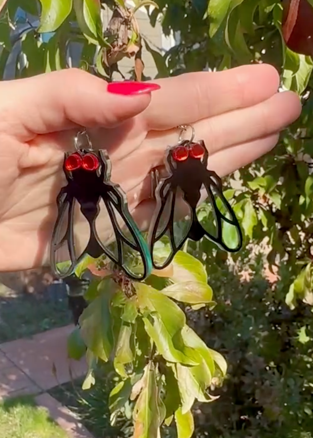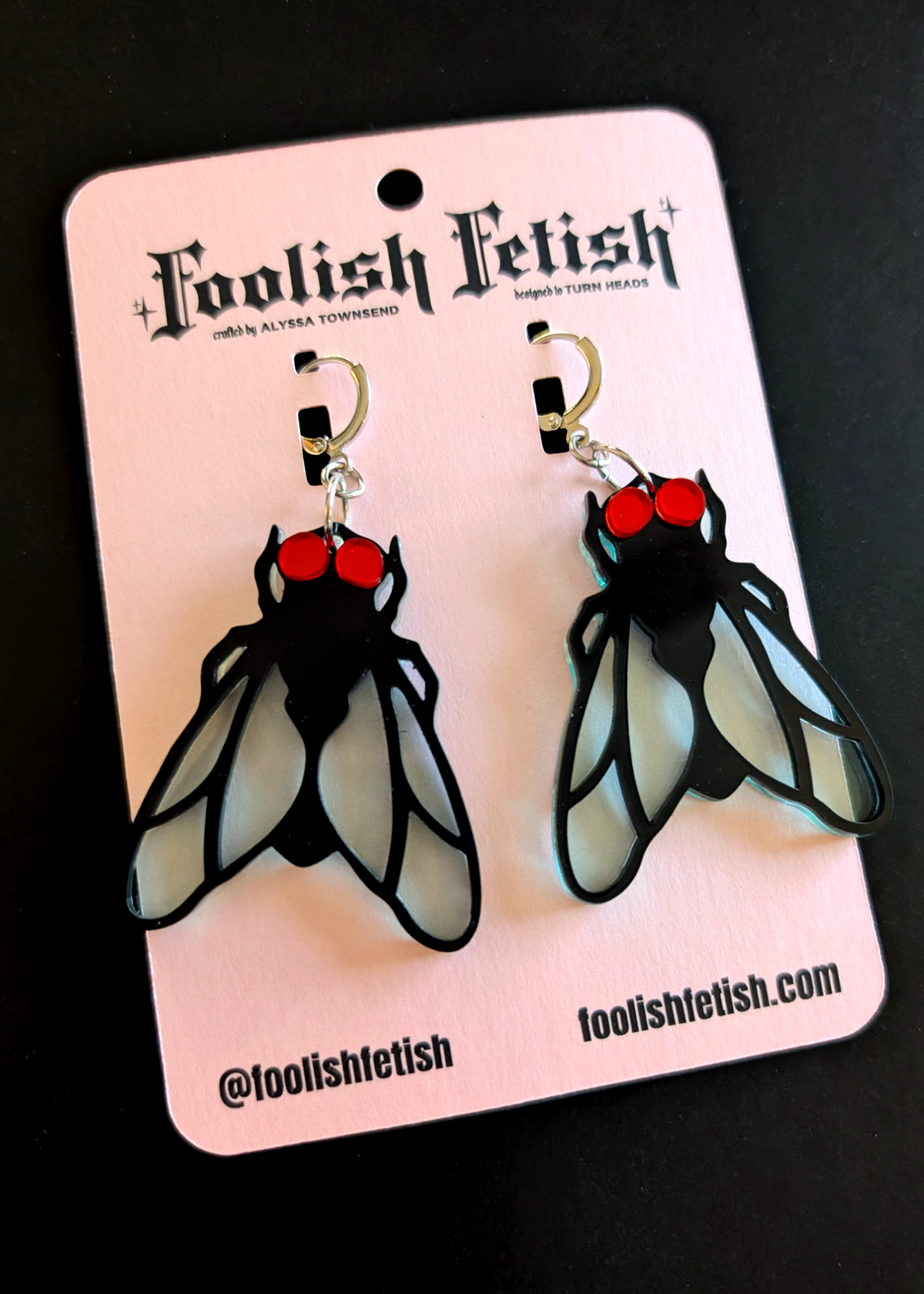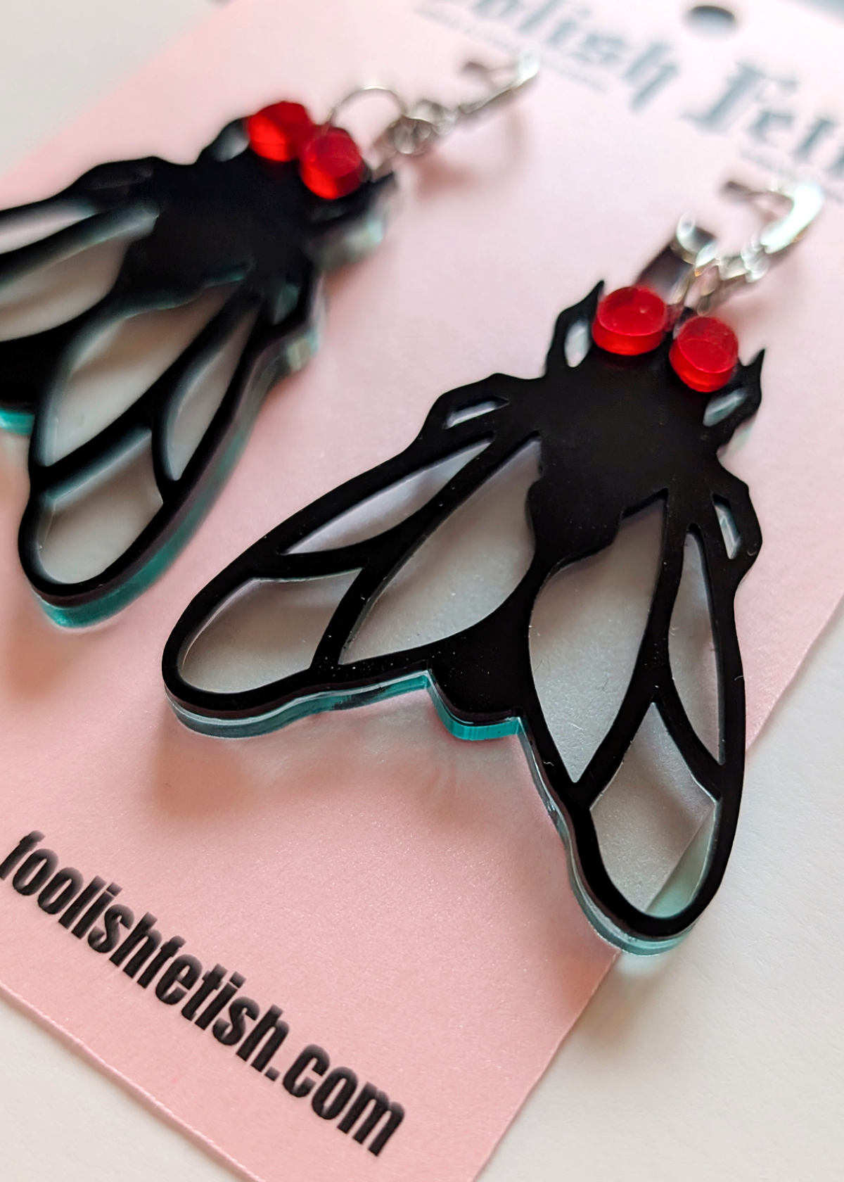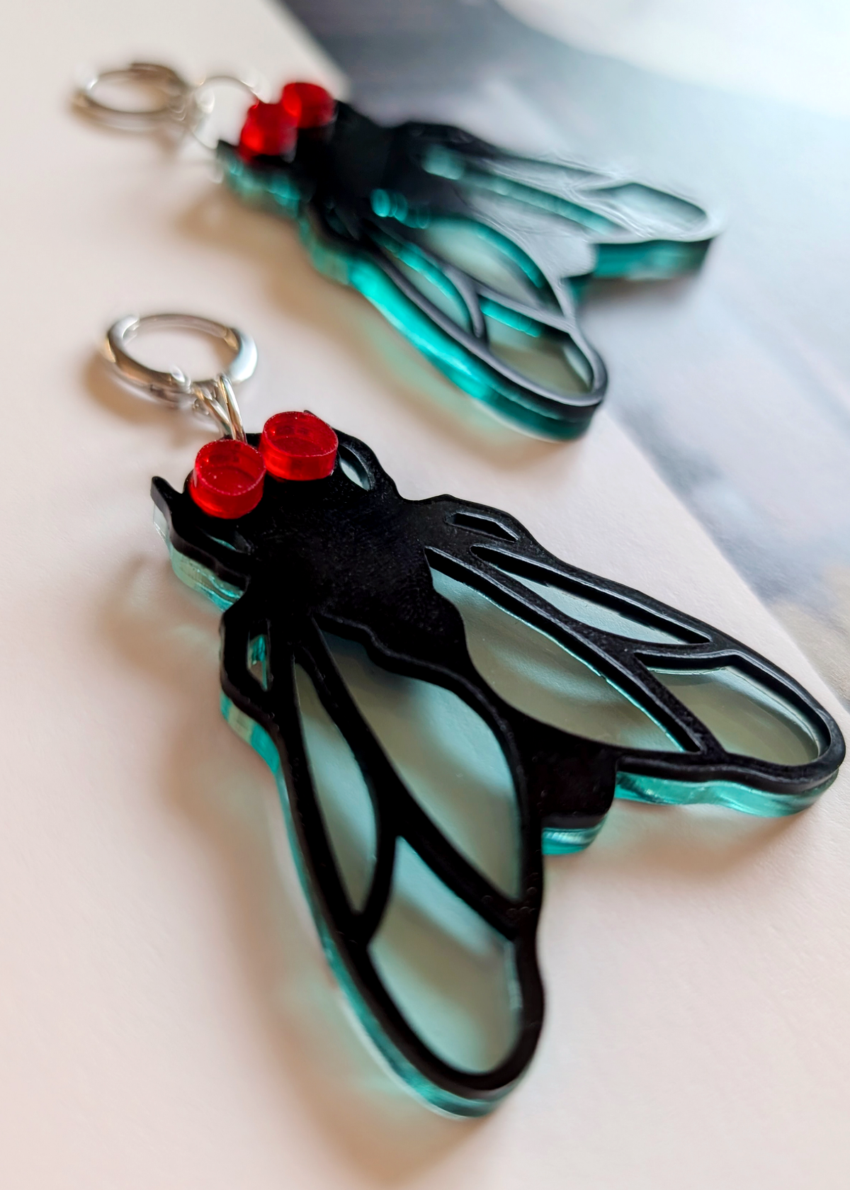 Super cool laser cut acrylic fly earrings with transparent green wings and red mirror eyes. Measure 2" in length and 1.7" wide. Super lightweight! We'd wear these with an all-black outfit and hair up in a messy bun.