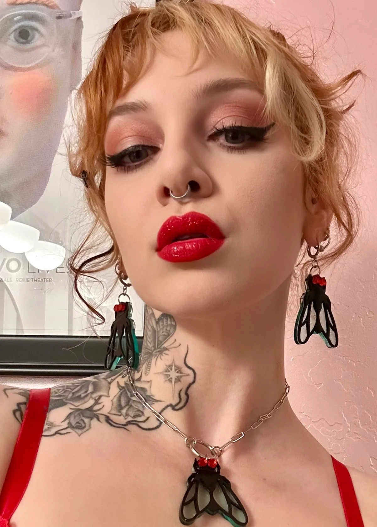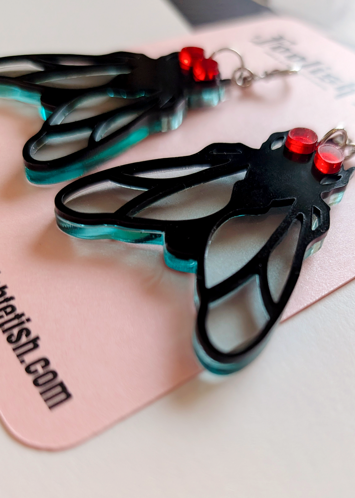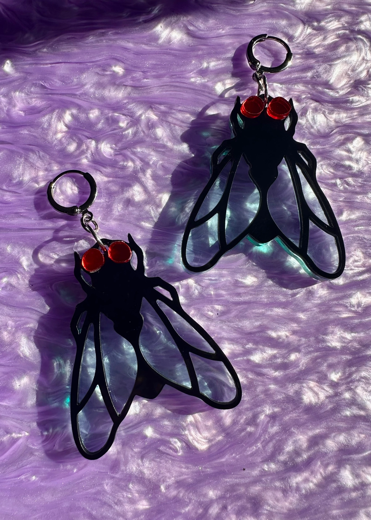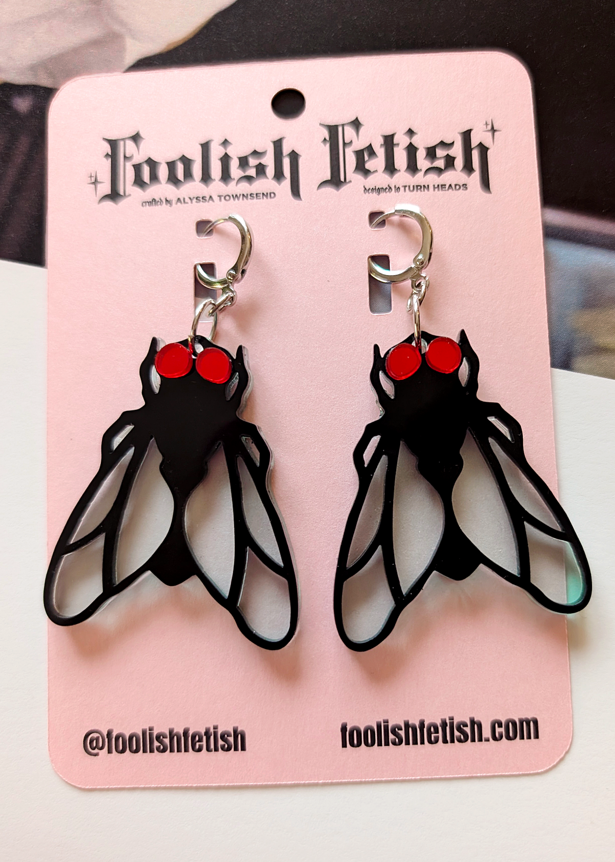 Super cool laser cut acrylic fly earrings with transparent green wings and red mirror eyes. Measure 2" in length and 1.7" wide. Super lightweight! We'd wear these with an all-black outfit and hair up in a messy bun.