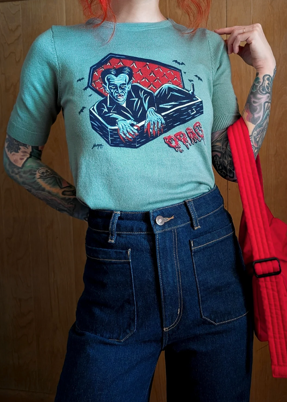 He's a MOOD. Super cute, soft and lightweight short sleeve sweater with retro Dracula silk screen graphics printed on the front. "DRAC" printed in a drippy red font. Ribbed cuffs and hem. Dusty Jade/Sea Foam colorway. Graphics are in navy, sky blue, red, and white. Fitted style (we may suggest sizing up if unsure, between sizes or if you want a bit less fitted look) Has stretch!