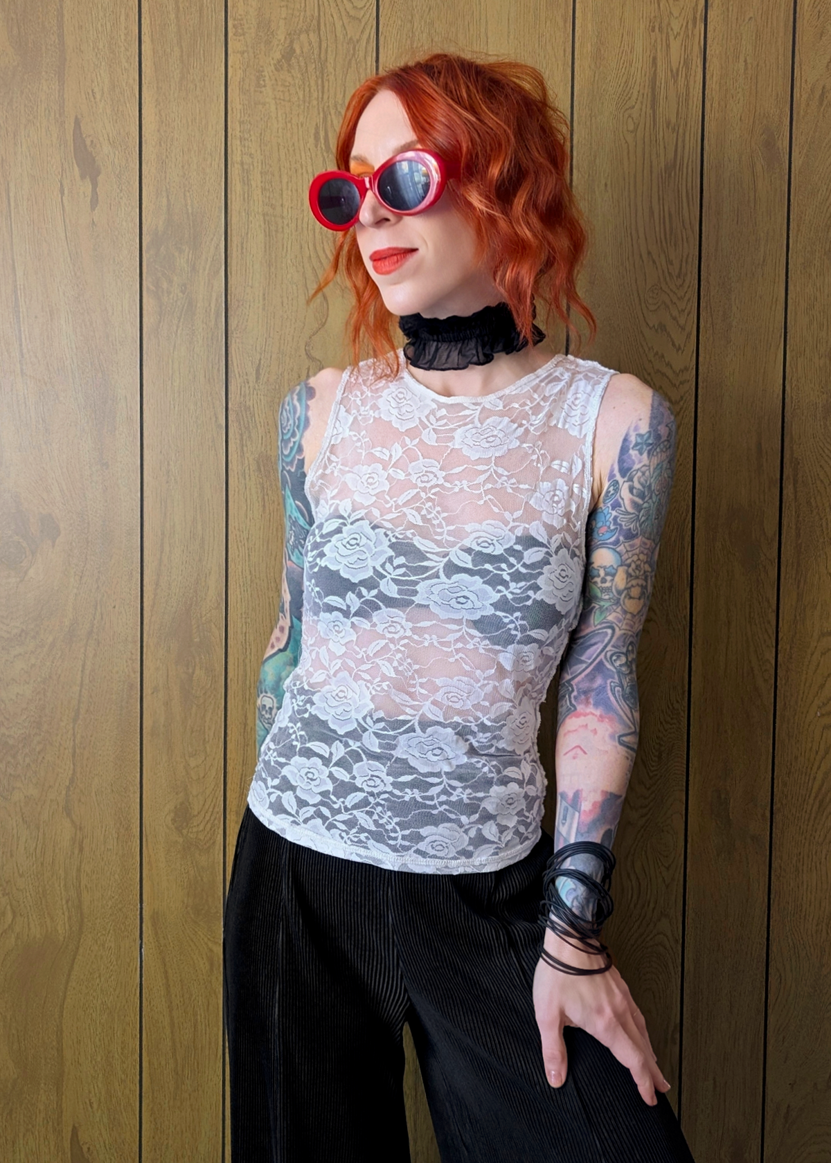 90s-inspired white lace tank top featuring a high cut neckline. White floral lace fabrication. Bodycon fit. Has stretch. Sheer/unlined.