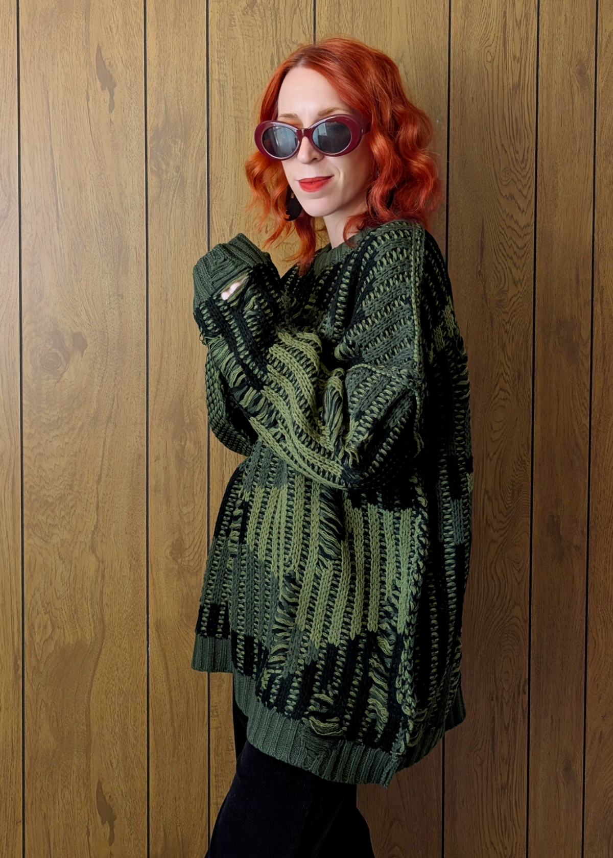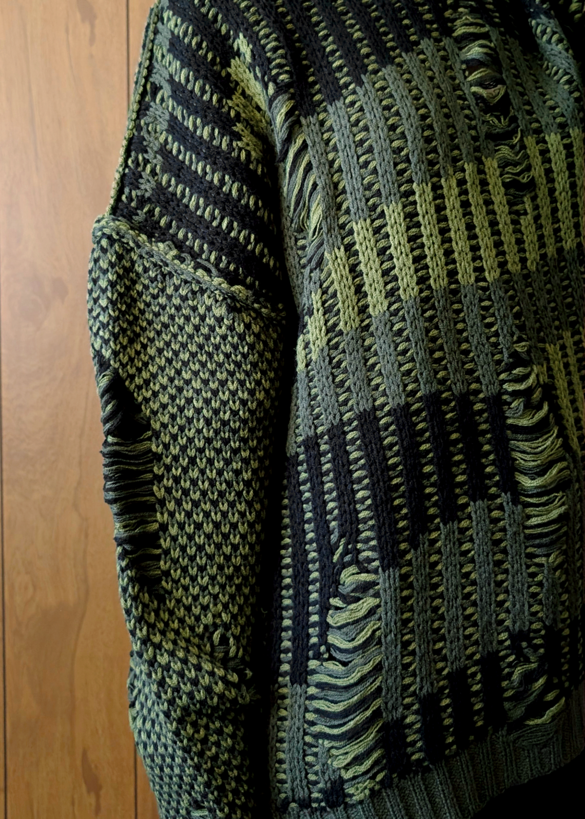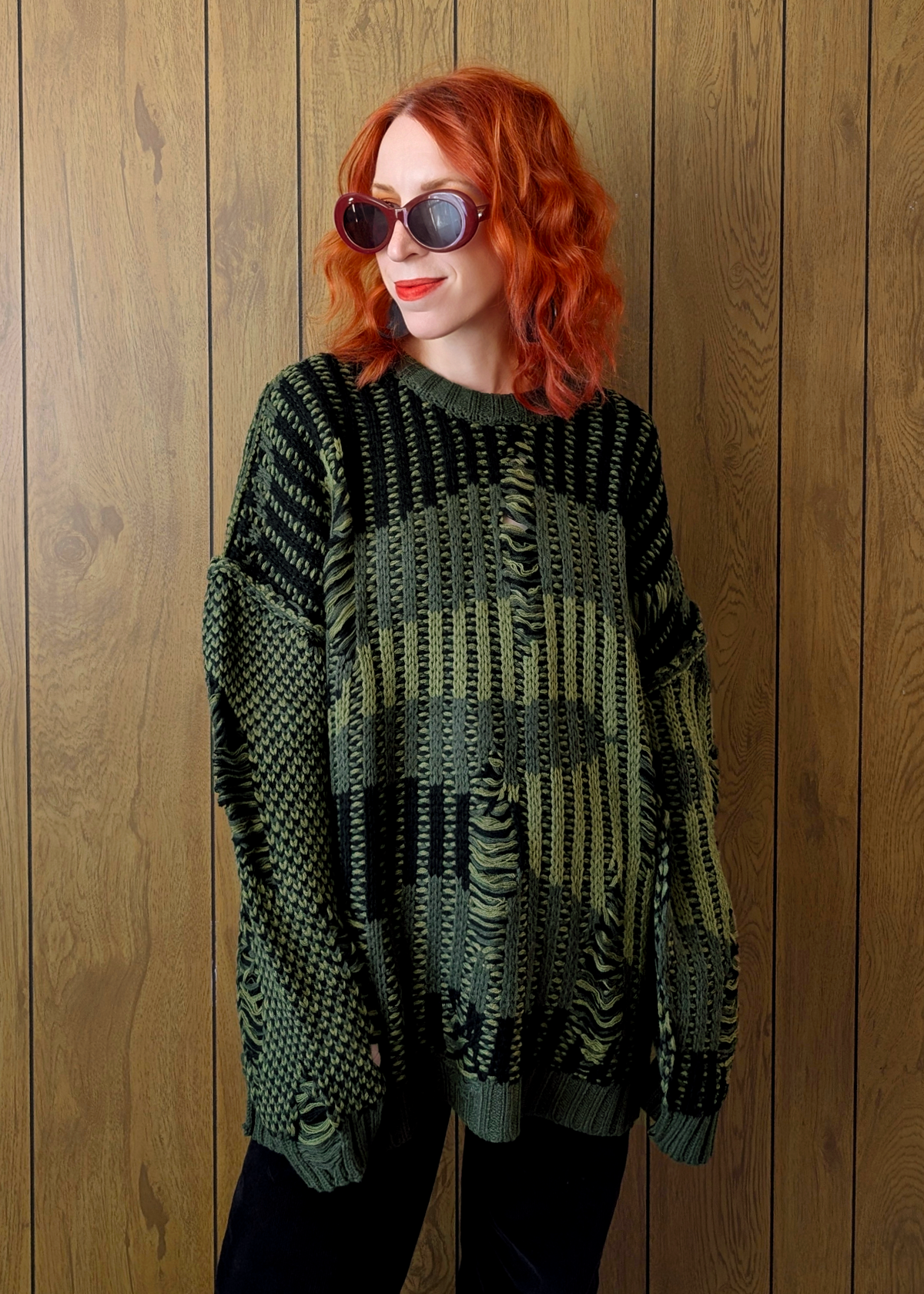 '90s inspired oversized chunky sweater featuring a crew neckline and extra long length through the body. Drop shoulders with seamed detailing. Voluminous sleeves with an extra long length. Olive green and black colorway with variating stripes and destroyed and shredded detailing throughout for an extra grunge vibe.