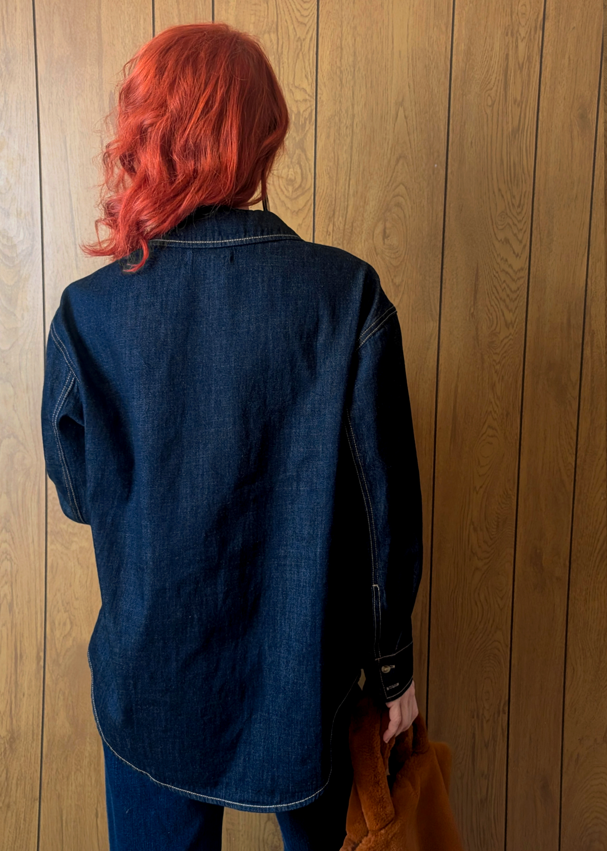 Totally classic oversized denim shirt from Rolla's. Features a collared neckline, button down front, and long sleeves with button cuffs. Two button flap chest pockets. Slouchy, oversized fit. Dark rinse denim wash with tobacco stitching.