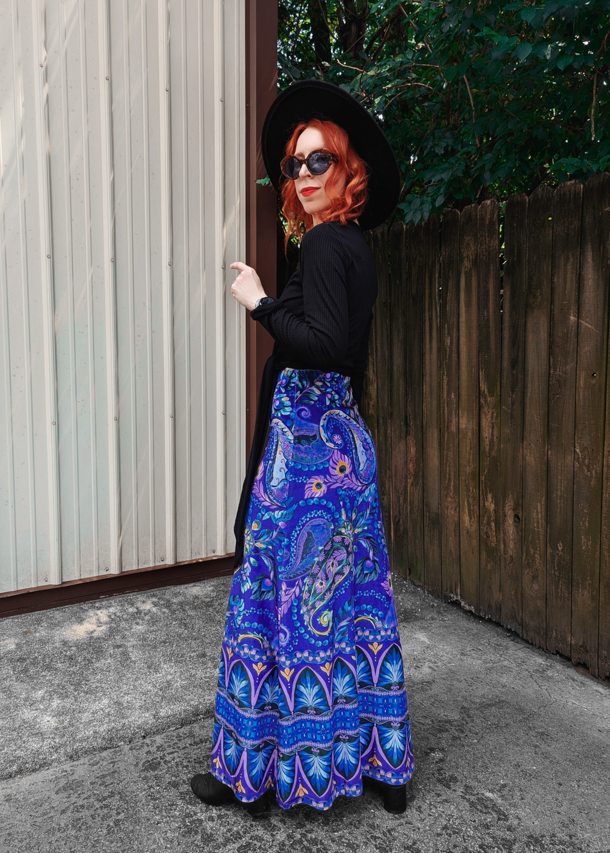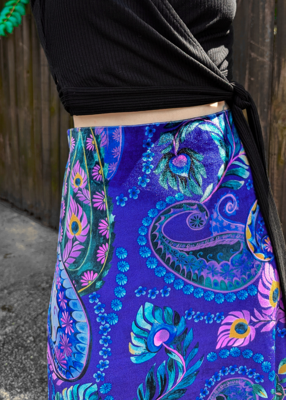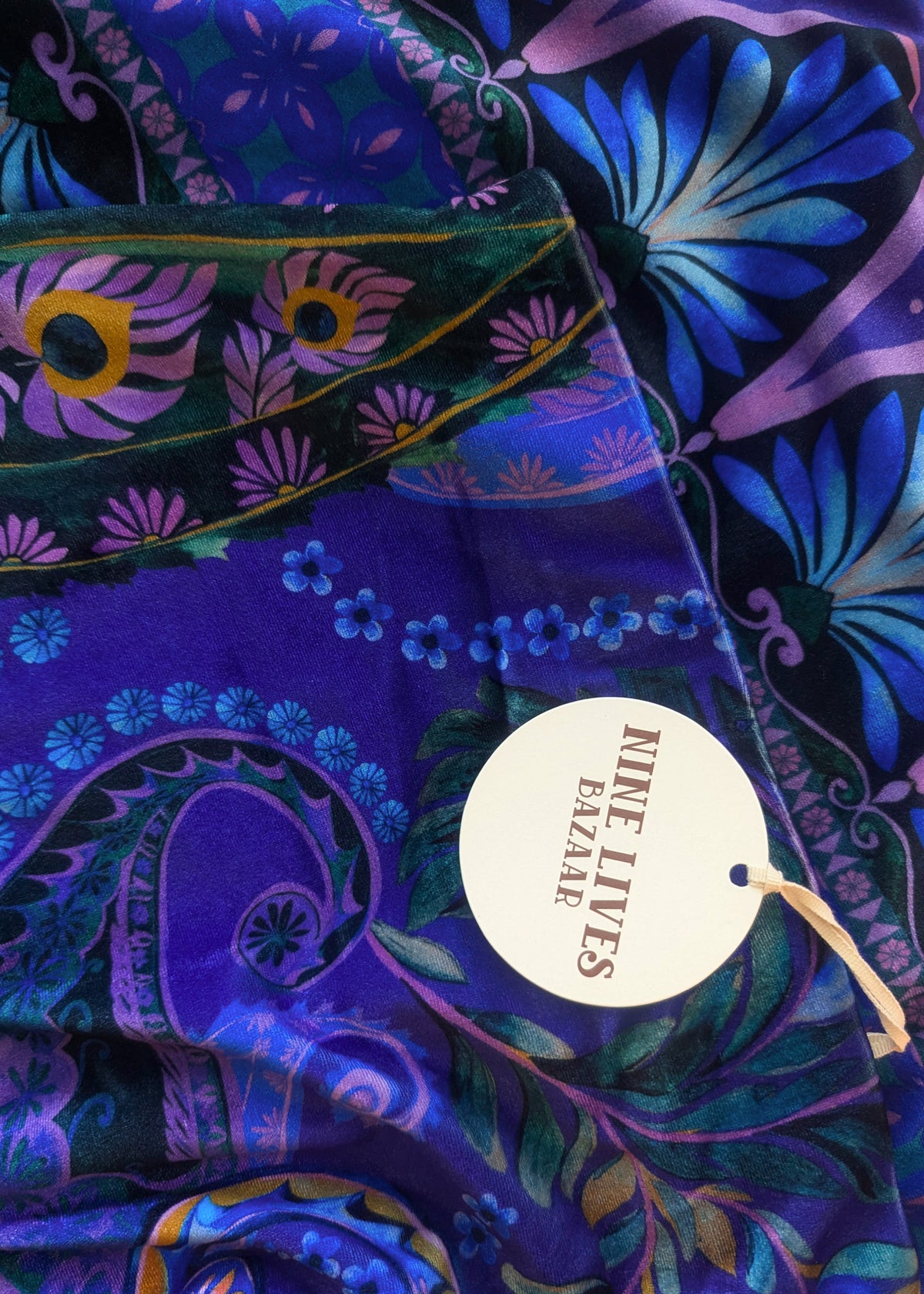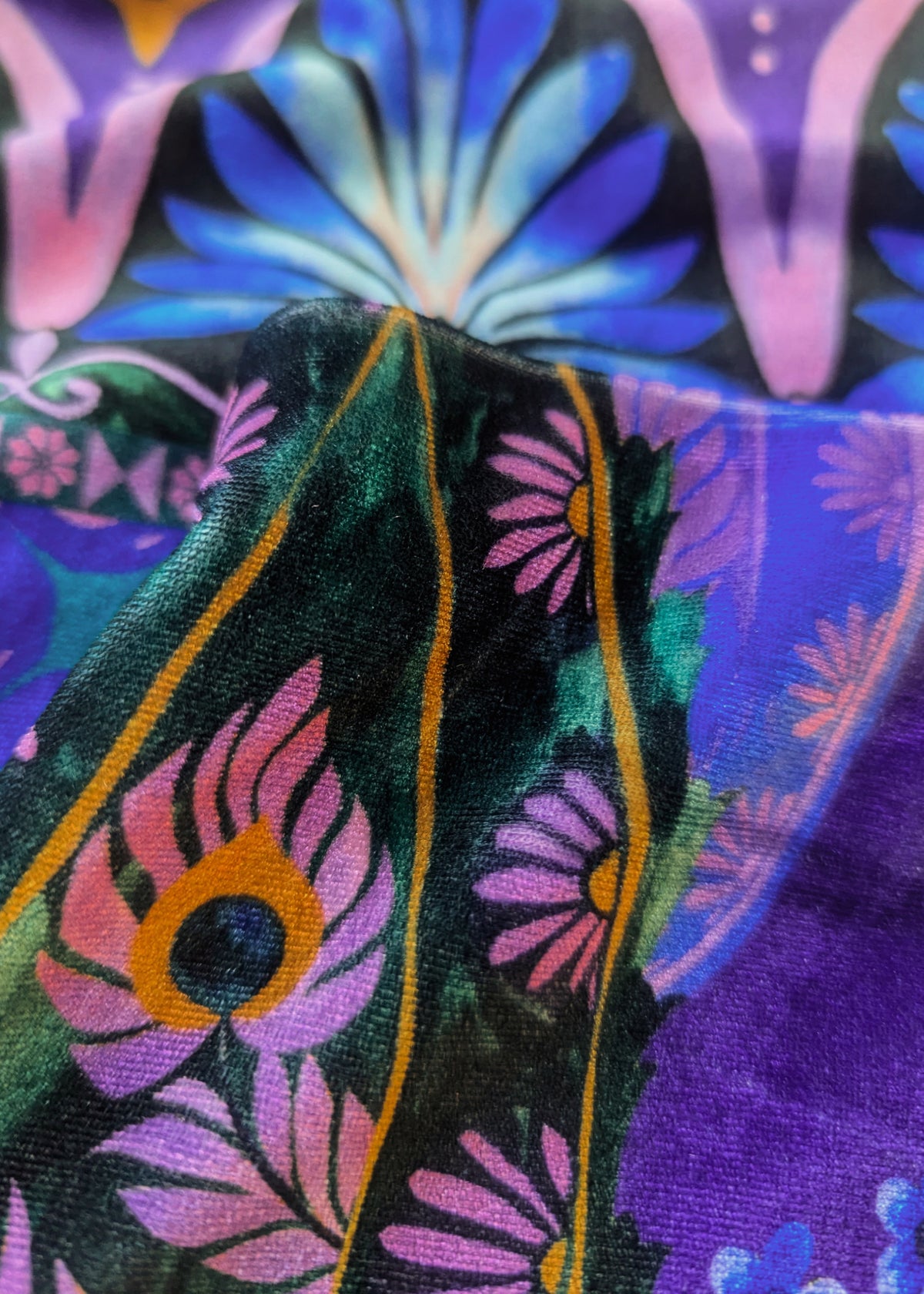 The "Mystic Lagoon" pattern is an intricate custom paisley/floral with a royal blue-ish purple base and lush dark green, teal, turquoise, golden yellow, lavender, and pink details. The colors are SO vibrant in real life, and glistens in the sun!