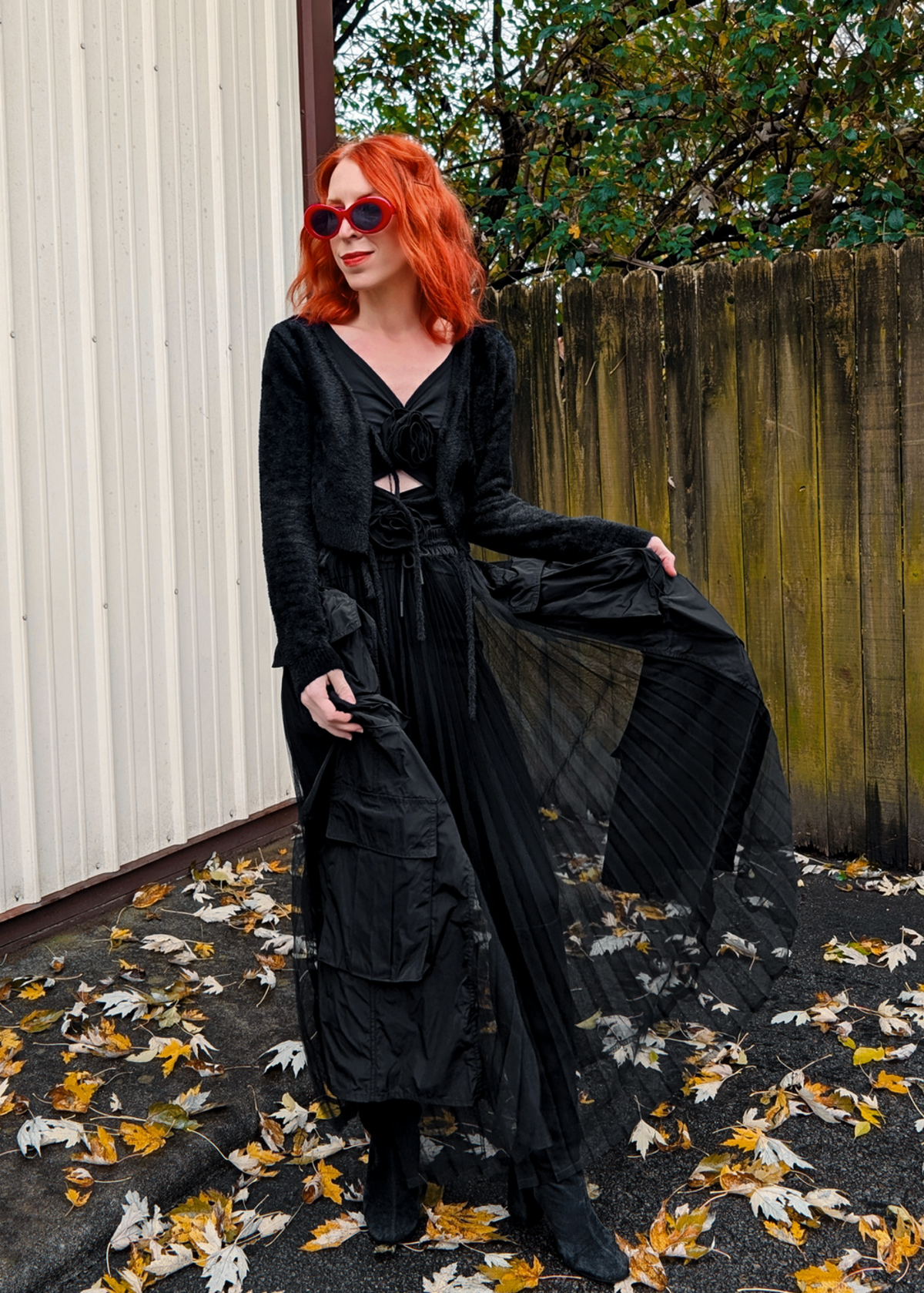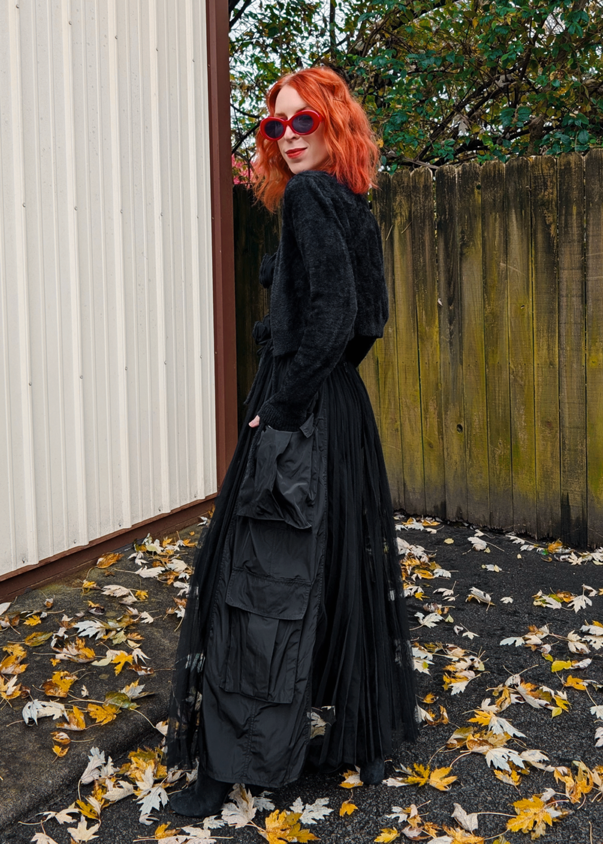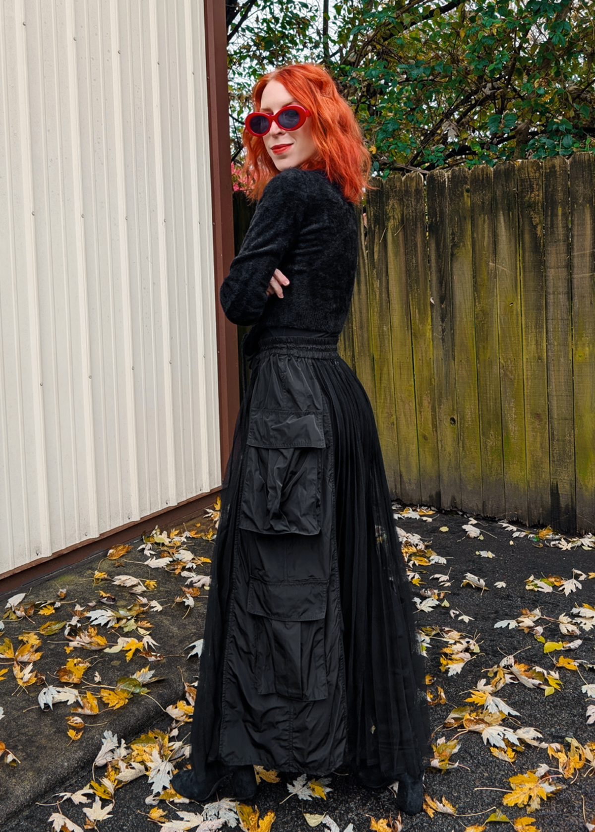 We're obsessed! It's like The Craft meets the Matrix meets Hackers - just some 90s vibes all rolled into one super cool skirt. Crafted from lightweight sheer mesh and non-stretch fabrics, this relaxed-fit skirt features sheer pleated mesh panels at front and back, and at sides, solid black swishy, silky nylon fabric with two enlarged flap cargo pockets at each side of the skirt.