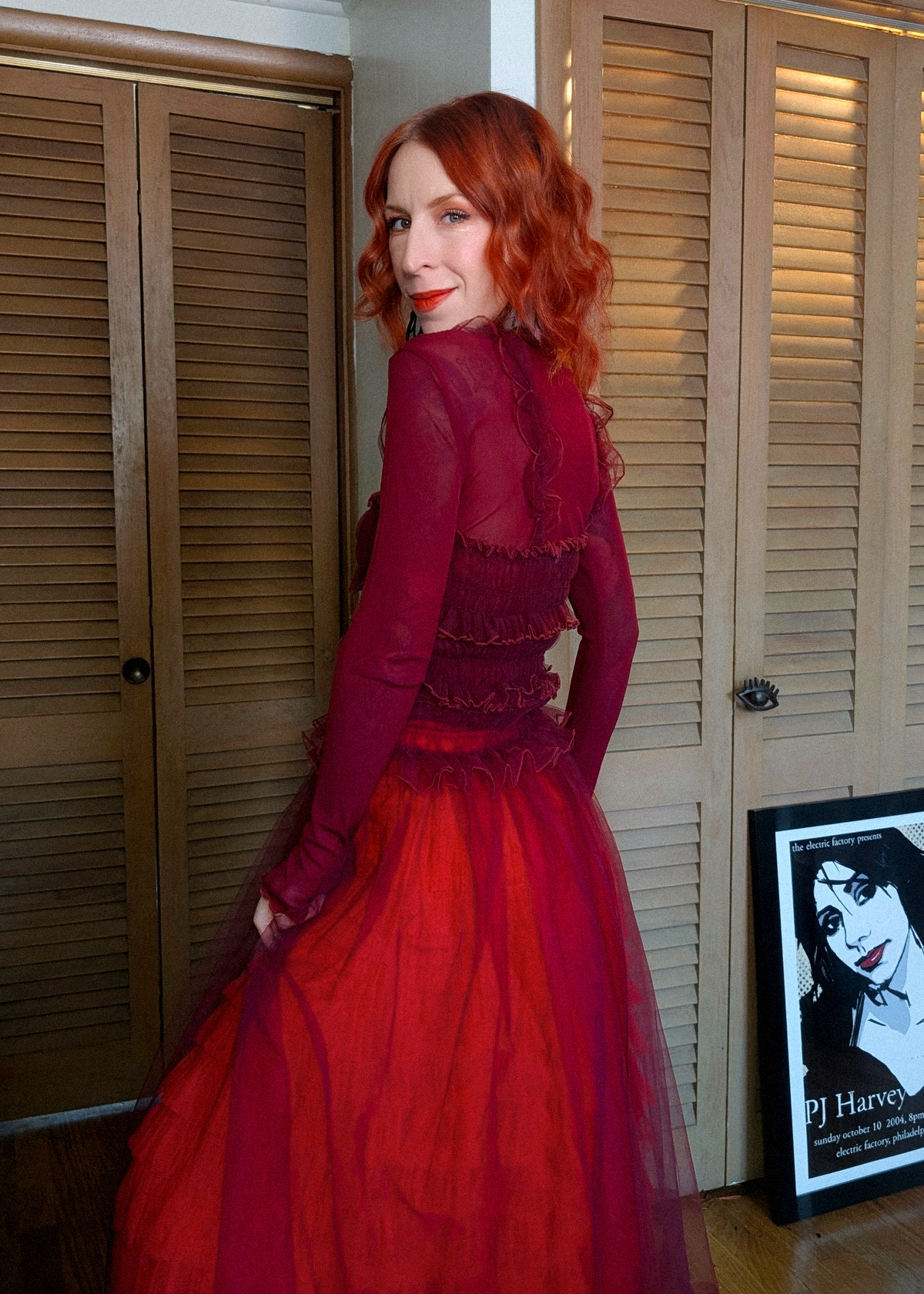 How to style: Layer this sheer piece over a slip dress or long sleeve dress for extra dreamy layers! Taylor (redhead) styled it with a black turtleneck and black pencil skirt underneath. For a super fun party look, she styled it over a mesh top and red tulle skirt. All styling items are not included with this sheer tulle dress.