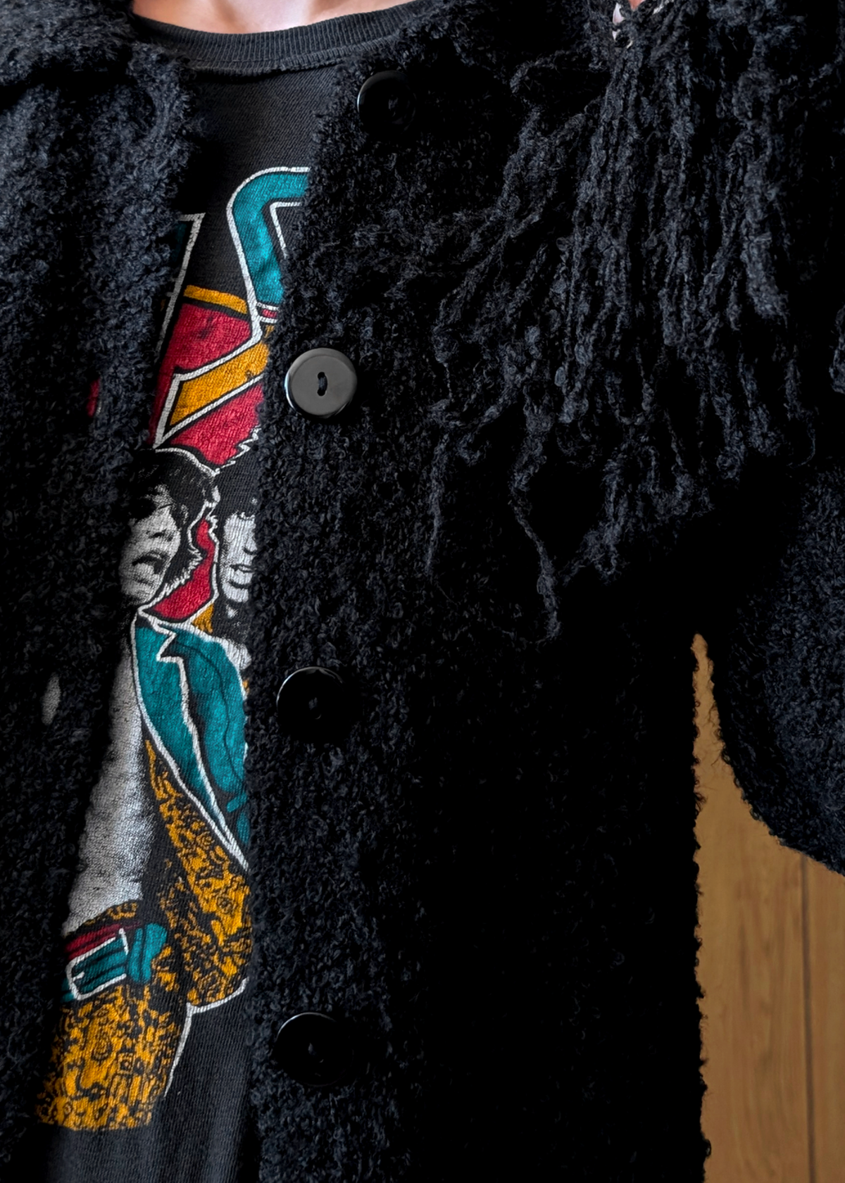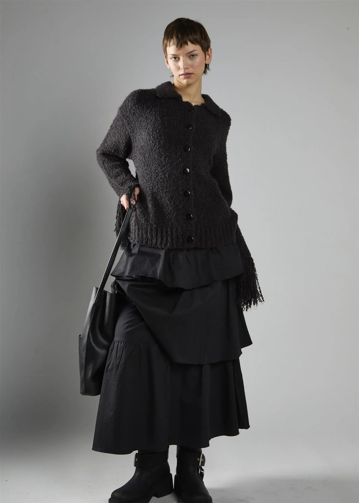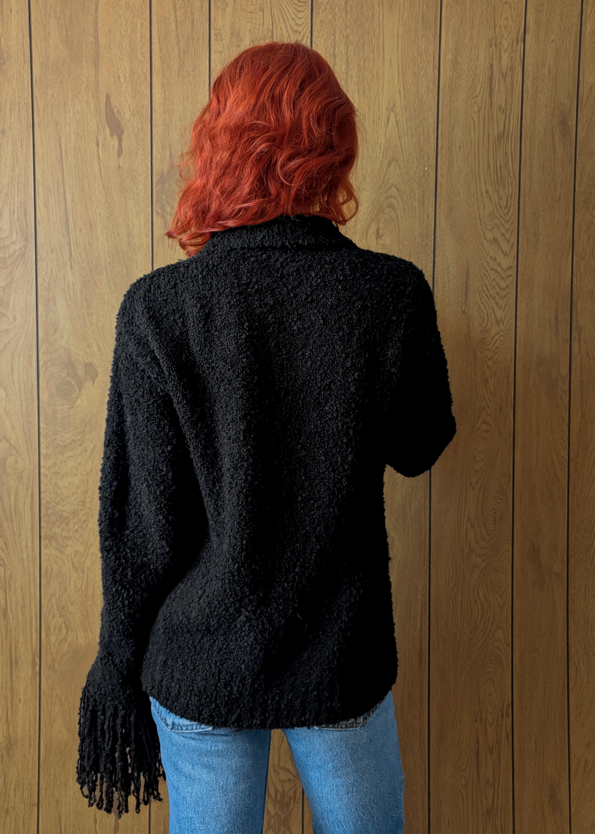 Channeling the '90s with this fringy number! Slouchy fit cardigan with a nubby textured fabrication. Features a collared neckline, long sleeves with tassel fringe detailing at cuffs, and a full button front. Black colorway.