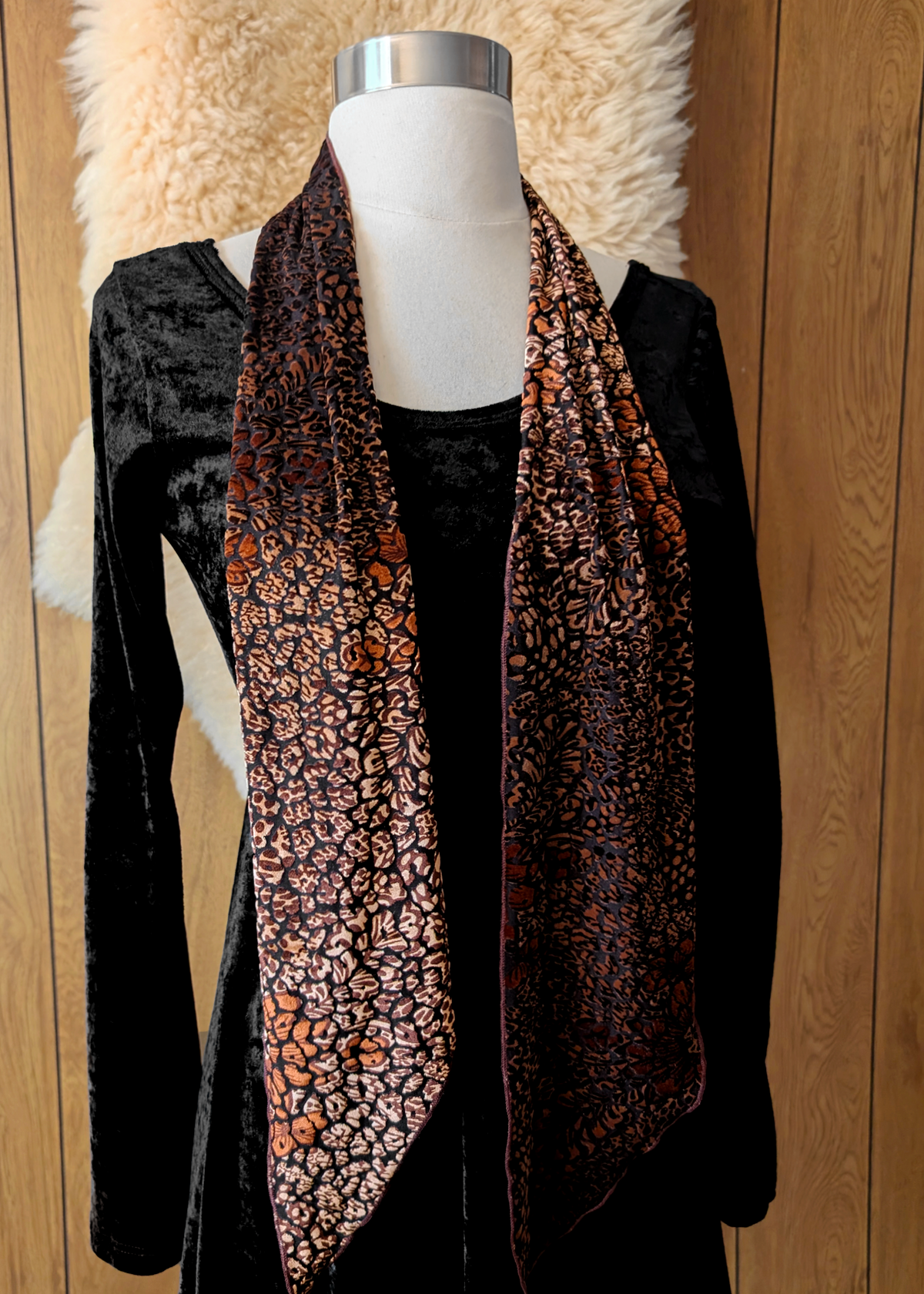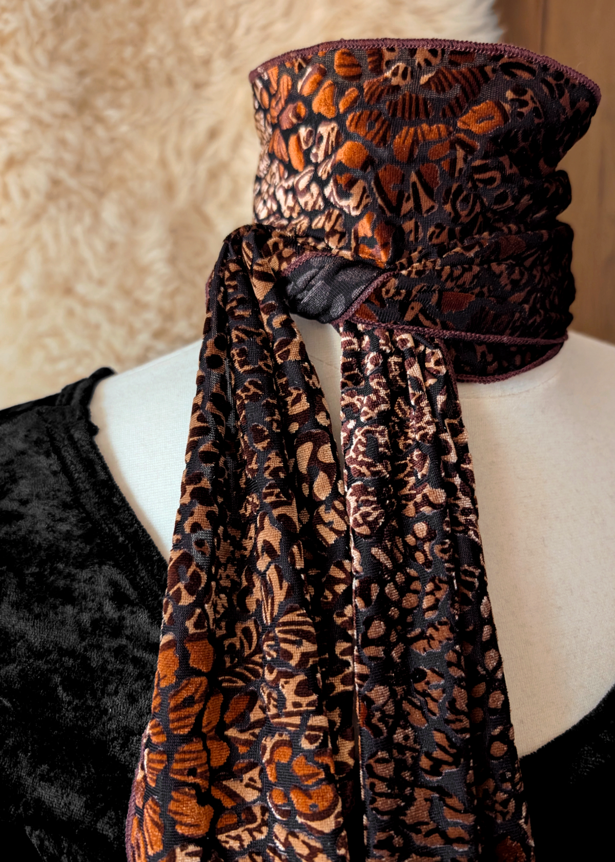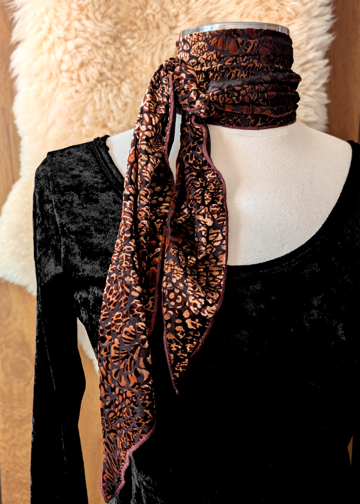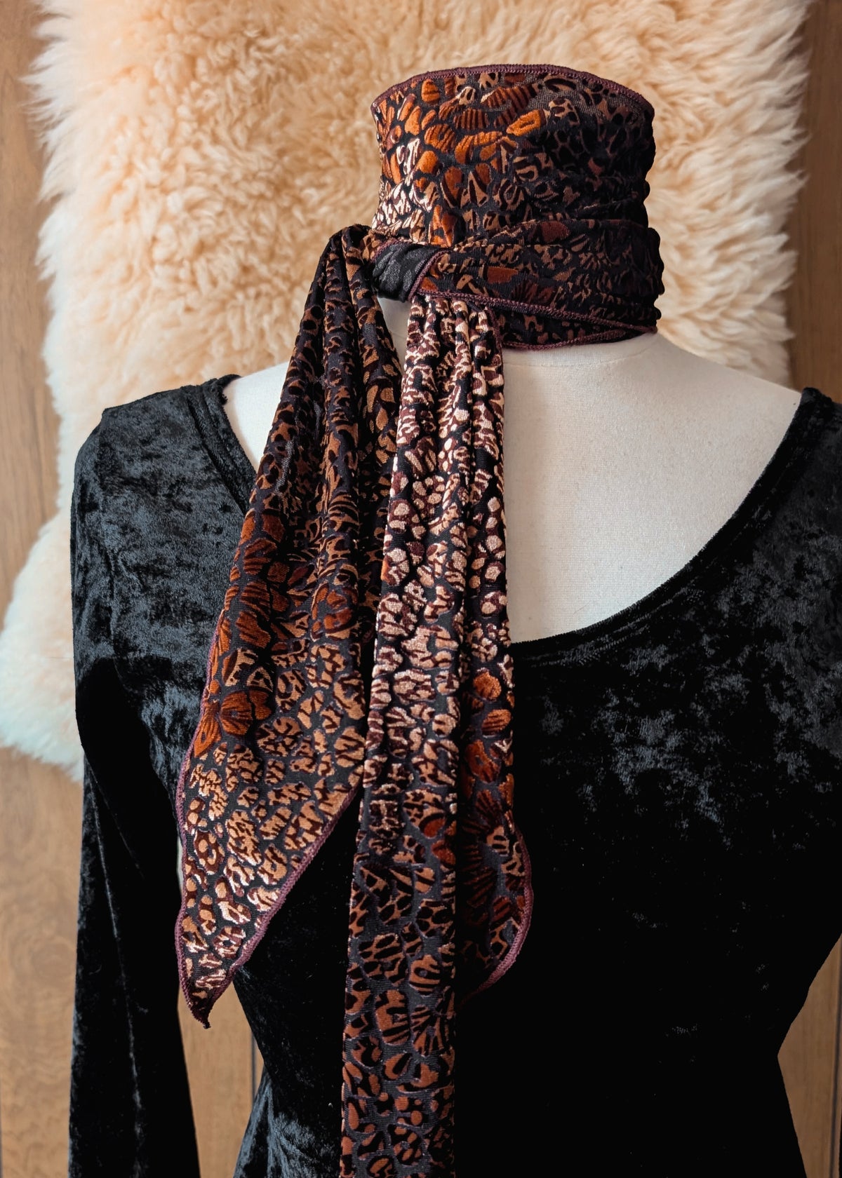 100% rock and roll. This dreamy black and copper brown animal print burnout velvet long scarf tie is lightweight, cozy, and totally epic. Wear it tied around your neck, as a headband, as a hat band, whatever ya like!