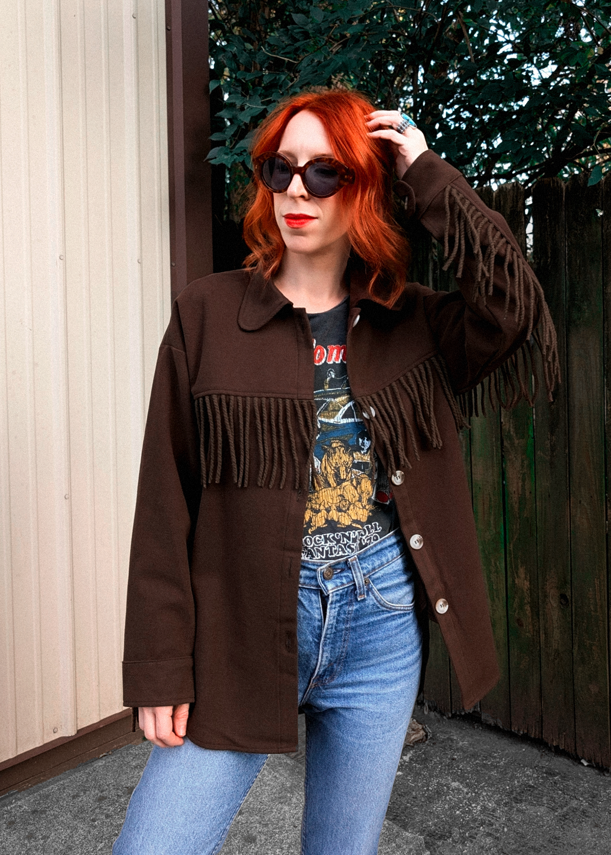 Channelin' Neil Young with this fringe corduroy dream! It's a shirt, it's a jacket - it's a shacket! Dark brown corduroy jacket featuring an oversized, slouchy fit, collared neckline, and button front. Yarn fringe along the chest, down the sleeves, and at back. Long sleeves with button cuffs. Oh, and it has pockets at sides! This baby has a nice weight to it so it'll keep you warm when it's crisp outside.