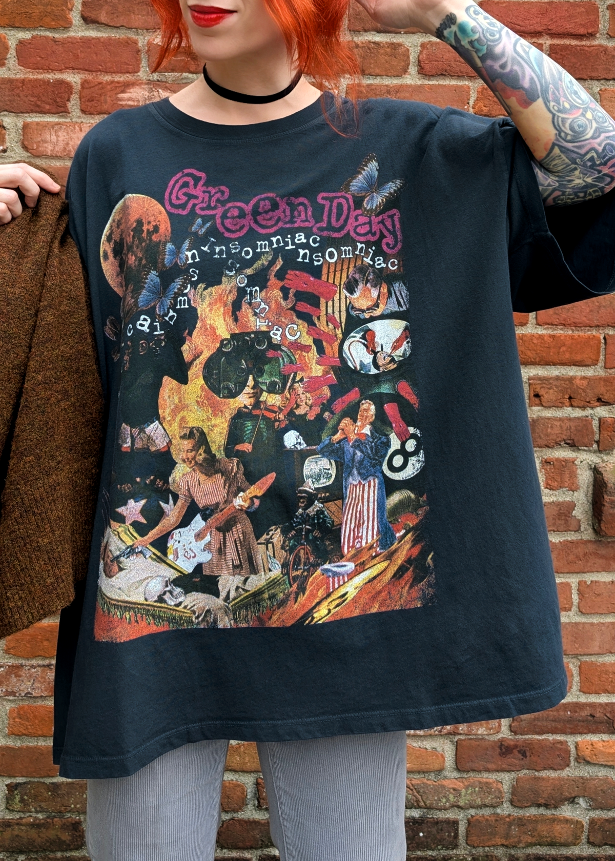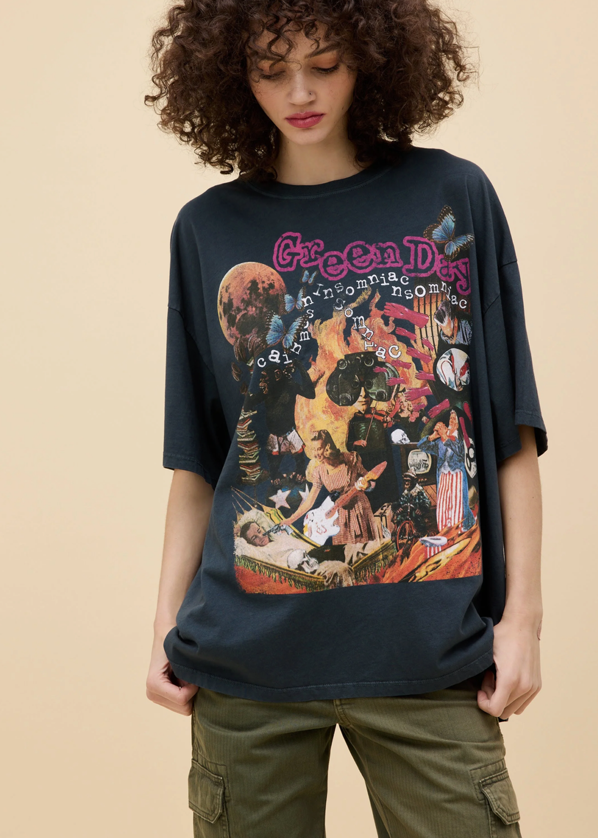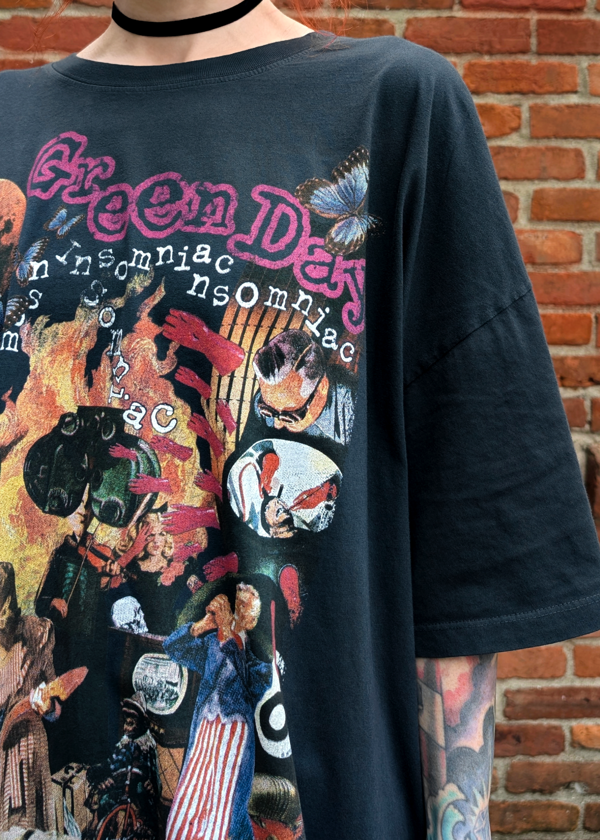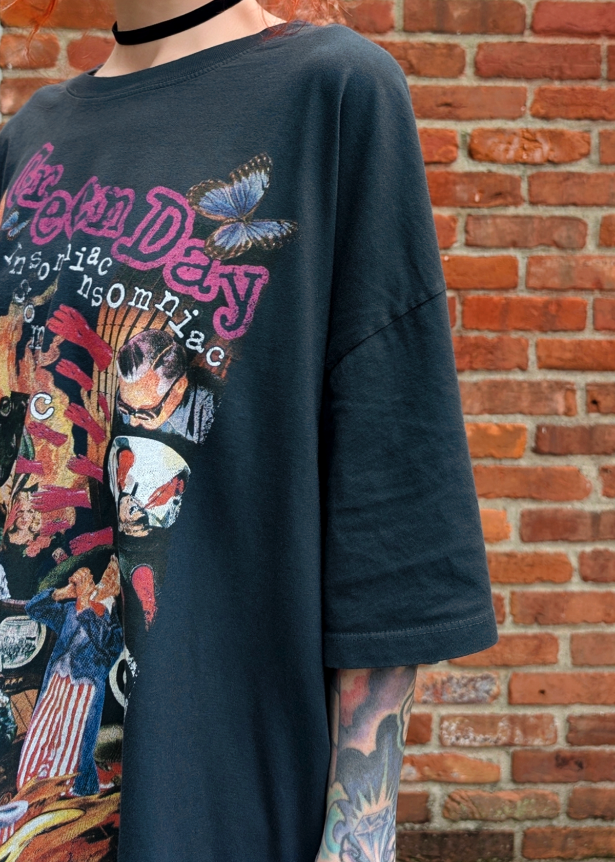 Super cool Green Day One Size tee featuring album artwork from their heavier, hardcore punk fourth studio album, "Insomniac." Designed with Daydreamer's rendition of the album's original cover art with its corresponding tour stops listed on the back.