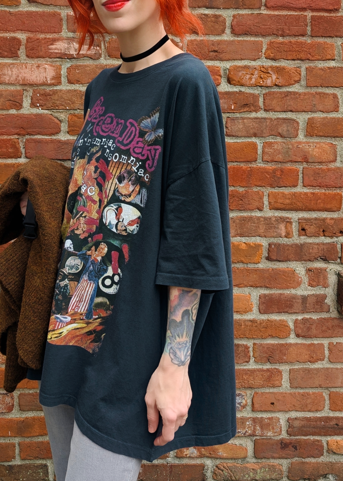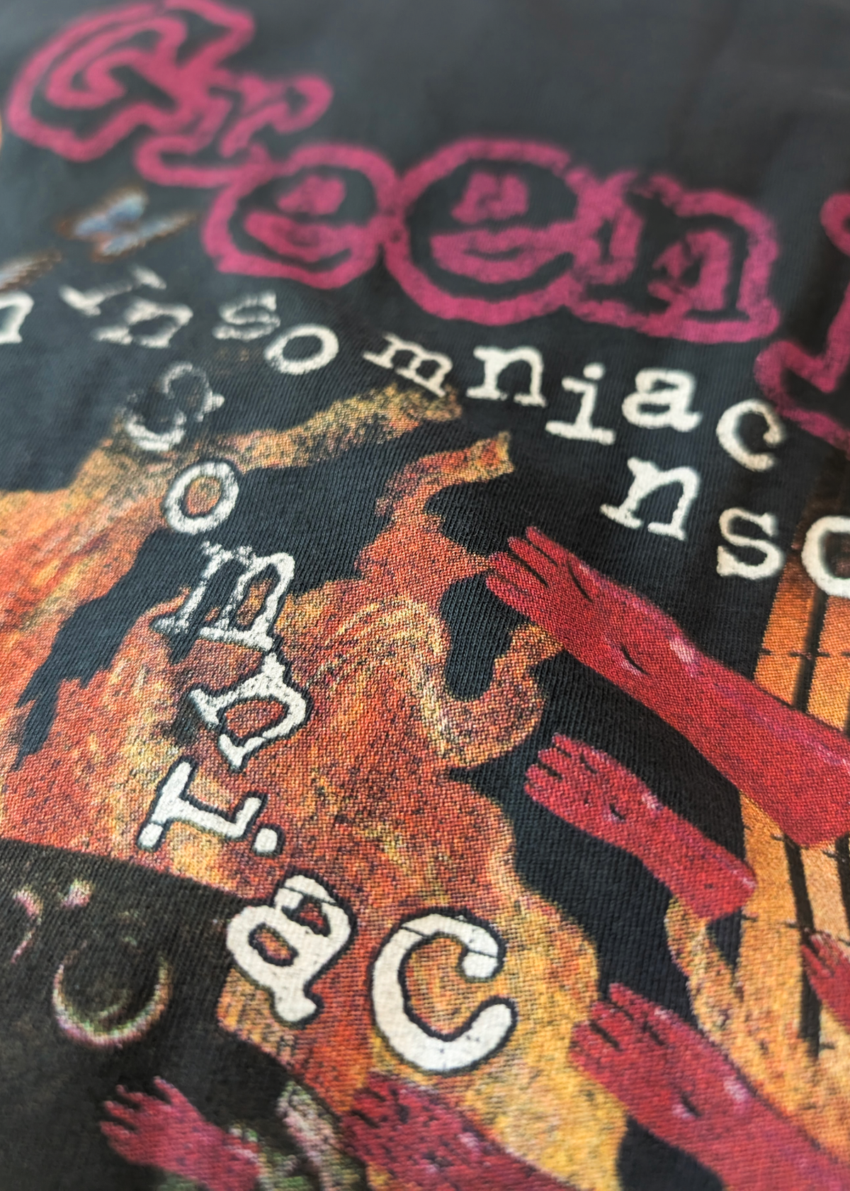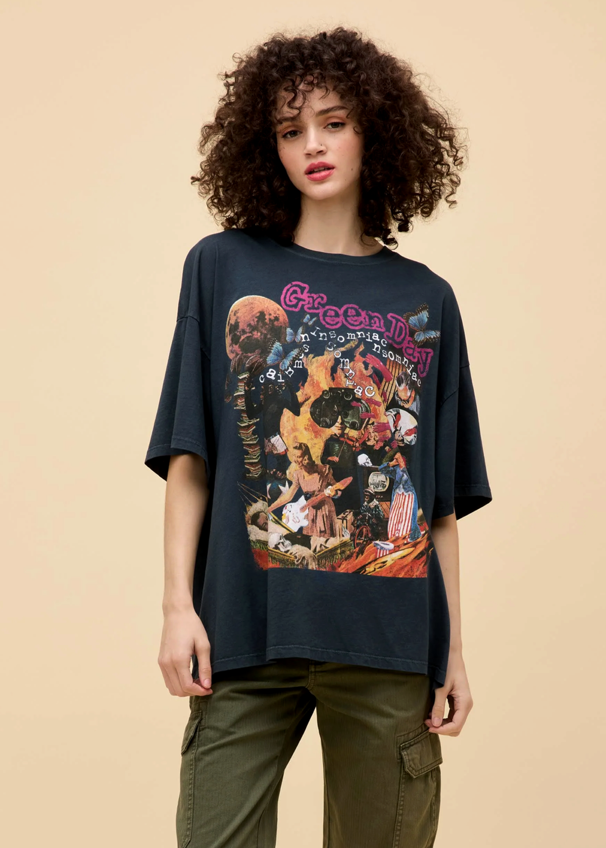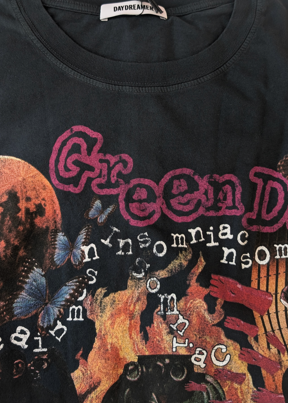 Super cool Green Day One Size tee featuring album artwork from their heavier, hardcore punk fourth studio album, "Insomniac." Designed with Daydreamer's rendition of the album's original cover art with its corresponding tour stops listed on the back.