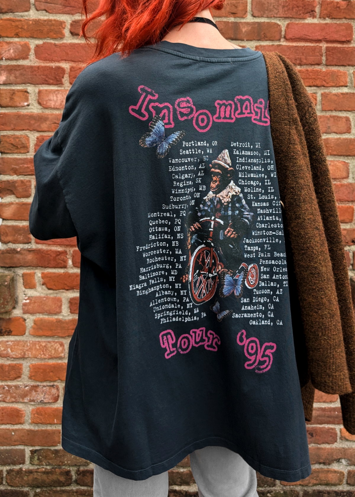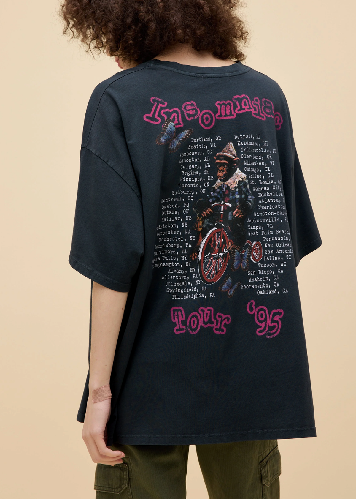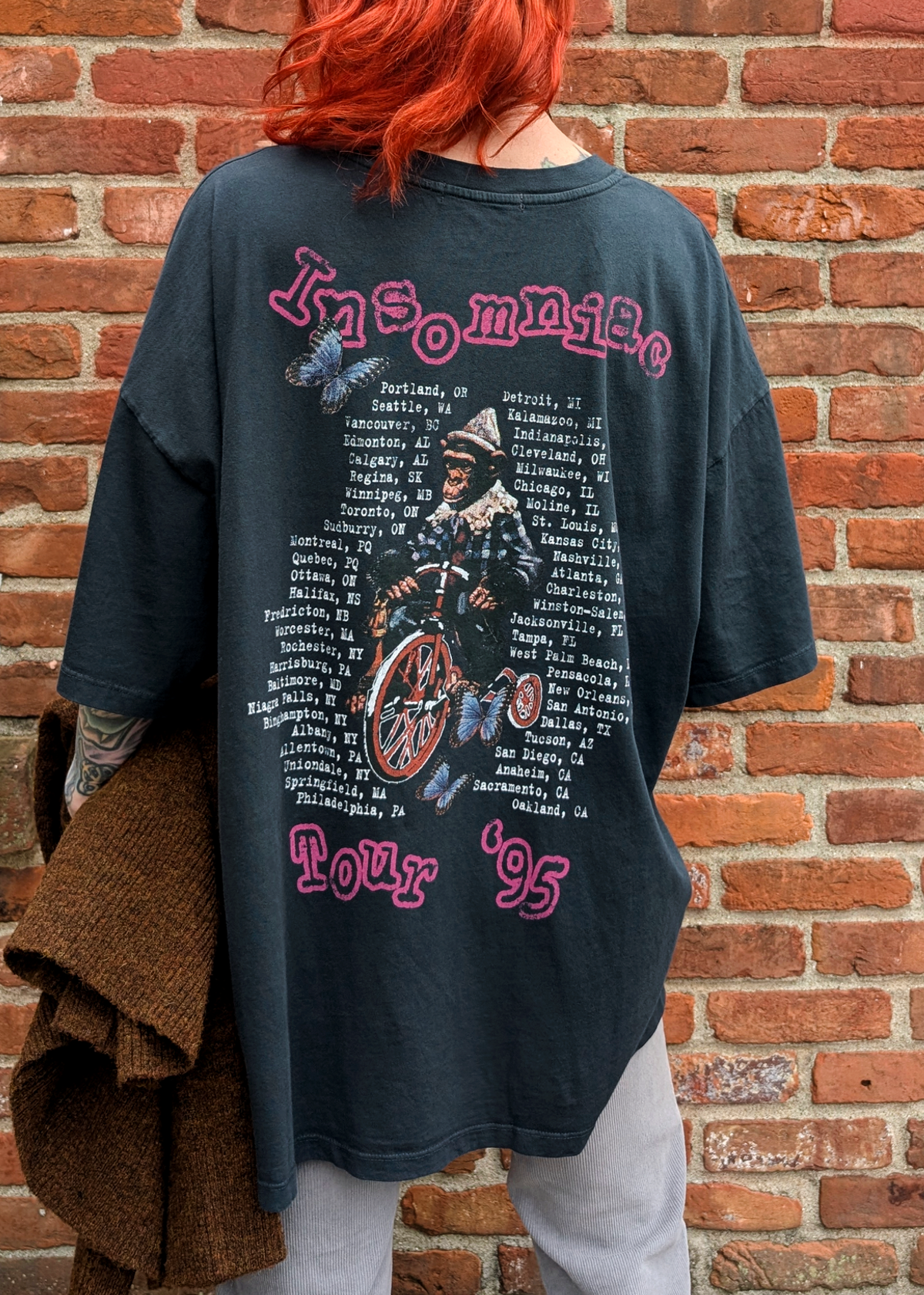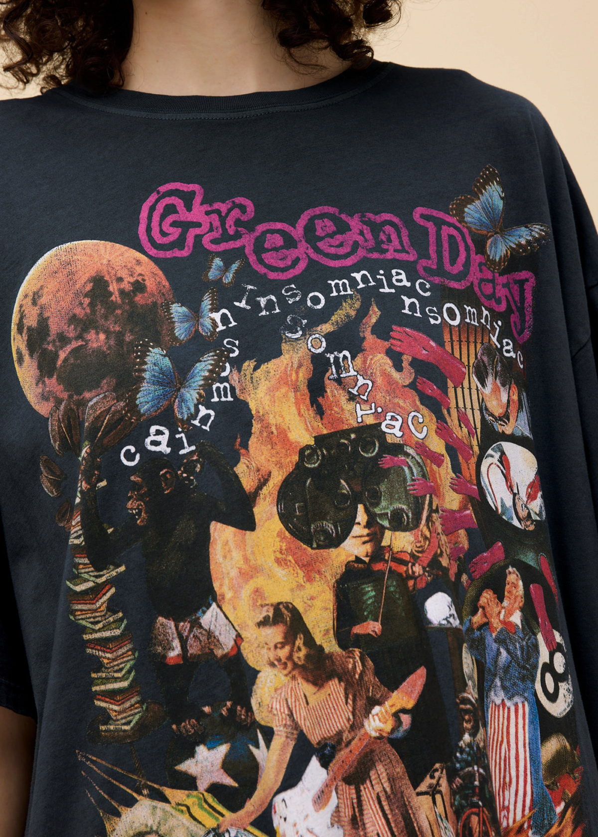 Super cool Green Day One Size tee featuring album artwork from their heavier, hardcore punk fourth studio album, "Insomniac." Designed with Daydreamer's rendition of the album's original cover art with its corresponding tour stops listed on the back.