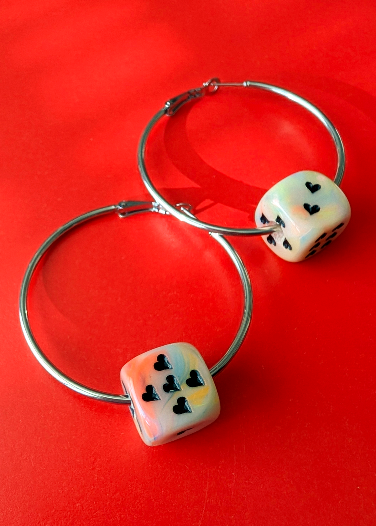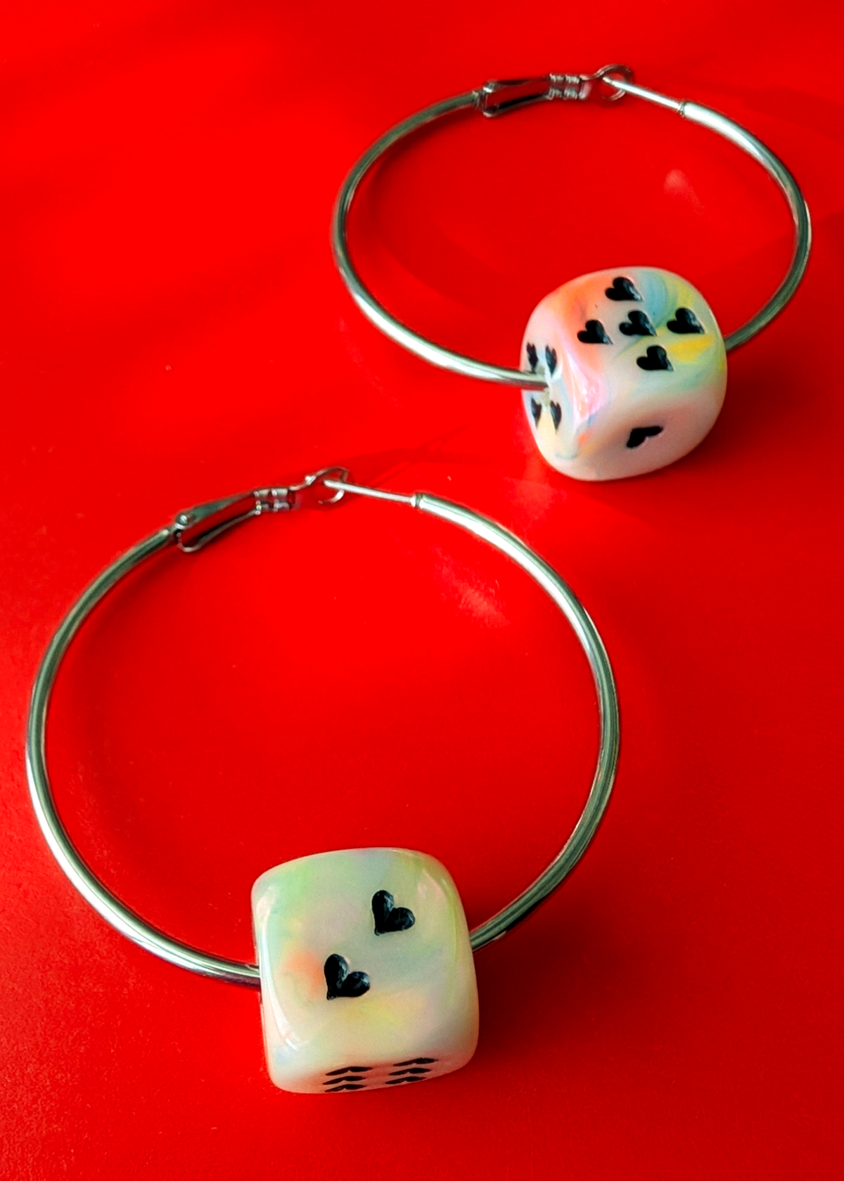 - "Circus Party" creamy opalescent rainbow colored dice with black hearts
