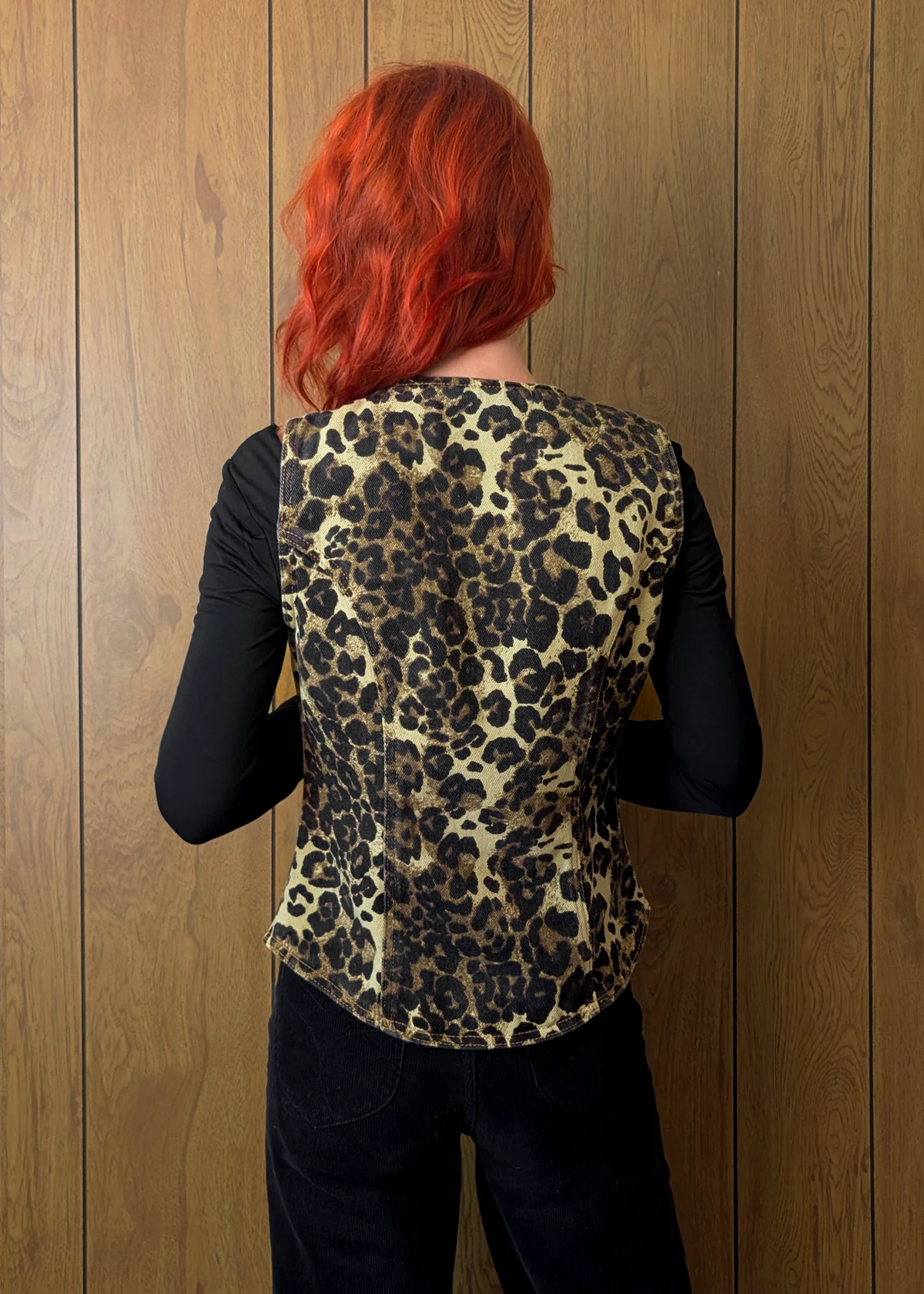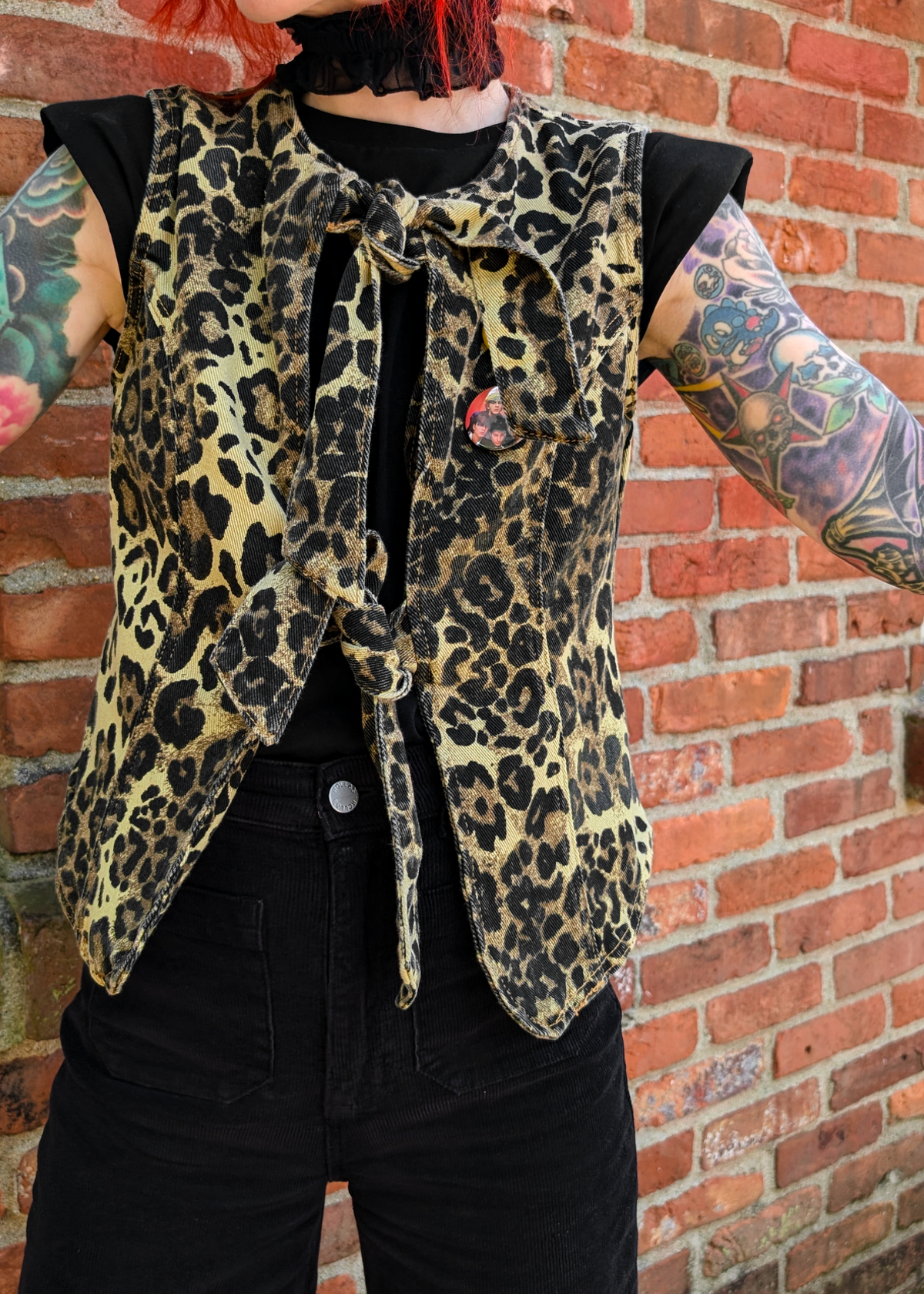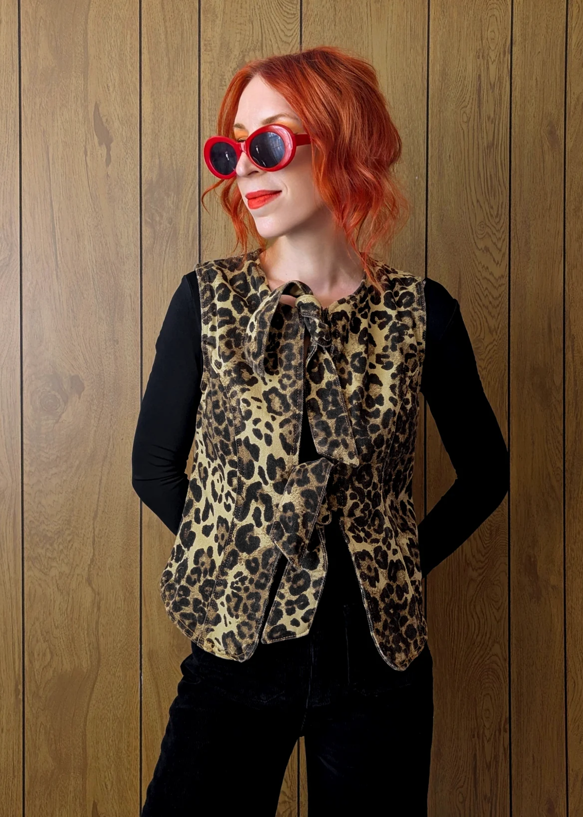 Super cute cotton denim sleeveless vest with two oversized adjustable ties at front. Leopard print design and seamed detailing down the front and back. Dijon mustard colorway with brown and black.