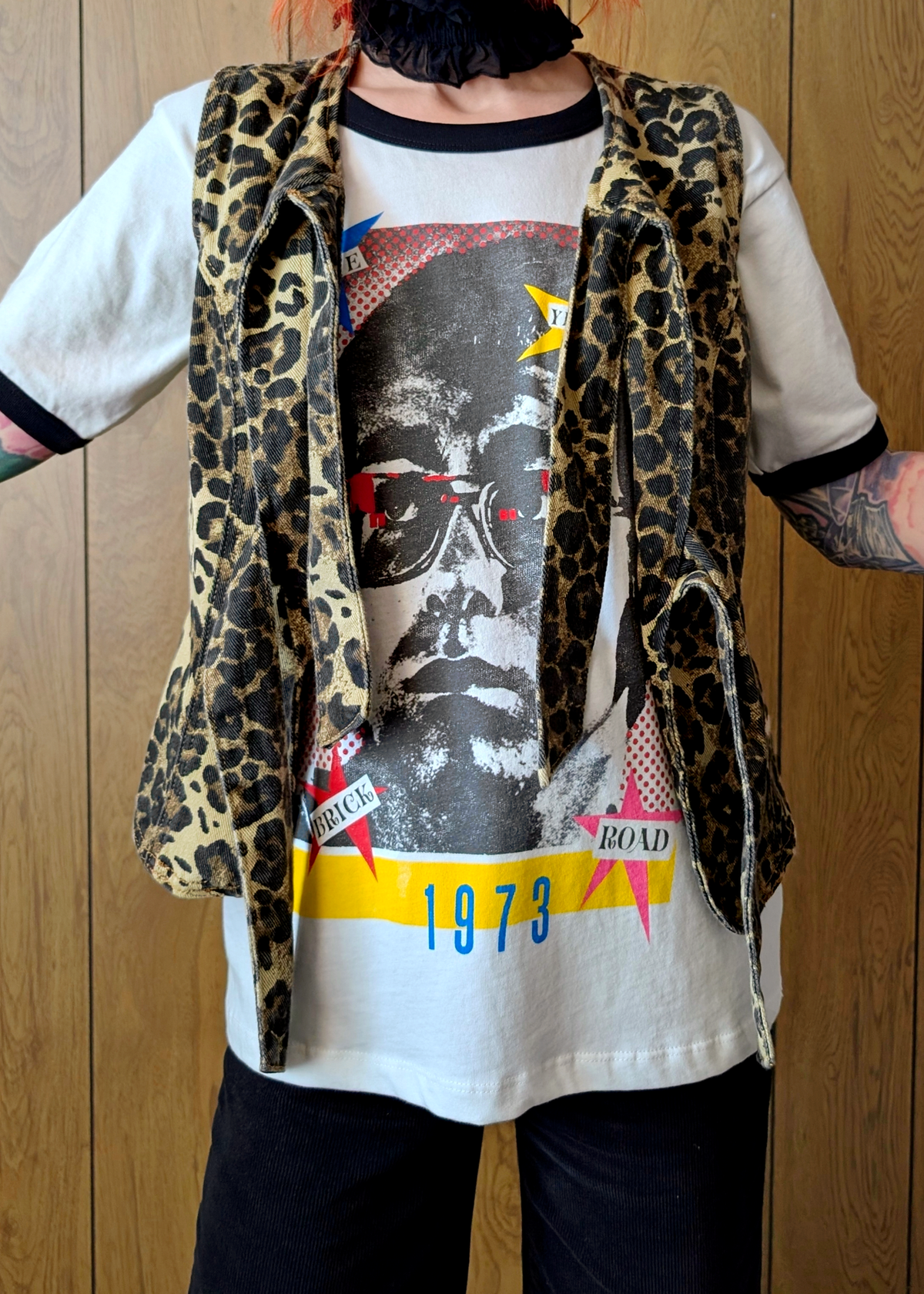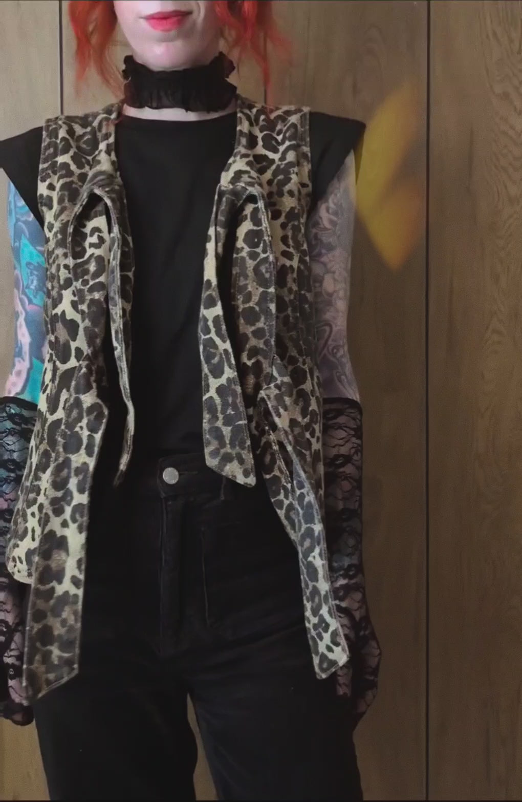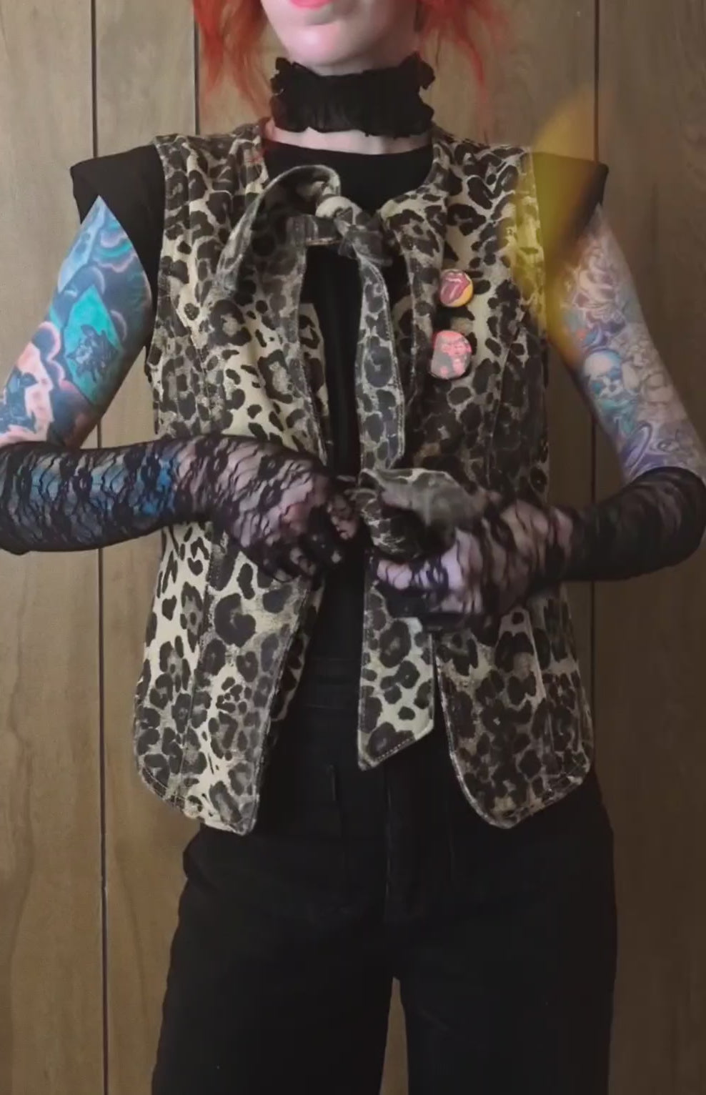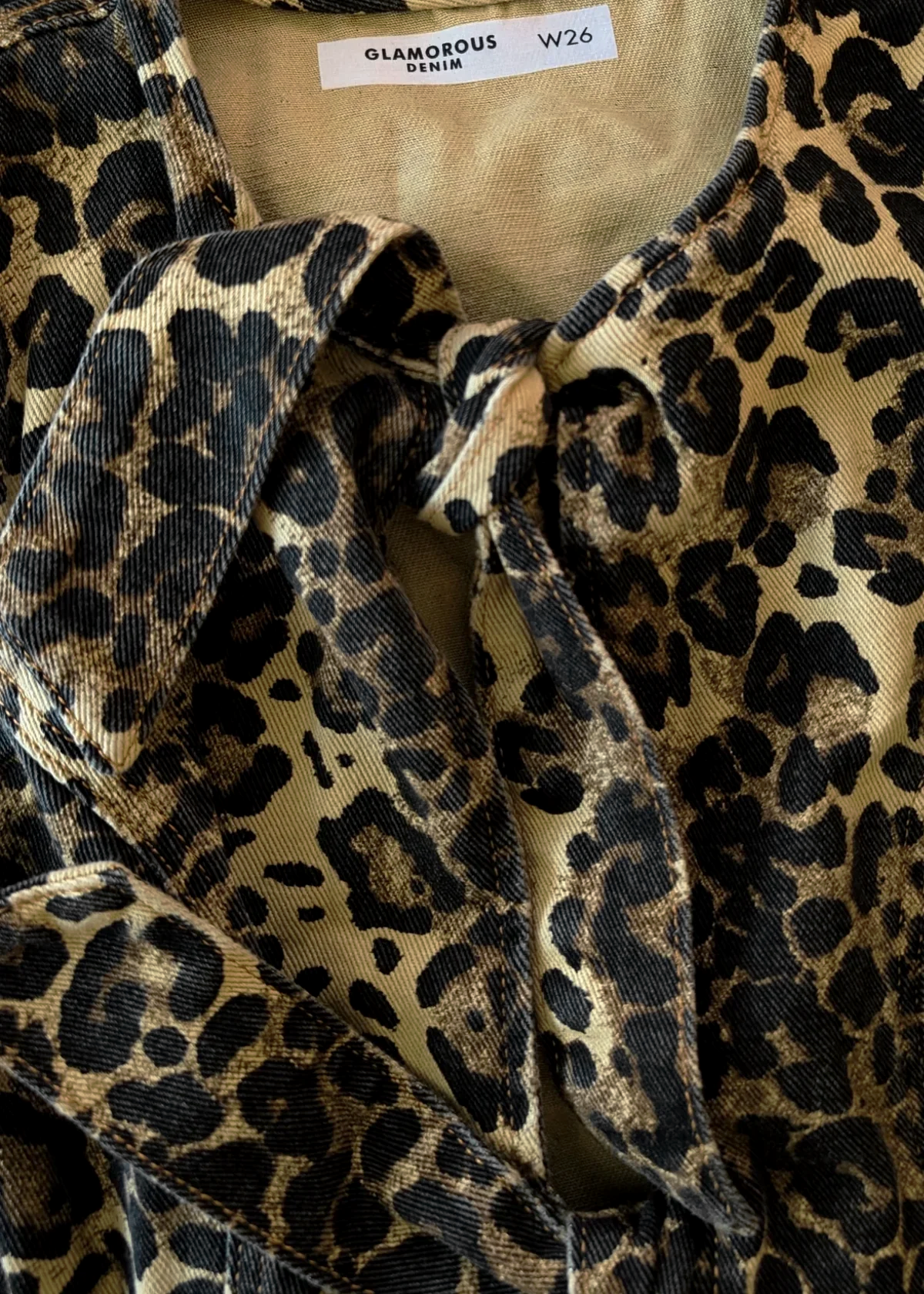 Super cute cotton denim sleeveless vest with two oversized adjustable ties at front. Leopard print design and seamed detailing down the front and back. Dijon mustard colorway with brown and black.