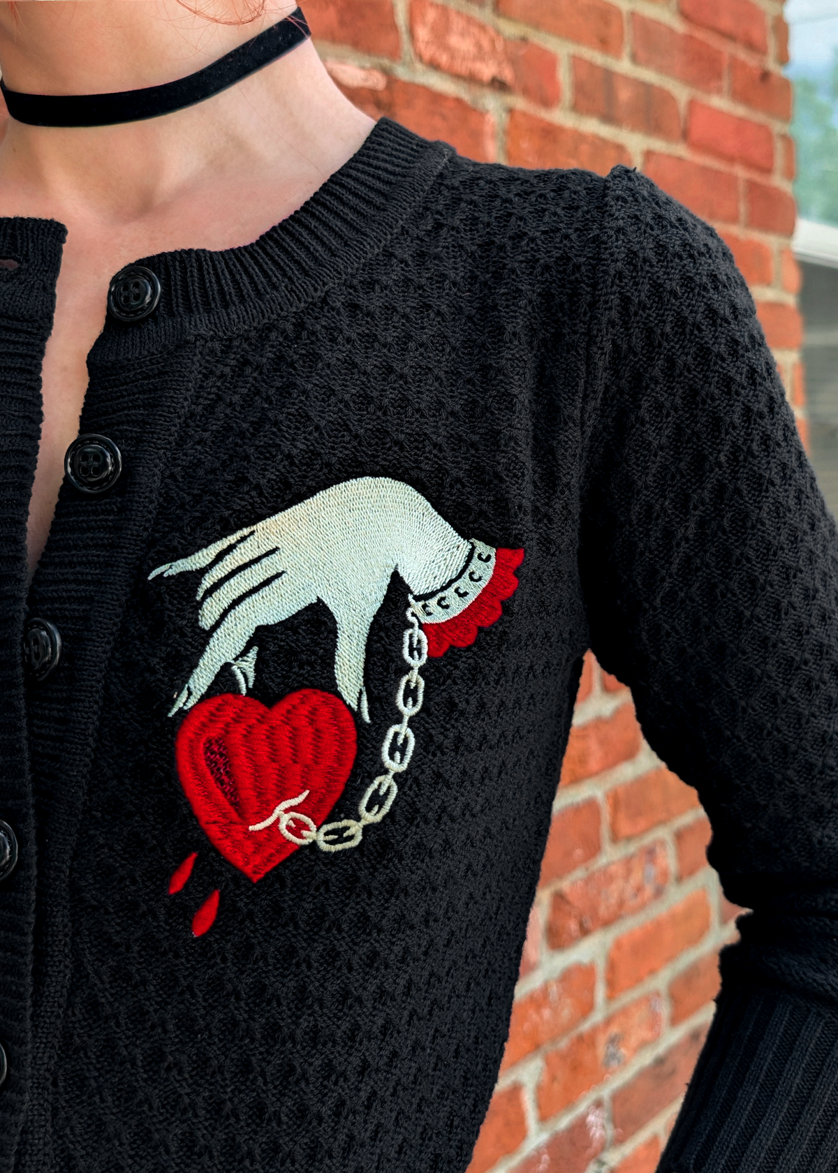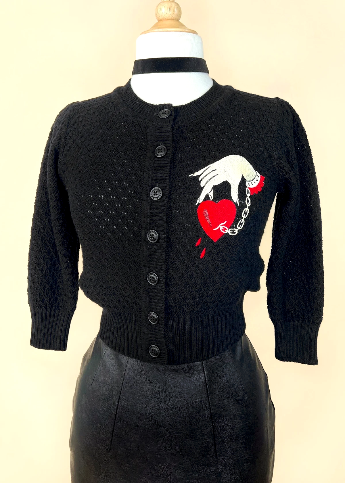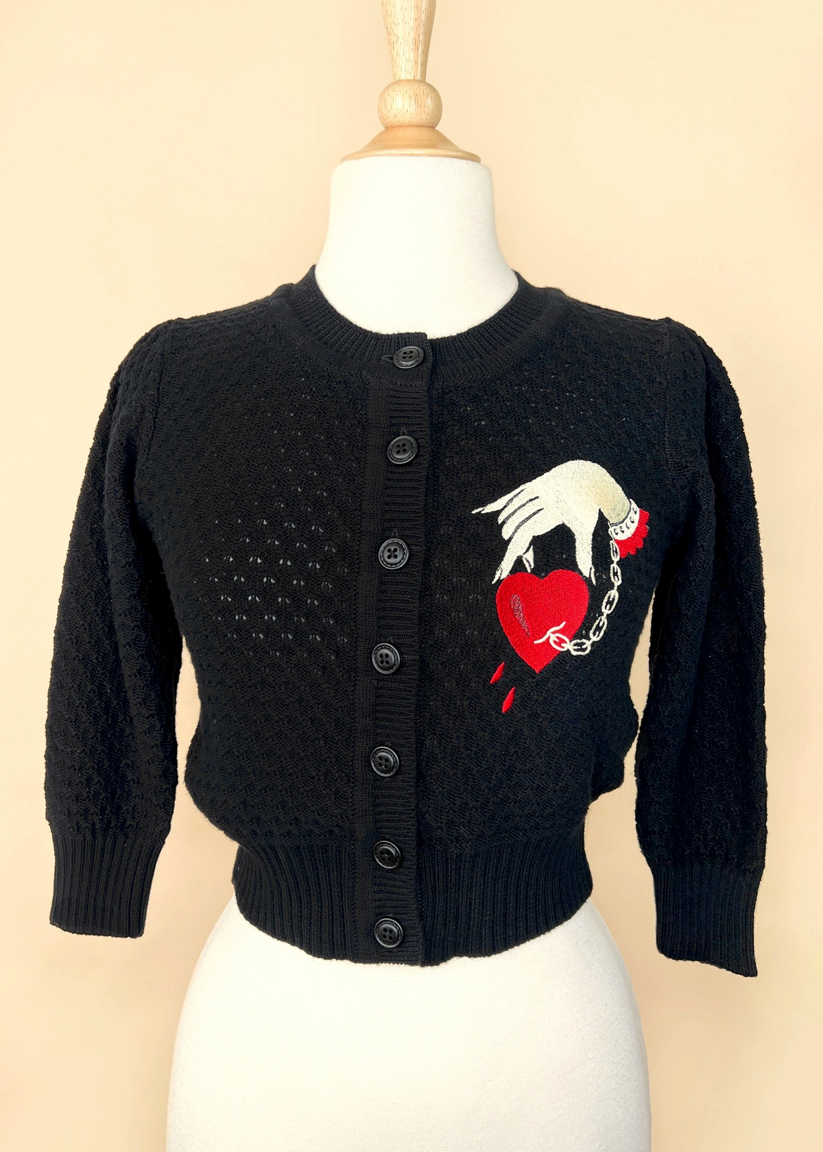 Vintage-inspired fitted knit cardigan with a cropped fit and 3/4 length sleeves. Features a ribbed crew neckline and button down front. Ribbed cuffs and hem. Black colorway with red and yellowy-ivory "Captive Heart" embroidery at front side. Lightweight.