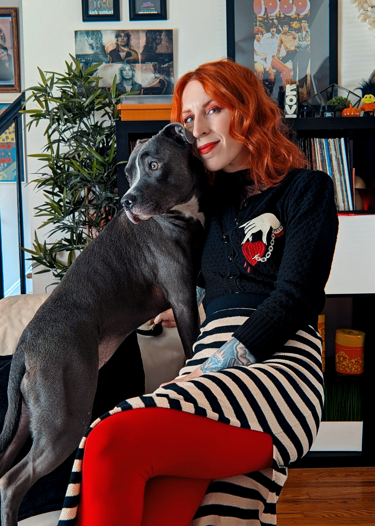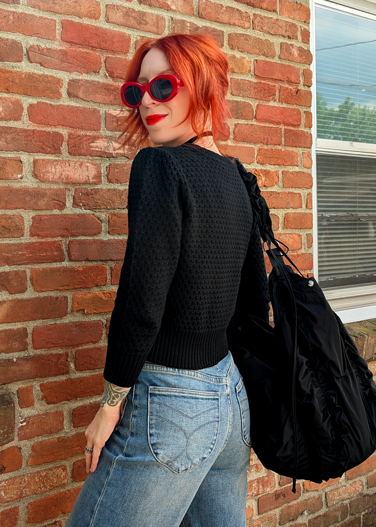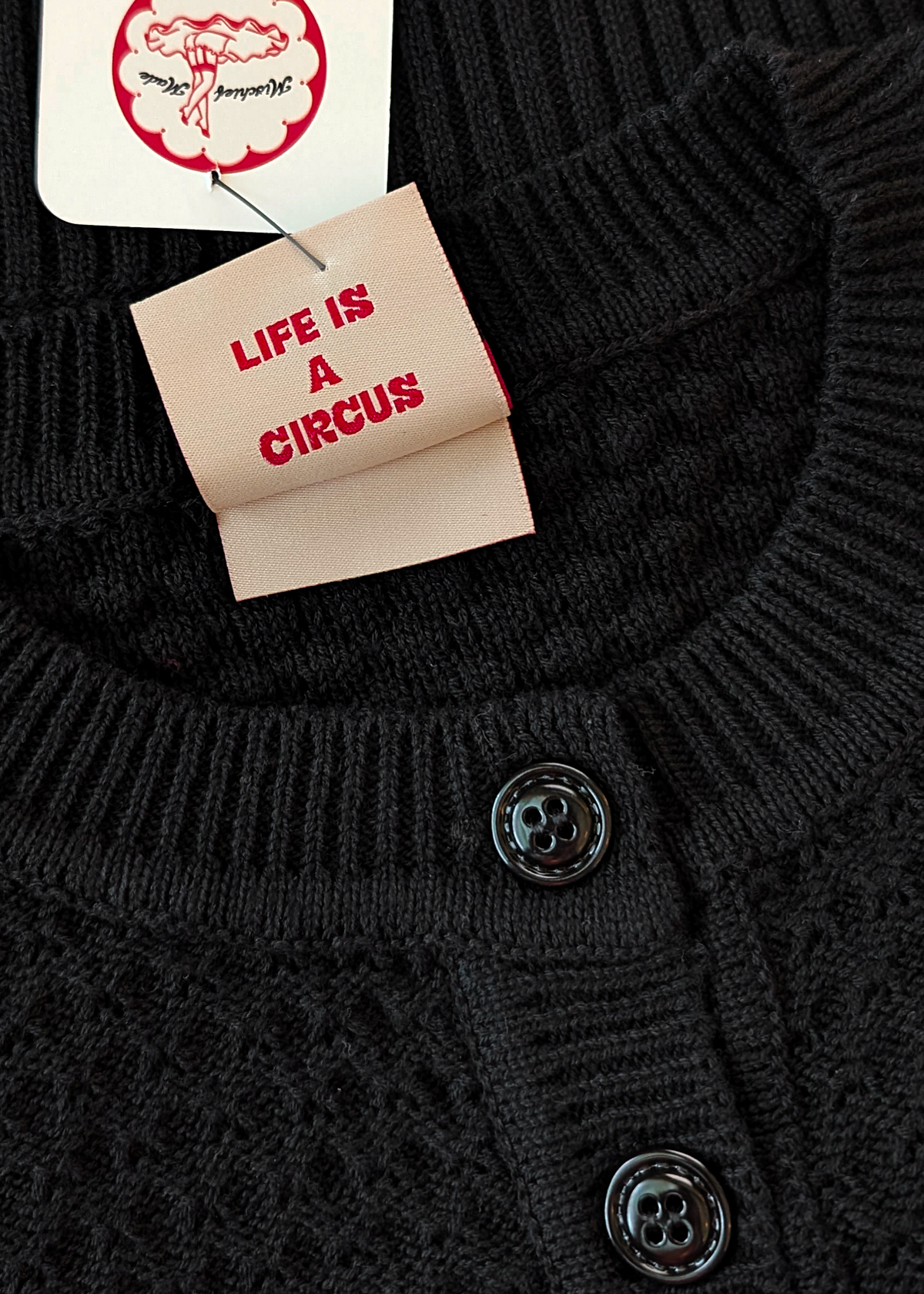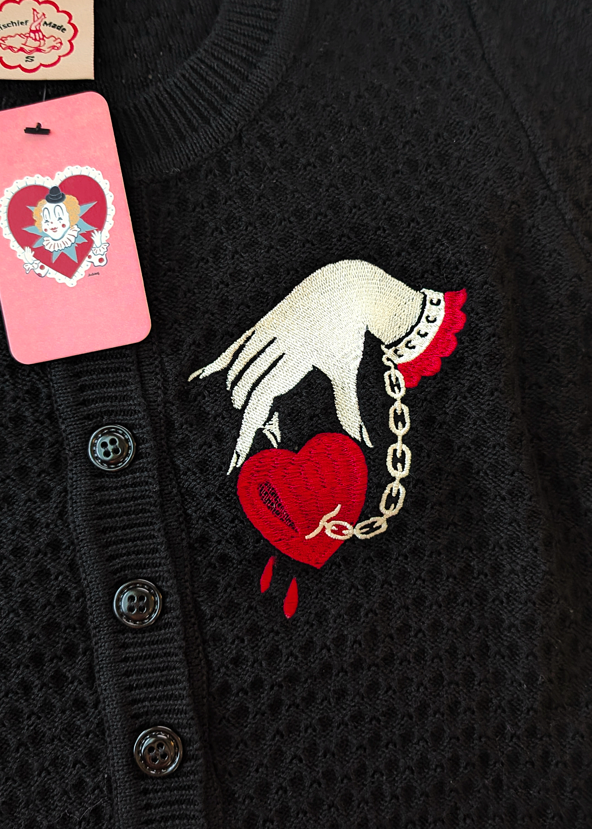 Vintage-inspired fitted knit cardigan with a cropped fit and 3/4 length sleeves. Features a ribbed crew neckline and button down front. Ribbed cuffs and hem. Black colorway with red and yellowy-ivory "Captive Heart" embroidery at front side. Lightweight.