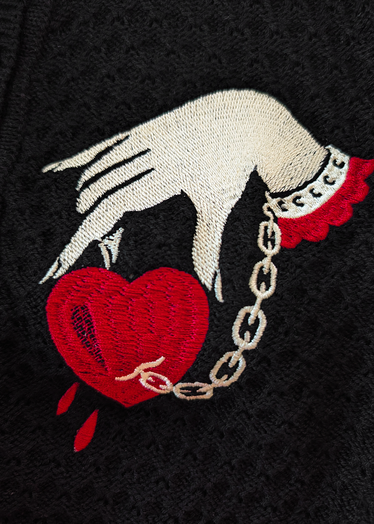 - Red and yellowy-ivory "Captive Heart" embroidery at front side