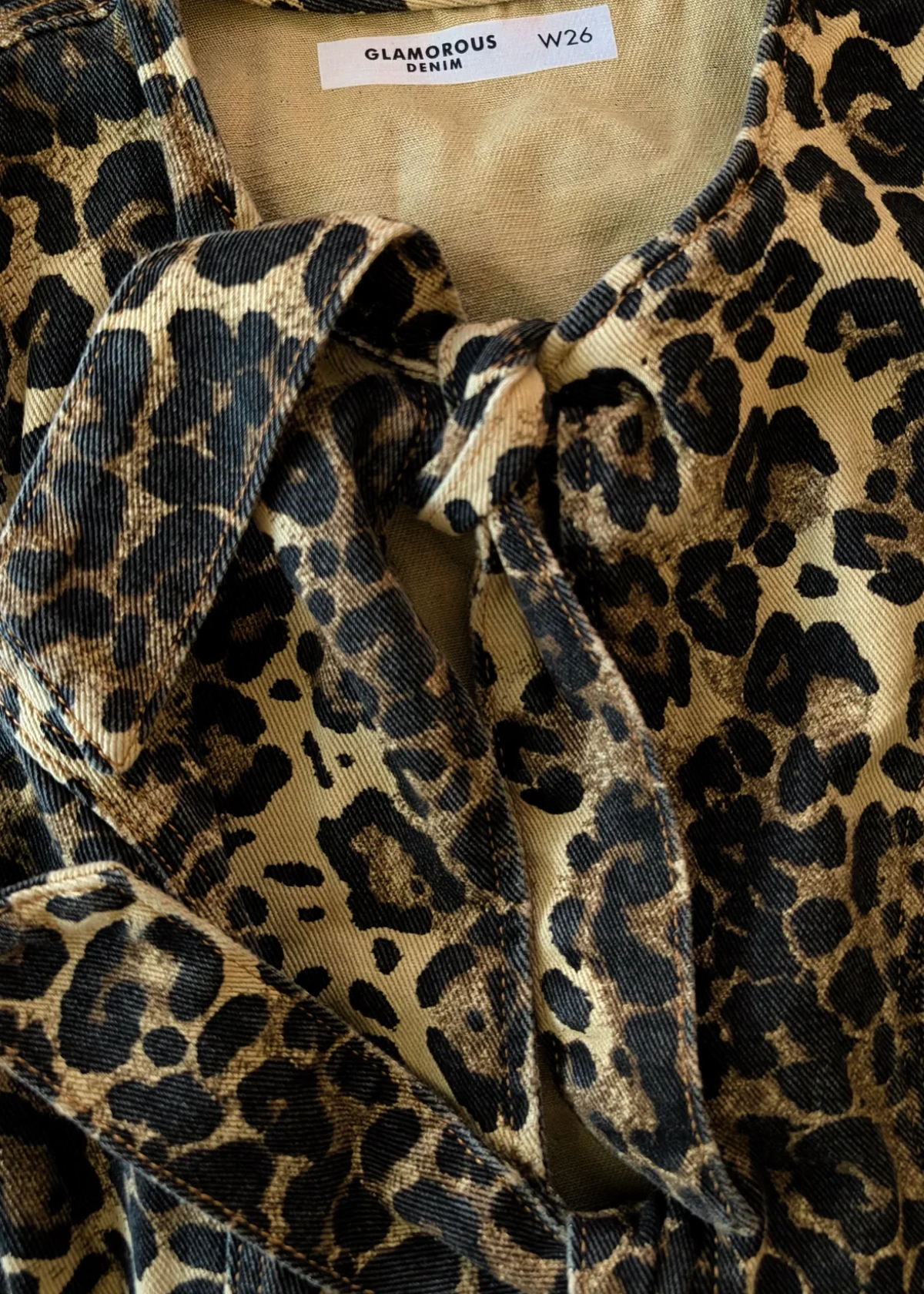 Super cute cotton denim sleeveless vest with two oversized adjustable ties at front. Leopard print design and seamed detailing down the front and back. Dijon mustard colorway with brown and black.