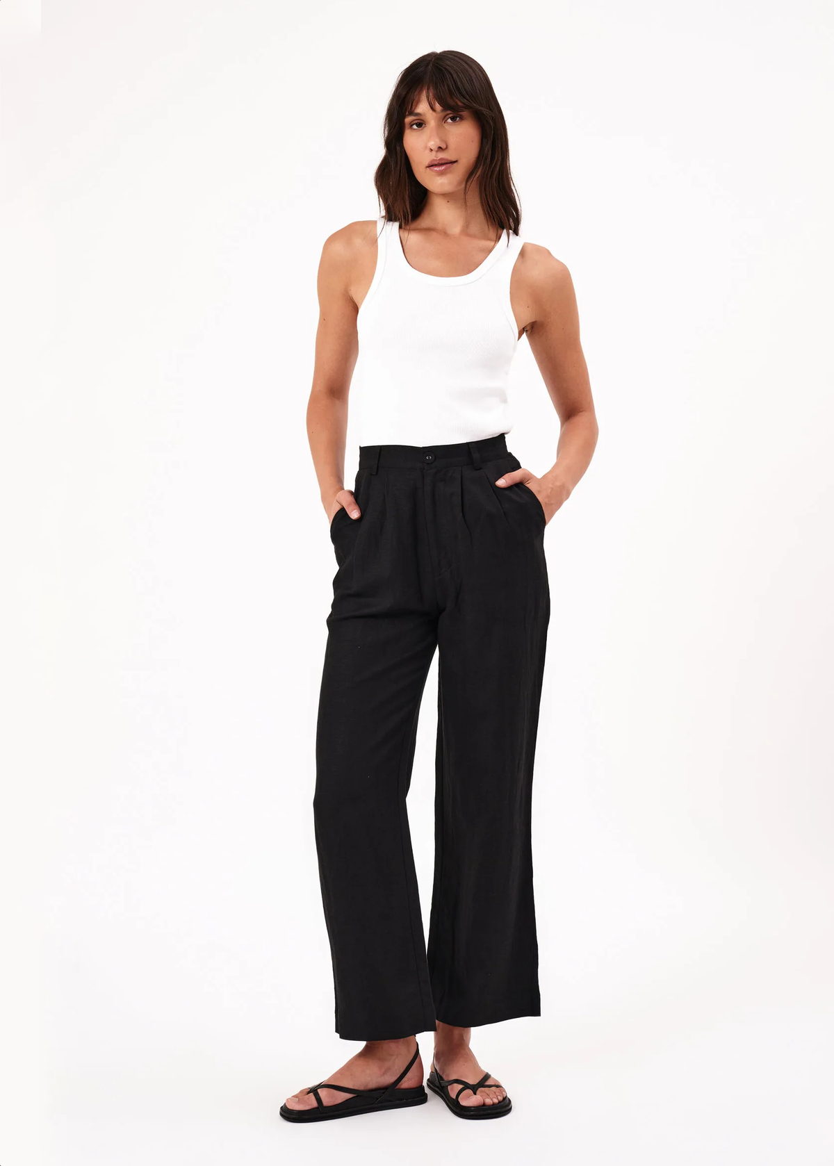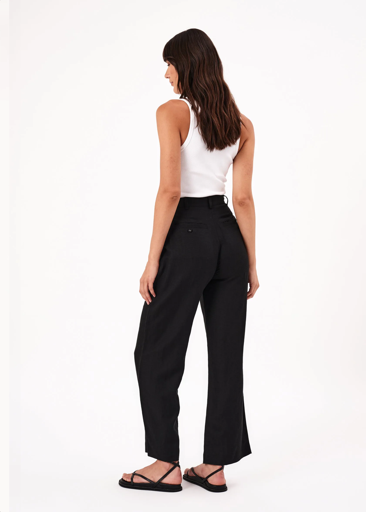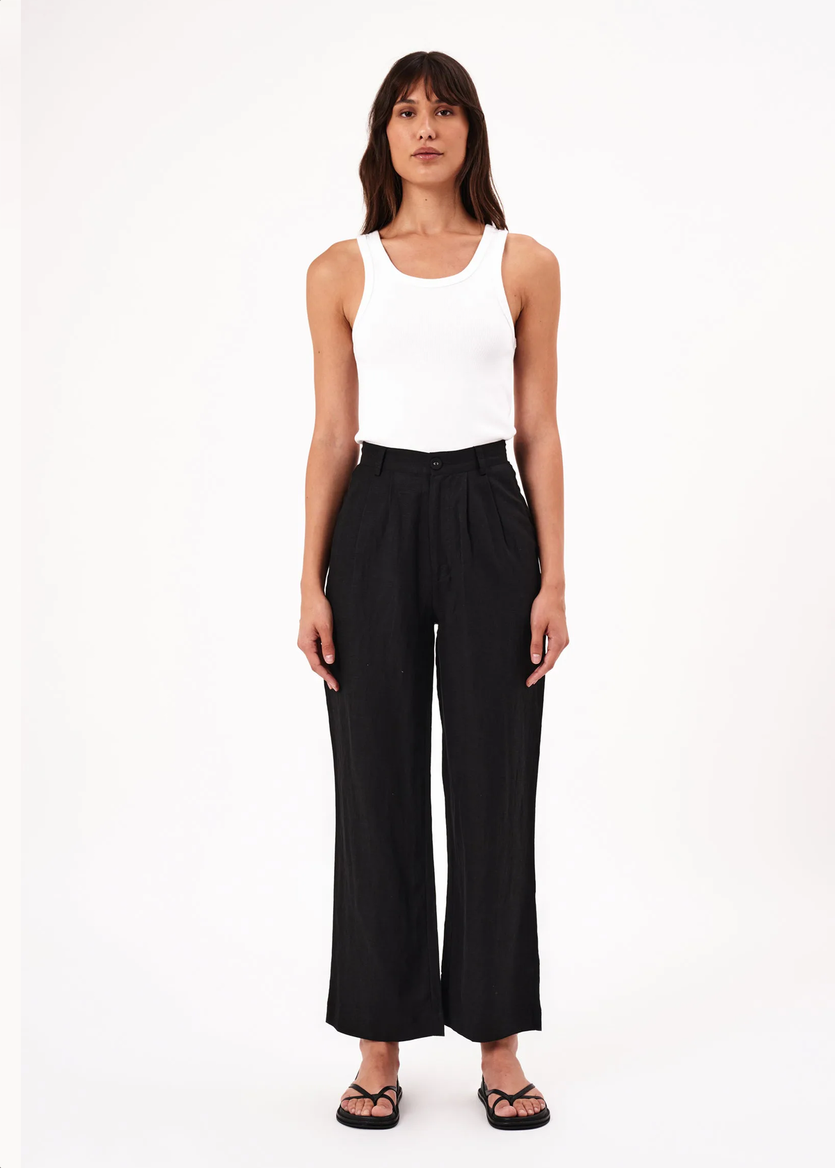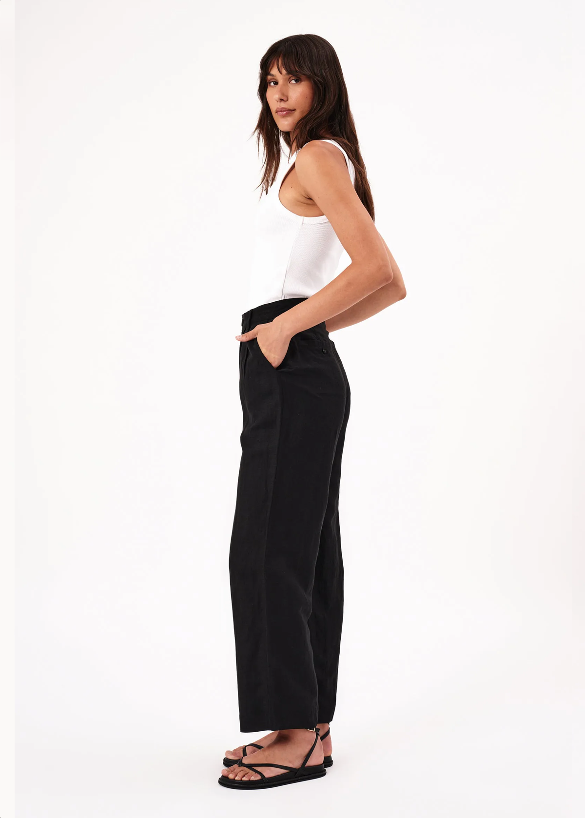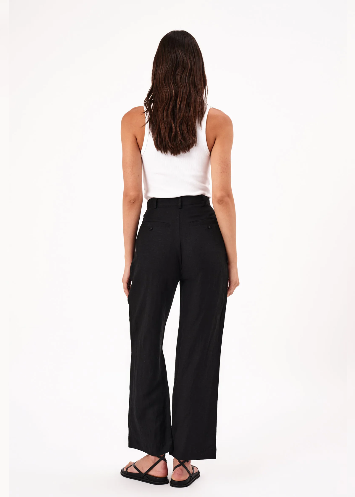 '80s-inspired black pants made of a soft, lightweight linen blend that's perfect for all-season! Ultra high waist and pleated front. Fitted through waist, then goes into a relaxed, wide fit through the hip, thigh, and leg with an ankle length 27.5" - 28" inseam. Slit pockets at sides and slit pockets at back with button closures. Unlined. No stretch but linen does have some give with wear!