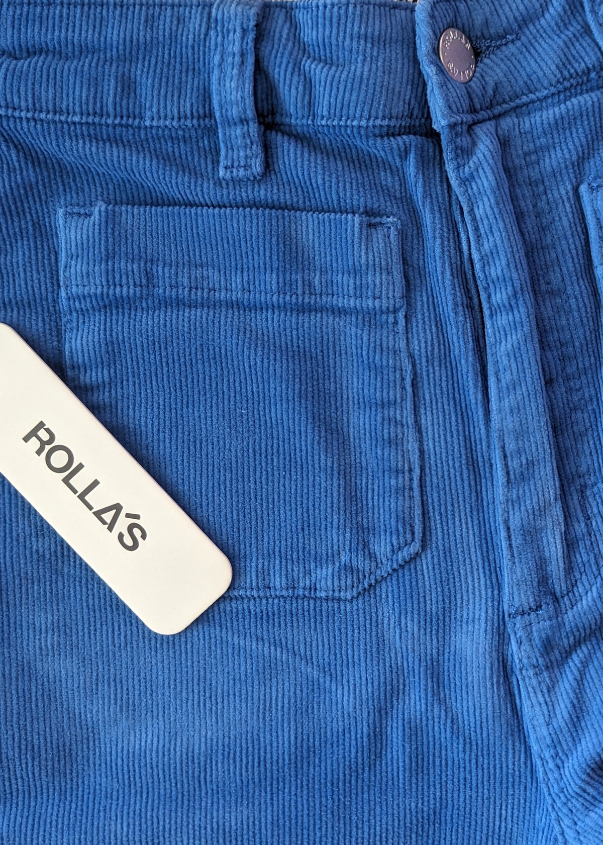 Super groovy corduroy pants in Rolla's classic sailor fit. Features an ultra high fitted waist and wide sailor flare leg in an ankle length with approx. a 27" inseam. Velvety soft and stretchy thin wale corduroy in cobalt blue. Designed to be worn tight and will soften with wear.