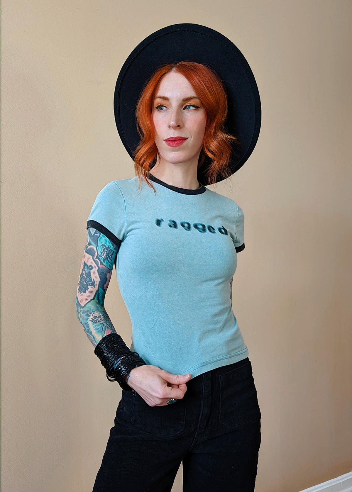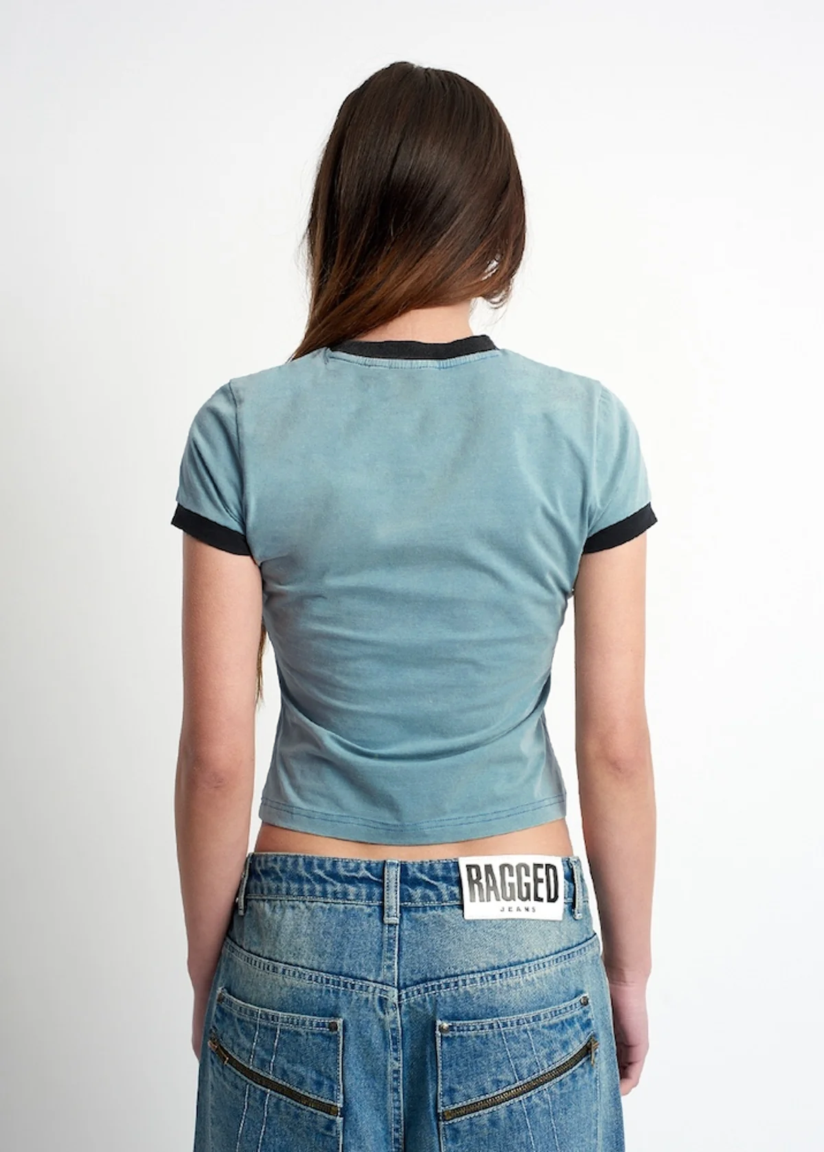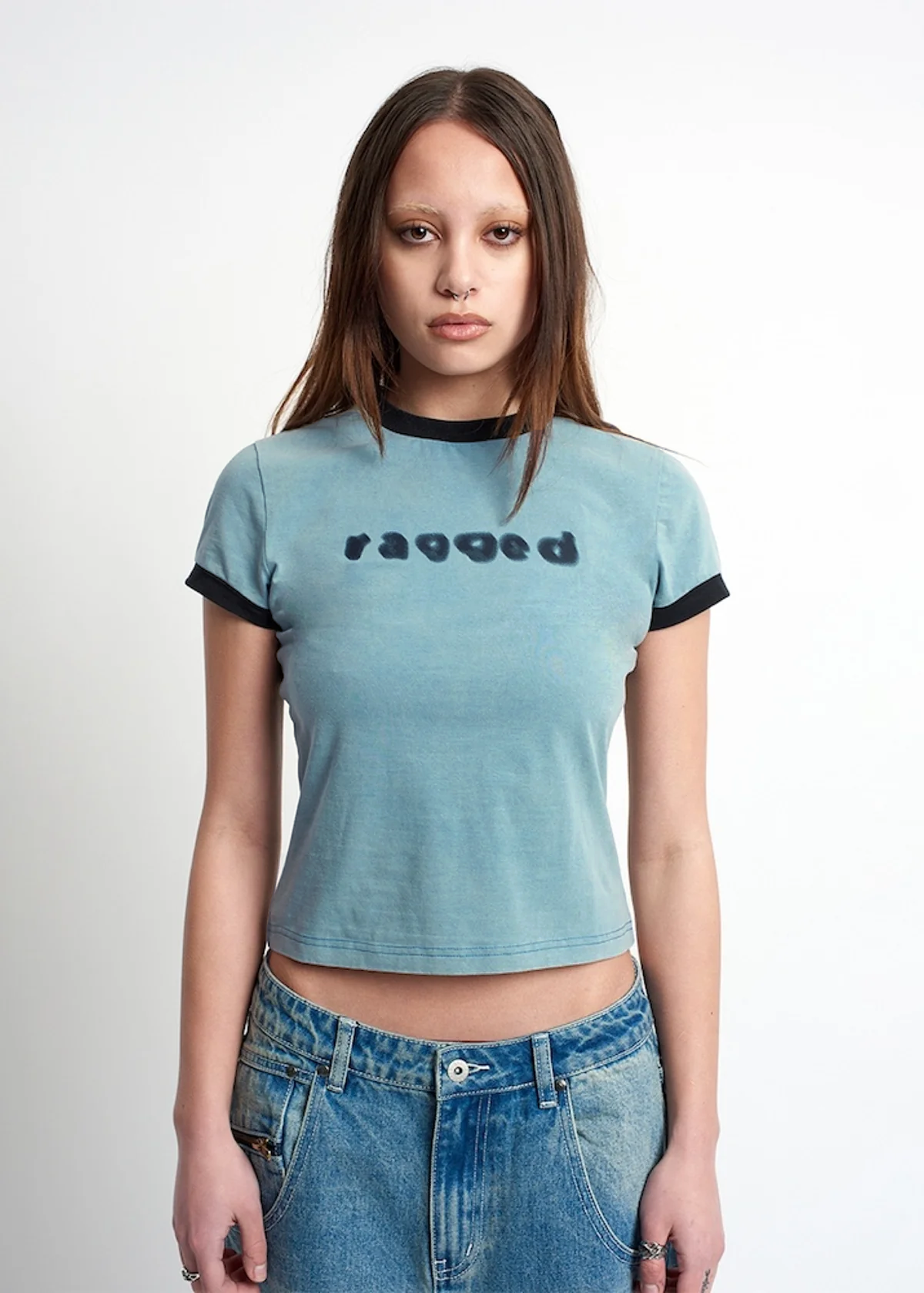 '90s inspired baby ringer tee featuring a crew neckline, slim fit and blurred "ragged" graphics at front. Mineral wash blue colorway with faded, washed black trim.