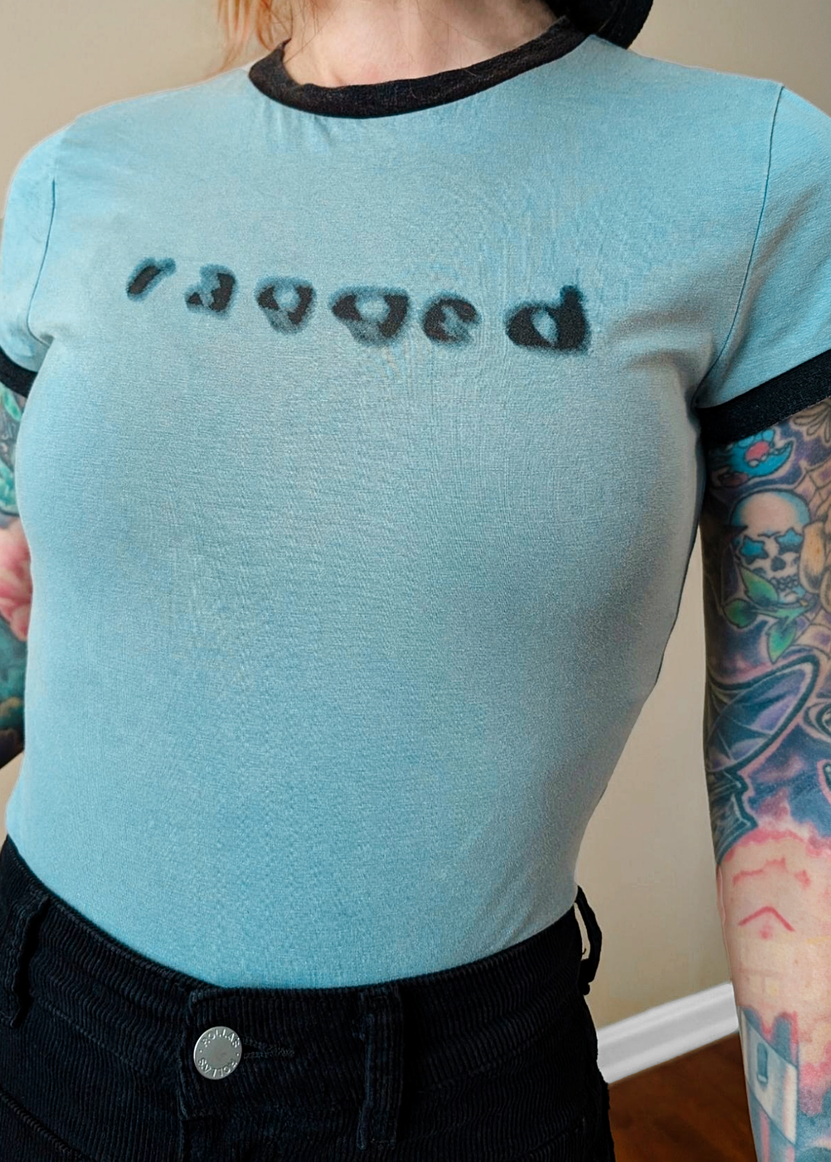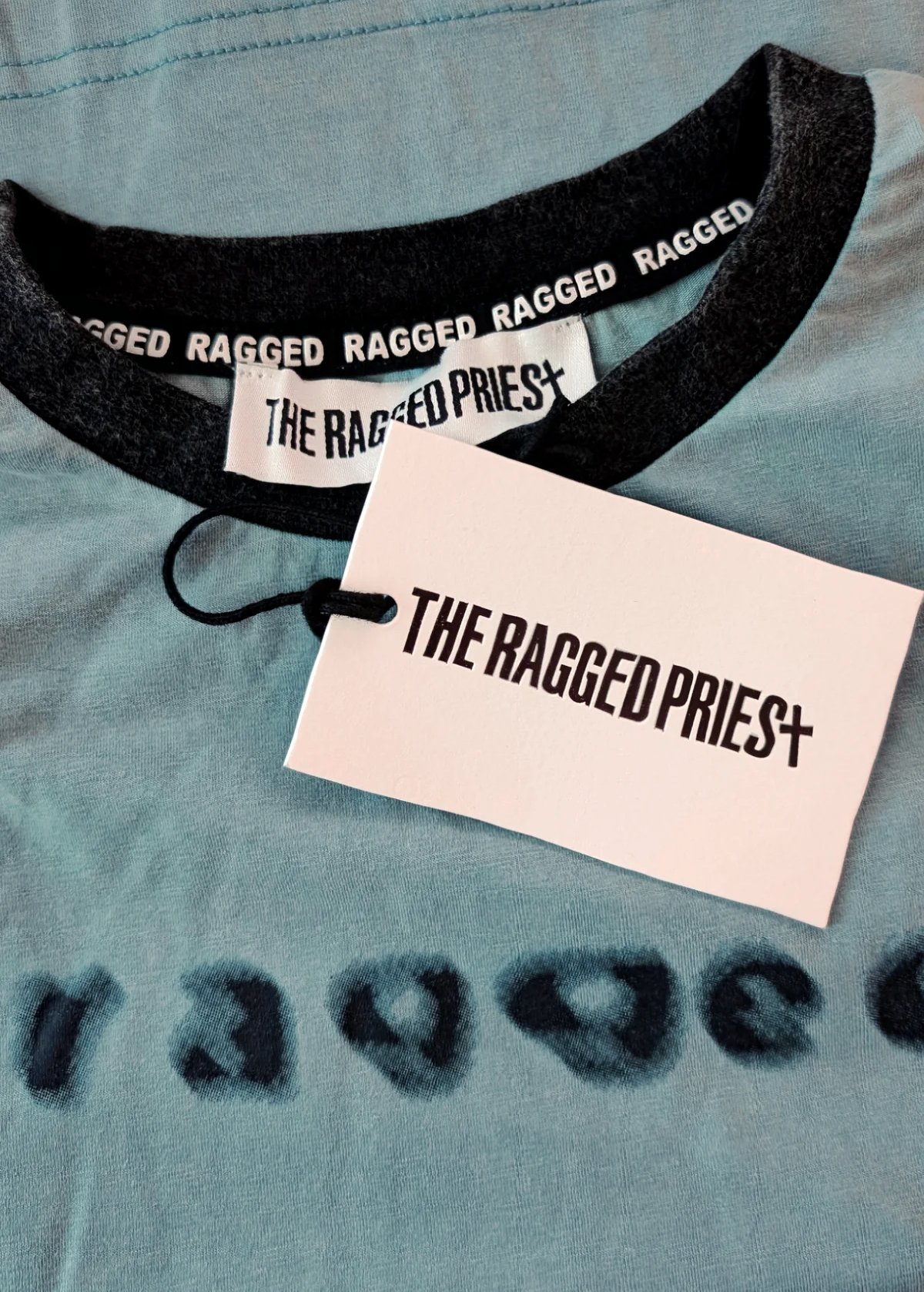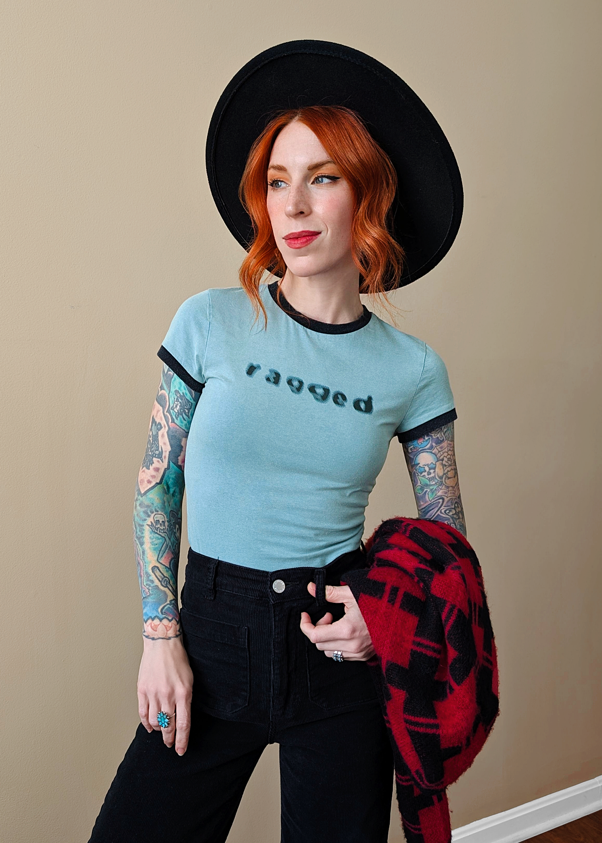 '90s inspired baby ringer tee featuring a crew neckline, slim fit and blurred "ragged" graphics at front. Mineral wash blue colorway with faded, washed black trim.