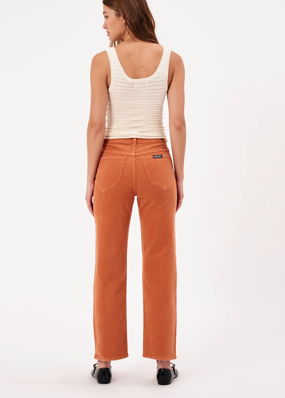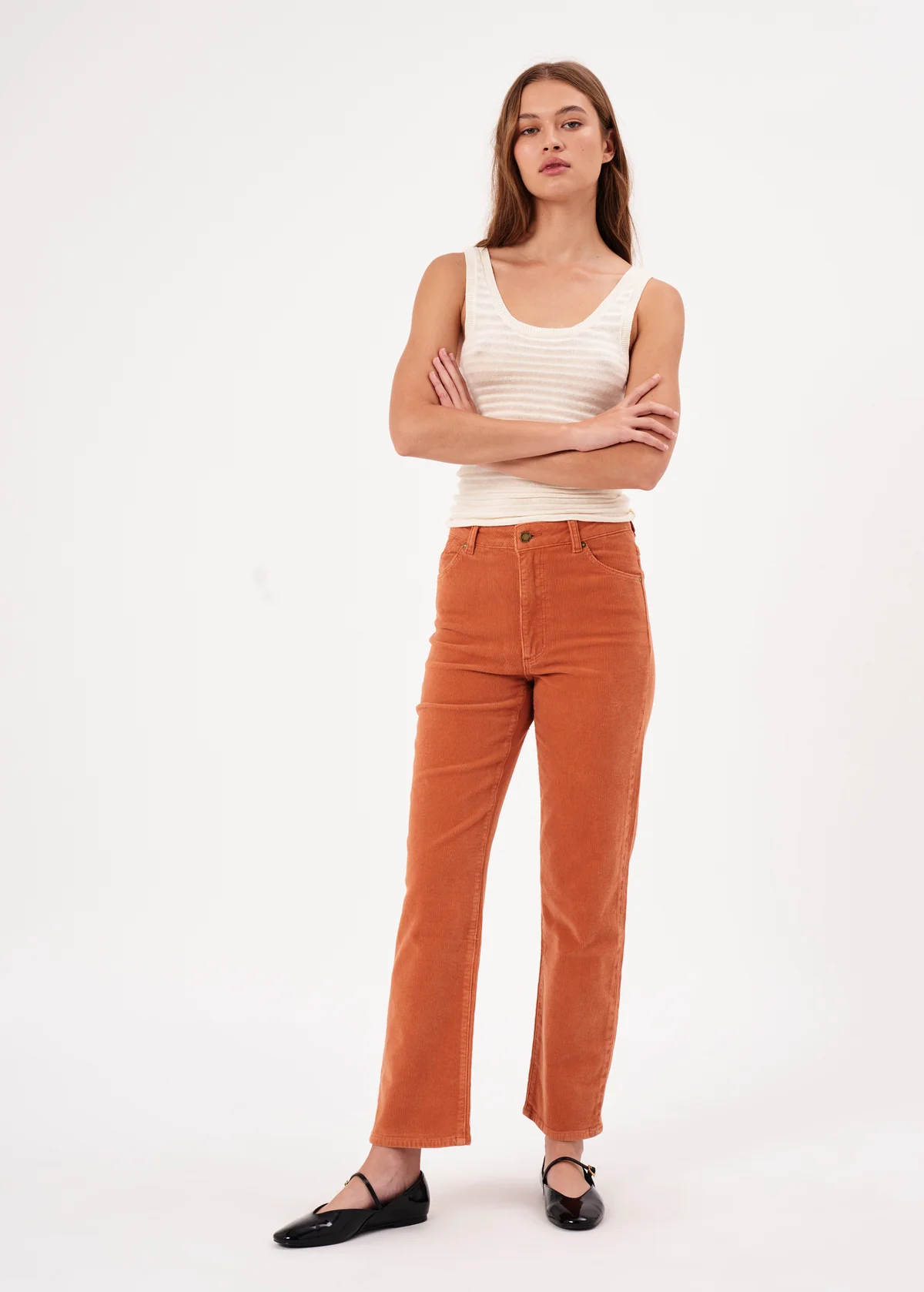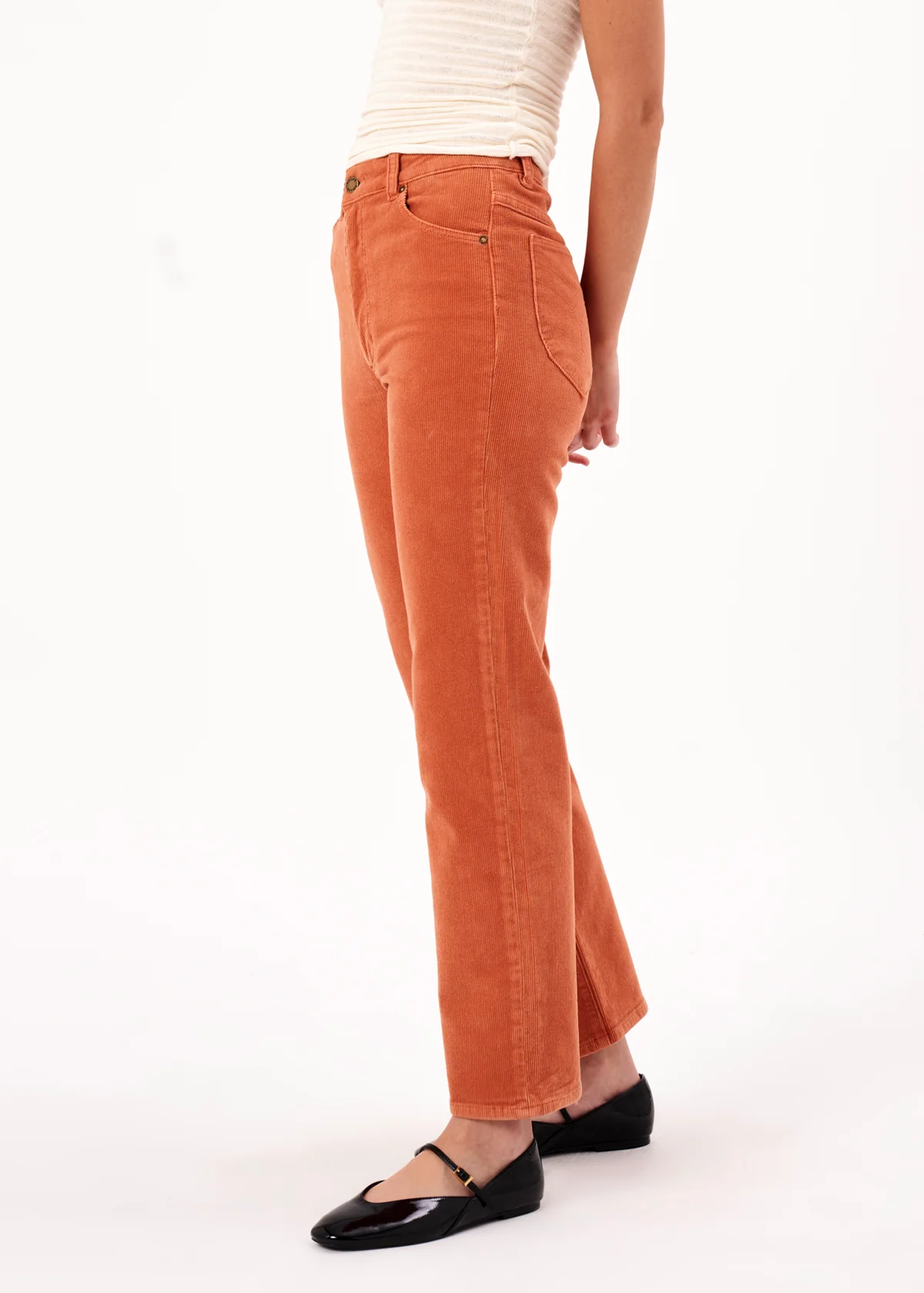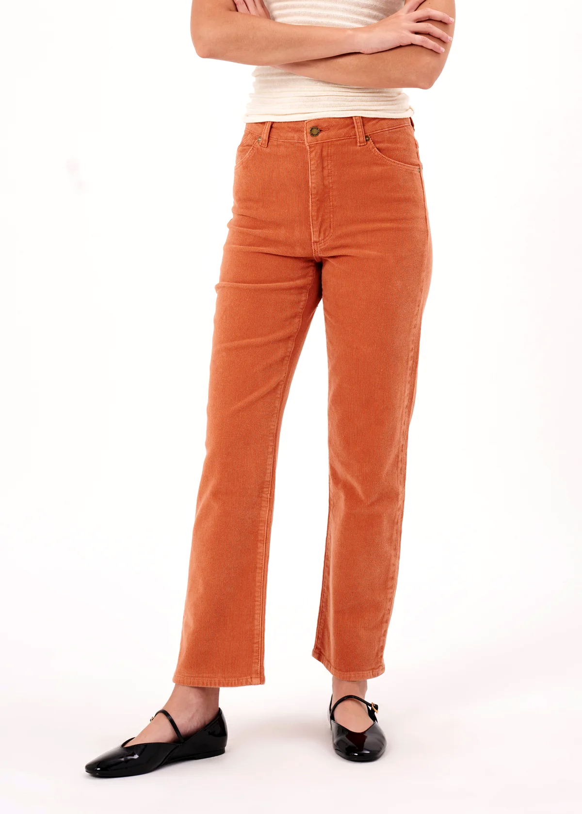 Cool and classic straight leg corduroys with a high rise waist and an ankle length 28" inseam. Made of a velvety soft corduroy with a hint of stretch for comfort. Specially angled and shaped pockets in the back for a truly peachy looking butt. Pumpkin rust orange colorway - it reminds us of pumpkin ice cream!