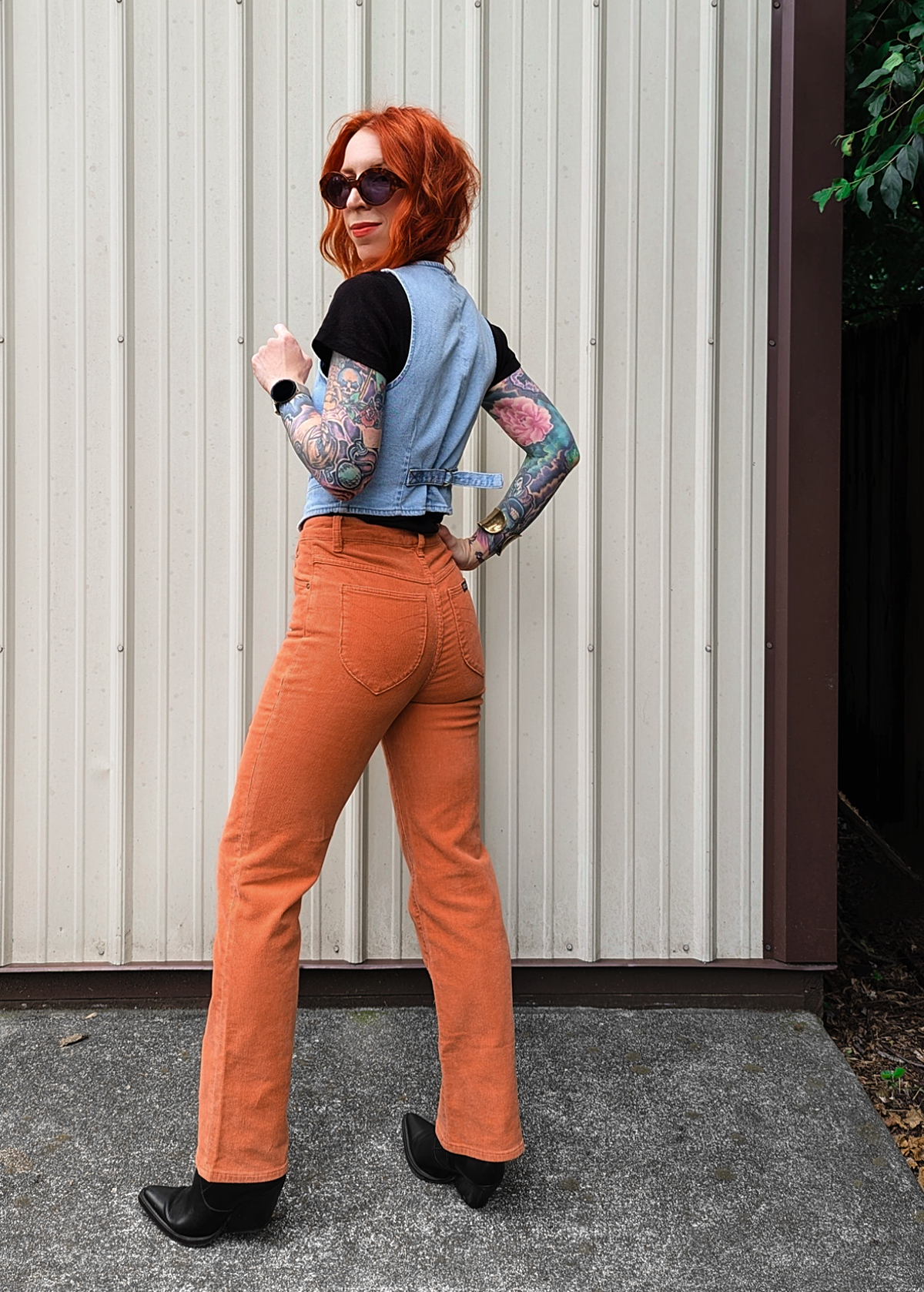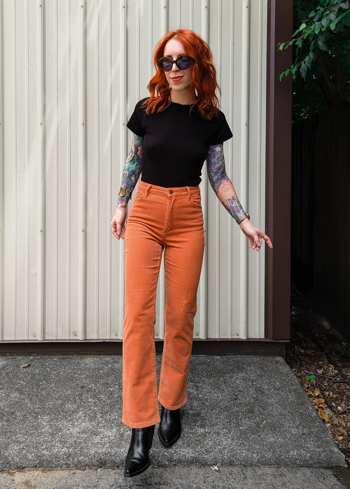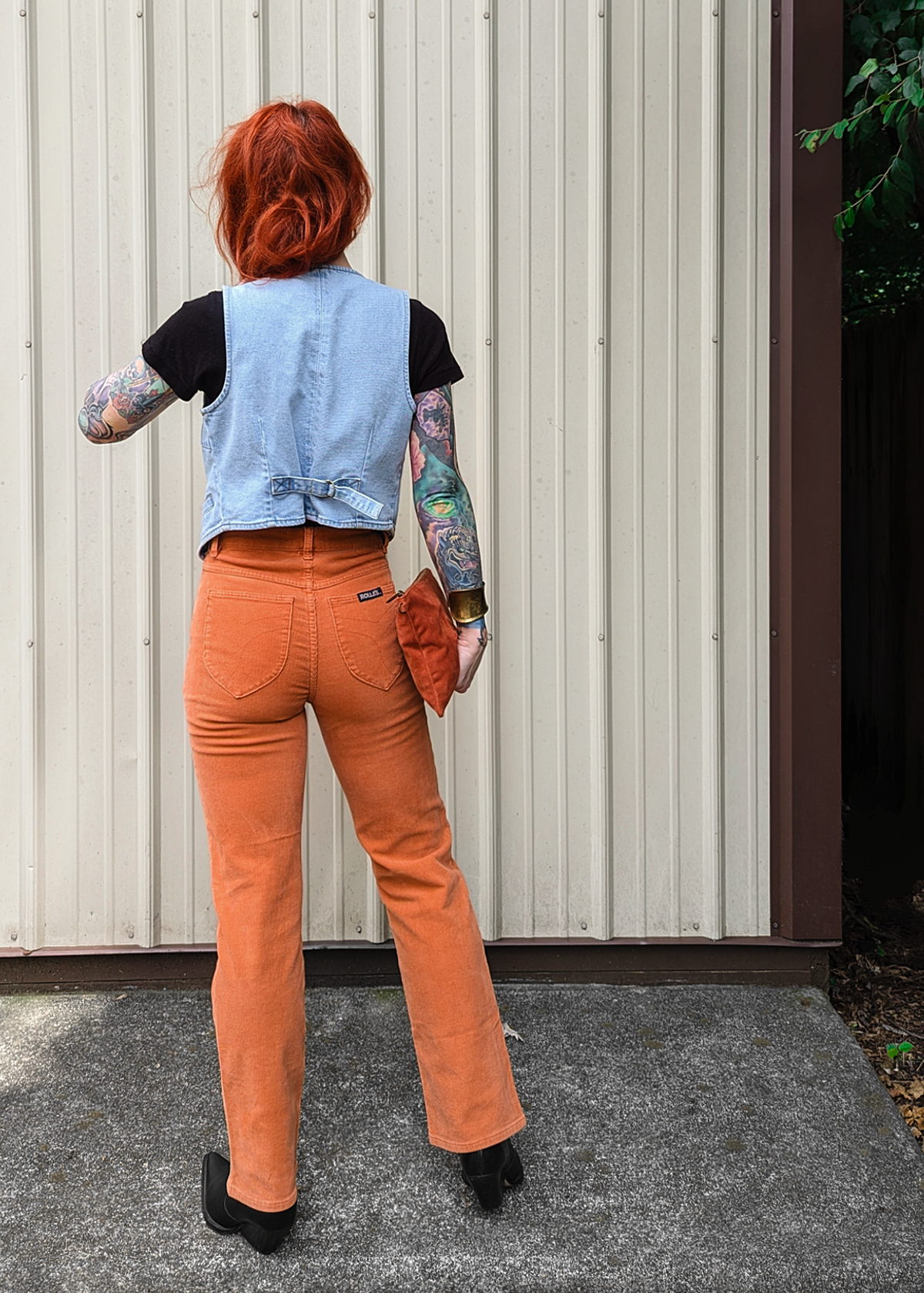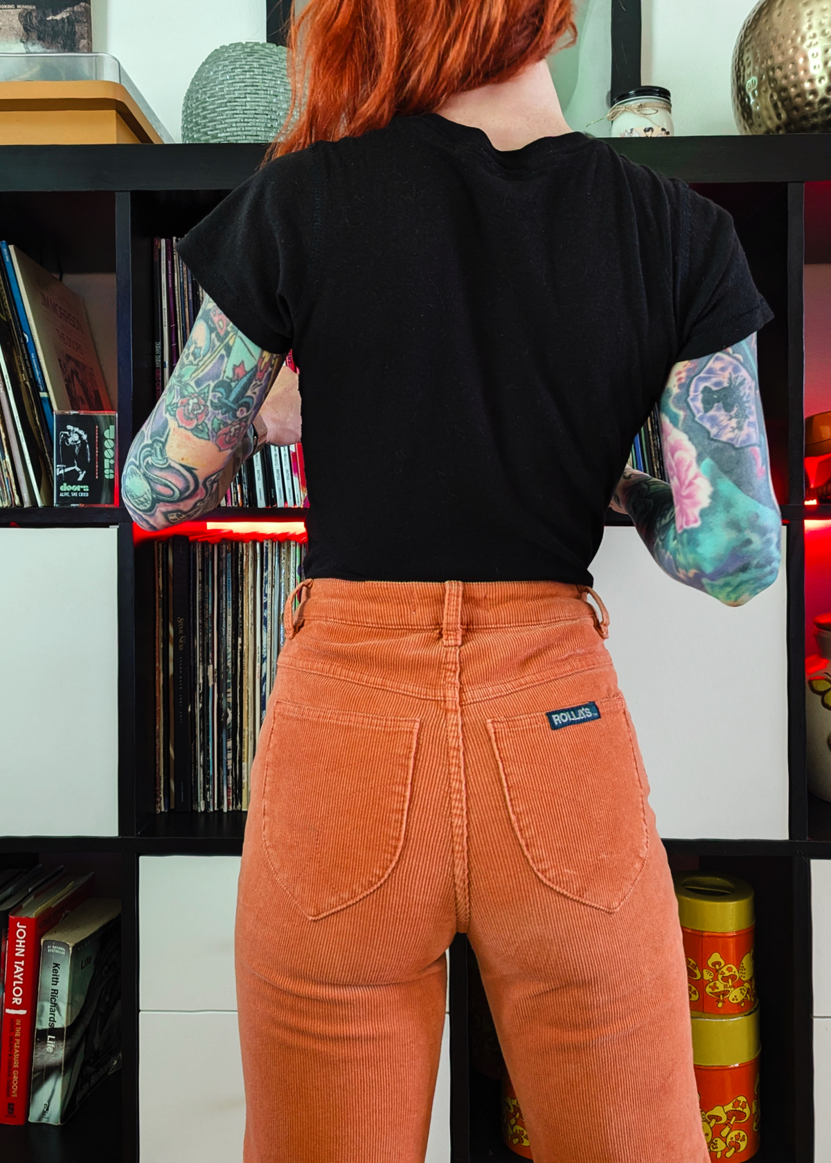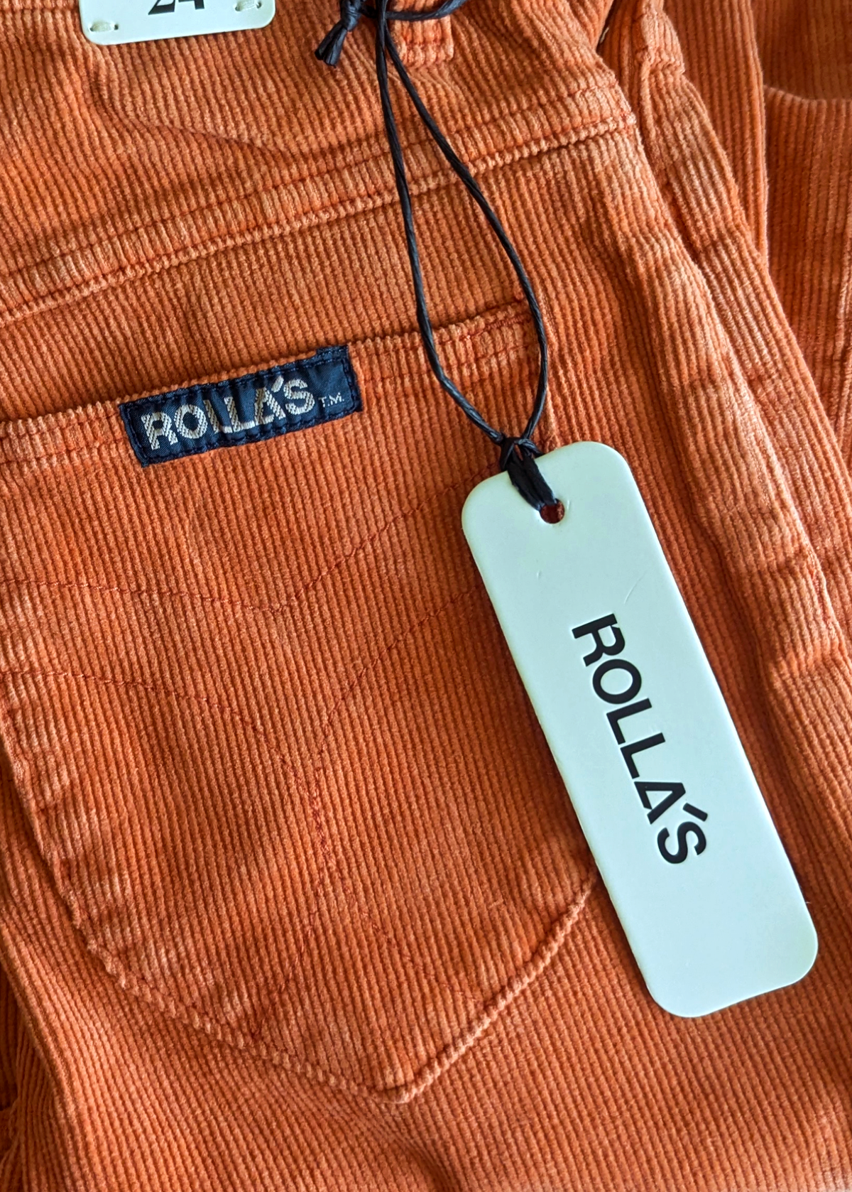 Cool and classic straight leg corduroys with a high rise waist and an ankle length 28" inseam. Made of a velvety soft corduroy with a hint of stretch for comfort. Specially angled and shaped pockets in the back for a truly peachy looking butt. Pumpkin rust orange colorway - it reminds us of pumpkin ice cream!