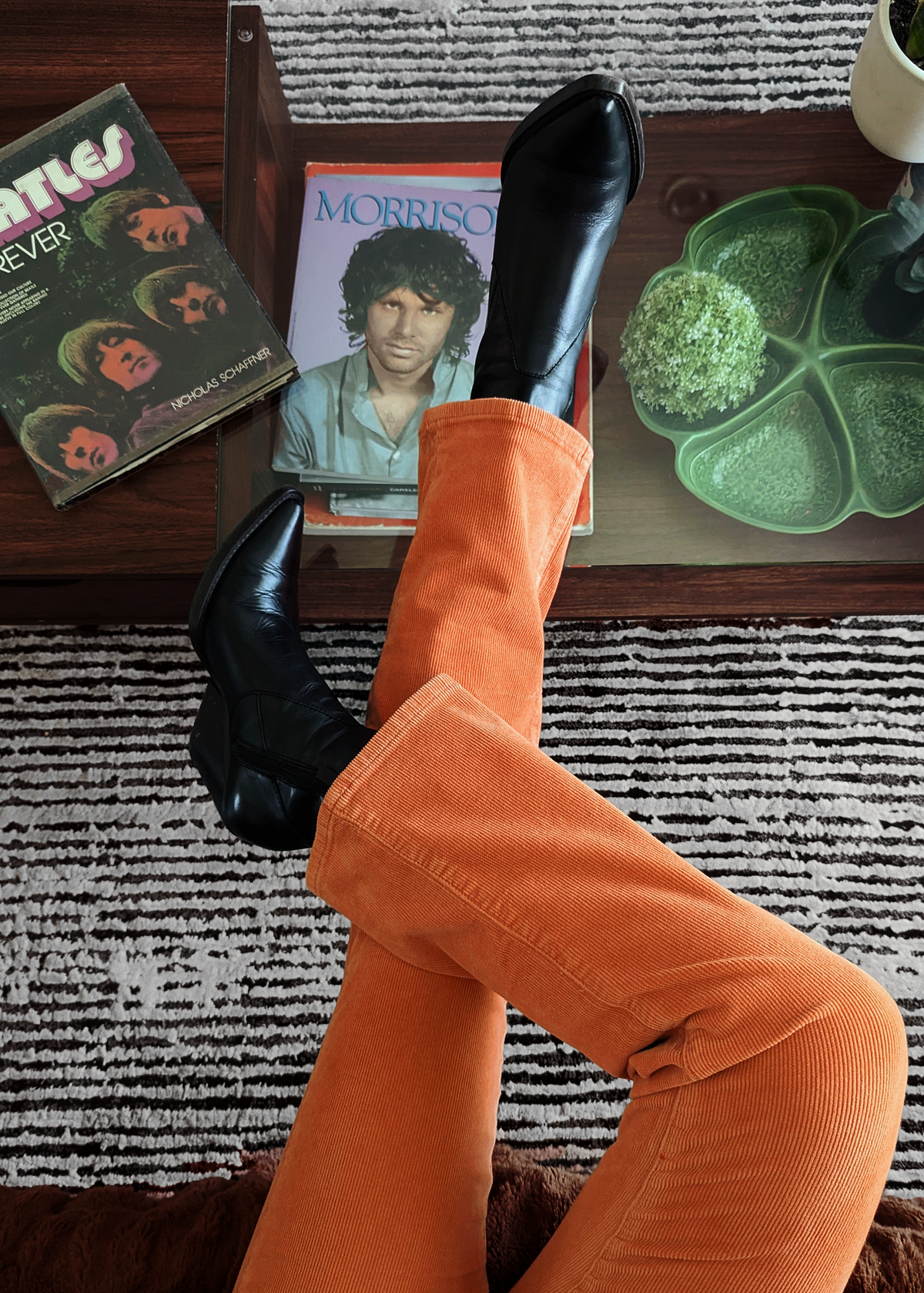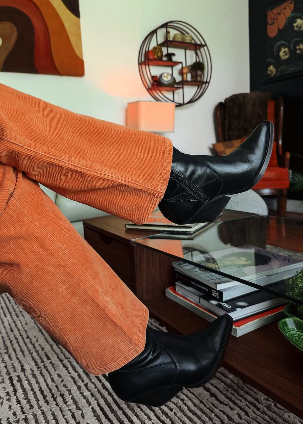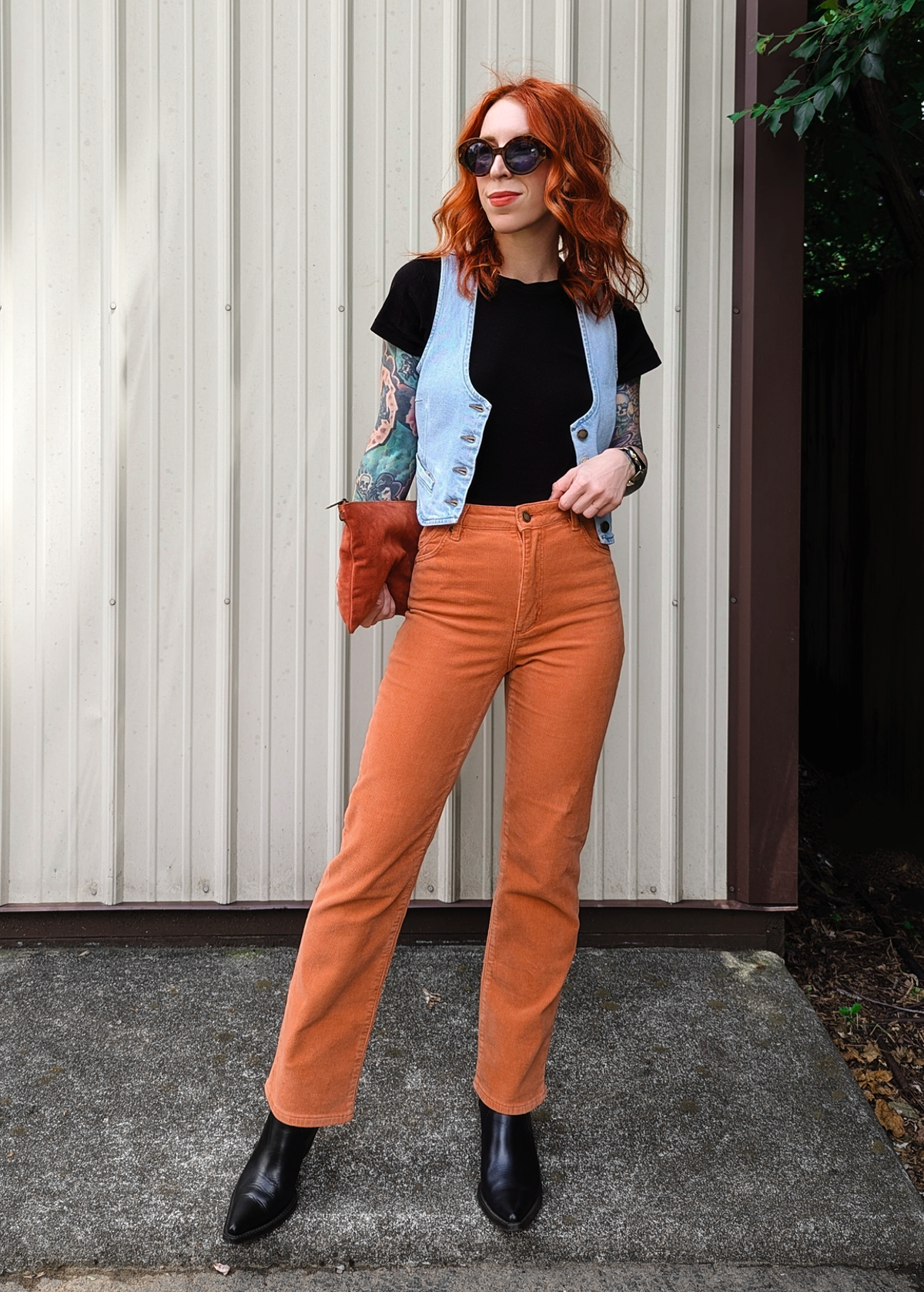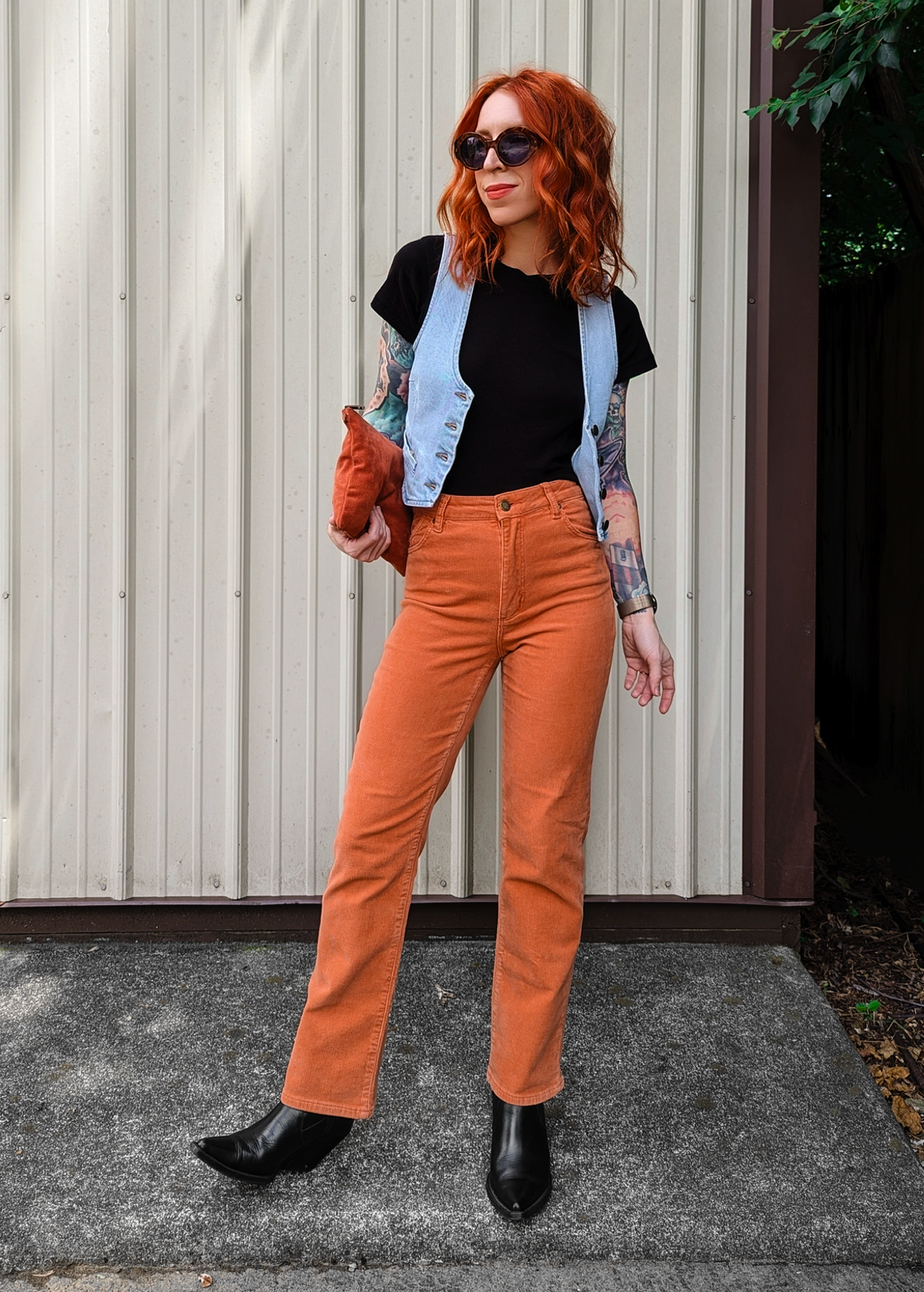 Cool and classic straight leg corduroys with a high rise waist and an ankle length 28" inseam. Made of a velvety soft corduroy with a hint of stretch for comfort. Specially angled and shaped pockets in the back for a truly peachy looking butt. Pumpkin rust orange colorway - it reminds us of pumpkin ice cream!