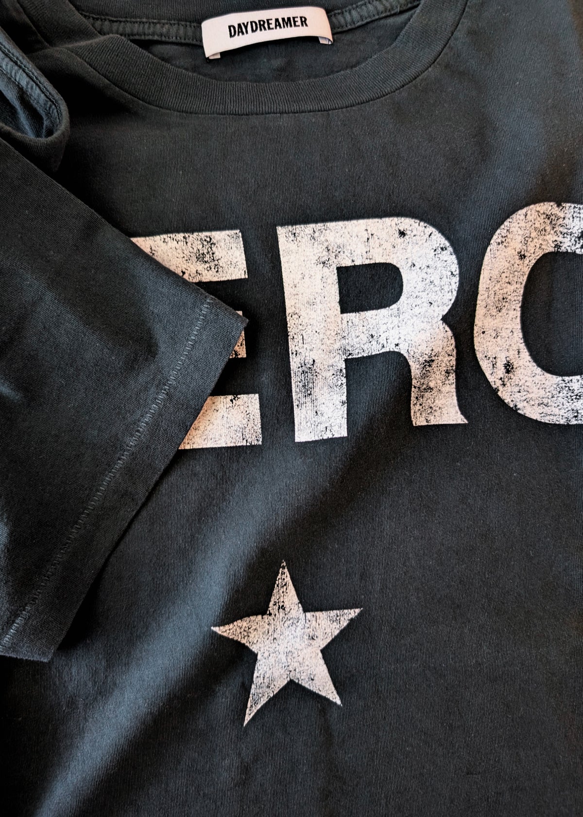 Super soft with a look and feel like you picked it up at the merch table in '95. This tee is Daydreamer's signature Merch tee style: intentionally oversized and meant to fit like that perfect vintage find with a perfect drape and single stitch hems. Vintage black colorway.